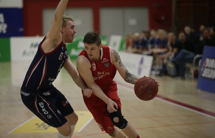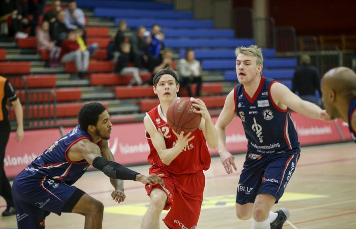 Haukar eru enn á lífi í úrslitakeppni Domino's deildar karla í körfubolta eftir 12 stiga sigur, 100-88, á Keflavík í þriðja leik liðanna í átta-liða úrslitunum á Ásvöllum í kvöld. Sigur heimamanna var sanngjarn en þeir voru sterkari aðilinn nær allan leikinn, ef frá eru taldar lokamínútur fyrri hálfleiks og upphafsmínútur þess seinni. Haukarnir voru örlítið hikandi í byrjun leiks og Keflvíkingar komust í 3-8 eftir þriggja mínútna leik. En þá fór Haukasóknin í gang svo um munaði. Boltinn gekk vel hjá heimamönnum sem voru duglegir að finna Alex Francis sem skoraði 10 stig í 1. leikhluta. Haukur Óskarsson, sem átti erfitt uppdráttar í fyrstu tveimur leikjunum, fann sig einnig vel og skoraði 10 stig í fyrri hálfleik. Haukar leiddu með 10 stigum, 30-20, að loknum 1. leikhluta og voru með myndarlega forystu bróðurpartinn af 2. leikhluta. Keflvíkingar voru samt alltaf inn í leiknum, þökk sé sóknarfráköstum (níu í fyrri hálfleik) og flottu framlagi frá gömlu mönnunum, Damon Johnson og Gunnari Einarssyni, sem skoruðu 12 og níu stig í fyrri hálfleik. Þegar tvær og hálf mínútur voru eftir af 2. leikhluta voru Haukar 12 stigum yfir, 47-35. Þeir gerðust hins vegar kærulausir í vörninni, brutu klaufalega af sér og sendu leikmenn Keflavíkur ítrekað á vítalínuna. Gestirnir skoruðu 10 síðustu stig fyrri hálfleik, þar af komu sex af vítalínunni. Francis var stigahæstur Hauka í hálfleik með 12 stig en hann hafði hægt um sig í 2. leikhluta þar sem hann skoraði aðeins tvö stig. Haukur kom næstur með 10 stig. Damon og Gunnar voru atkvæðamestir hjá gestunum, auk þess sem Davon Usher fór í gang undir lok hálfleiksins. Keflvíkingar byrjuðu seinni hálfleikinn eins og þeir enduðu þann fyrri. Damon var áfram öflugur inni í teignum og svo fóru þriggja stiga skotin að detta. Arnar Freyr Jónsson kom gestunum yfir, 51-54, með einu slíku, í fyrsta sinn frá því snemma í 1. leikhluta. Haukar svöruðu þessu áhlaupi ágætlega, komust snemma í skotrétt í 3. leikhluta og breyttu stöðunni úr 54-57 í 67-59. Sóknarleikur Keflvíkinga fór versnandi eftir því sem leið á seinni hálfleikinn og Haukarnir náðu aftur góðu forskoti. Um miðjan 4. leikhluta var munurinn 12 stig, 84-72, og það bil náðu gestirnir frá Keflavík ekki að brúa. Keflvíkingar áttu einfaldlega ekki nógu mörg svör við varnarleik Hauka og þá var vörn gestanna of holótt í kvöld gegn góðu liði Hafnfirðinga. Lokatölur 100-88, en liðin mætast í fjórða sinn í Keflavík á mánudaginn kemur. Haukur var stigahæstur í liði Hauka með 23 stig, auk þess sem hann tók sjö fráköst. Francis skilaði einnig flottum tölum; 22 stigum, 13 fráköstum, sex stoðsendingum og þremur stolnum boltum. Bakverðirnir Emil Barja og Kári Jónsson voru einnig öflugir. Emil var með 16 stig og 10 stoðsendingar og Kári skilaði 15 stigum og átta stoðsendingum. Þá átti Helgi Björn Einarsson fína innkomu af bekknum og skilaði átta stigum. Usher var atkvæðamestur í liði Keflavíkur með 19 stig og átta fráköst en hann hefur oft leikið betur. Damon skoraði 18 stig og tók sjö fráköst og Gunnar skilaði 11 stigum, en níu þeirra komu í fyrri hálfleik.[Bein lýsing]Leik lokið | 100-88 | Þar með það komið á hreint. Liðin mætast í fjórða sinn á mánudaginn suður með sjó.40. mín | 97-85 | Þetta er komið í hús hjá Haukum. Við fáum leik númer fjögur á mánudaginn.39. mín | 90-80 | Helgi brýtur á Usher í þriggja stiga skoti. Hann setur öll vítin niður. Helgi hefur lokið leik og fær gott klapp frá stuðningsmönnum Hauka.38. mín | 88-77 | Valur Orri, sem hefur verið í felum mestallan leikinn, setur niður þrist og gefur Keflvíkingum von. Francis slekkur í vonarglæðunni með körfu hinum megin. Hann er þrátt fyrir allt kominn með 20 stig, 13 fráköst og sex stoðsendingar.36. mín | 84-72 | Haukur heldur áfram að skora. Kominn með 20 stig. Munurinn er 12 stig. Sigurður tekur leikhlé. Ef fram heldur sem horfir fáum við leik fjögur í Keflavík.34. mín | 80-70 | Francis einhendir boltanum ofan í. Tíu stiga munur. Sóknarleikur gestanna er ekki merkilegur þessa stundina.32. mín | 78-67 | Haukur smellir einum þristi niður. Sá er búinn að spila vel. Helgi bætir tveimur stigum við og fær víti að auki sem hann setur niður.Þriðja leikhluta lokið | 70-65 | Keflavík var sterkari framan af leikhlutanum en Haukarnir áttu flottan kafla um miðbik hans og náðu 13-2 kafla. Þeir verða hins vegar að fá meira framlag frá Francis sem er aðeins kominn með fimm stig síðan í 1. leikhluta.30. mín | 69-63 | Davíð Páll með svakalegan snúning og skilar boltanum ofan í. Hann er búinn að vera flottur í þessu einvígi, gamli Haukamaðurinn.29. mín | 69-61 | Helgi Björn með fjögur stig í röð. Alvöru kraftakall þar á ferðinni. 27. mín | 63-59 | Francis brennir af tveimur vítaskotum. Haukarnir eru komnir í skotrétt en það gagnast lítið ef þeir nýta ekki vítin. Það segir sig sjálft.26. mín | 61-57 | Haukur með fjögur stig í röð. Heimamenn komnir yfir á ný. Emil eykur muninn í fjögur stig með þristi.24. mín | 54-57 | Keflavík er komið yfir í fyrsta sinn frá því snemma í 1. leikhluta. Ívar tekur leikhlé. Gestirnir hafa sett niður tvo þrista á skömmum tíma.22. mín | 51-51 | Damon jafnar metin! Hvernig svara Haukarnir þessu?Seinni hálfleikur hafinn | 50-45 | Kristinn Marinós opnar seinni hálfleikinn með þristi. Fimm stiga munur.Fyrri hálfleik lokið | 47-45 | Usher leggur boltann ofan í og minnkar muninn í tvö stig. Frábær sprettur hjá gestunum sem hafa skorað 10 stig í röð. Francis er stigahæstur hjá heimamönnum með 12 stig en Haukur kemur næstur með 10 stig. Gömlu mennirnir hafa verið drjúgir hjá Keflavík; Damon er með 12 stig og Gu