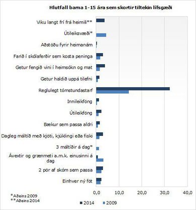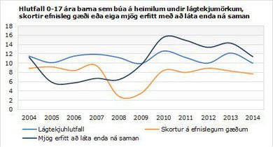 Árið 2014 bjuggu 11,4% barna á heimilum sem áttu mjög erfitt með að láta enda ná saman, 10% á heimilum undir lágtekjumörkum og 7,7% á heimilum sem skorti efnisleg gæði. Þetta kemur fram í tilkynningu frá Hagstofu Íslands. Hlutfall barna sem bjó á heimilum sem áttu mjög erfitt með að láta enda ná saman lækkaði um 2,9 prósentustig á milli ára, hlutfallið undir lágtekjumörkum um 2,2 prósentustig og hlutfallið sem skorti efnisleg gæði um 0,6%.Árið 2013 var hlutfall barna á heimilum undir lágtekjumörkum á Íslandi það fimmta lægsta í Evrópu og hlutfall barna á heimilum sem skorti efnisleg gæði það sjötta lægsta. Hlutfall heimila barna sem áttu mjög erfitt með að láta enda ná saman er hinsvegar svipað og meðaltal evrusvæðisins.Það er fremur fátítt að börn á Íslandi skorti tiltekin lífsgæði. Á þessu er ein undantekning sem er þátttaka í reglulegri tómstundaiðju. Árið 2014 var tæpur þriðjungur barna á Íslandi ekki í reglulegu tómstundastarfi en árið 2009 var hlutfallið 14,3%.Árið 2014 voru 37,9% barna í lægsta fimmtungi tekjudreifingarinnar ekki í reglulegri tómstundaiðju samanborið við 20,3% í hæsta fimmtungnum. Það á einnig við um 45,1% barna foreldra sem aðeins höfðu lokið grunnnámi samanborið við 27,5% barna foreldra sem höfðu lokið háskólanámi.