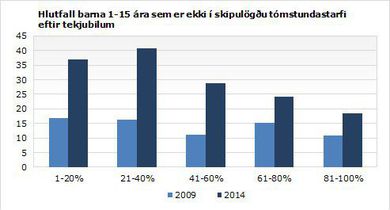 Um þriðjungur barna ekki reglulegu í tómstundastarfi Stefán Árni Pálsson skrifar 23. mars 2015 09:51 Árið 2014 var tæpur þriðjungur barna á Íslandi ekki í reglulegu tómstundastarfi en árið 2009 var hlutfallið 14,3%. VÍSIR/Arnþór Árið 2014 bjuggu 11,4% barna á heimilum sem áttu mjög erfitt með að láta enda ná saman, 10% á heimilum undir lágtekjumörkum og 7,7% á heimilum sem skorti efnisleg gæði. Þetta kemur fram í tilkynningu frá Hagstofu Íslands. Hlutfall barna sem bjó á heimilum sem áttu mjög erfitt með að láta enda ná saman lækkaði um 2,9 prósentustig á milli ára, hlutfallið undir lágtekjumörkum um 2,2 prósentustig og hlutfallið sem skorti efnisleg gæði um 0,6%.Árið 2013 var hlutfall barna á heimilum undir lágtekjumörkum á Íslandi það fimmta lægsta í Evrópu og hlutfall barna á heimilum sem skorti efnisleg gæði það sjötta lægsta. Hlutfall heimila barna sem áttu mjög erfitt með að láta enda ná saman er hinsvegar svipað og meðaltal evrusvæðisins.Það er fremur fátítt að börn á Íslandi skorti tiltekin lífsgæði. Á þessu er ein undantekning sem er þátttaka í reglulegri tómstundaiðju. Árið 2014 var tæpur þriðjungur barna á Íslandi ekki í reglulegu tómstundastarfi en árið 2009 var hlutfallið 14,3%.Árið 2014 voru 37,9% barna í lægsta fimmtungi tekjudreifingarinnar ekki í reglulegri tómstundaiðju samanborið við 20,3% í hæsta fimmtungnum. Það á einnig við um 45,1% barna foreldra sem aðeins höfðu lokið grunnnámi samanborið við 27,5% barna foreldra sem höfðu lokið háskólanámi. Mest lesið Kona þungt haldin og sjö hundar hennar brunnu inni Innlent „Ég hafði ekki ímyndunaraflið í að sjá þetta fyrir mér“ Innlent Konur hafi þurft að afgreiða áttatíu vændiskaupendur á þremur dögum Innlent „Þurfum að búa við það á meðan að vera með þennan ofbeldissegg“ Innlent Bríet og Pálmi takast á fyrir dómstólum Lífið Svarar gagnrýni vegna umdeildra gistihýsa í Skaftafelli Innlent Þrjú dæmd fyrir að flytja inn BMW fullan af kókaíni Innlent Tekur ekki undir greiningu Heiðu Bjargar um konur í Samfylkingunni Innlent Gríðarleg andstaða við lagareldisdrög Hönnu Katrínar Innlent Morðið á Pretti gagnrýnt úr ólíklegustu áttum Erlent Fleiri fréttir Hundrað ára gamalt hús sem varð myglu að bráð Aukin veikindaforföll ekki vegna einstaklingsbundinna vandamála Elsti Íslendingurinn 105 ára gömul kona „Margt óráðið í minni framtíð“ Ein fjölskylda aðstoðuð með gistingu vegna brunans Sigurður Helgi kjörinn varaforseti „Ég hafði ekki ímyndunaraflið í að sjá þetta fyrir mér“ Þrjú dæmd fyrir að flytja inn BMW fullan af kókaíni Ein í framboði og áfram formaður Einar og Magnea í efstu sætum Framsóknar í Reykjavík Konur hafi þurft að afgreiða áttatíu vændiskaupendur á þremur dögum Sprenging í vændi og handboltafár eftir sigur á Svíum Gríðarleg andstaða við lagareldisdrög Hönnu Katrínar Kona þungt haldin og sjö hundar hennar brunnu inni Tekur ekki undir greiningu Heiðu Bjargar um konur í Samfylkingunni Svarar gagnrýni vegna umdeildra gistihýsa í Skaftafelli Brunavarnir Suðurnesja luku störfum á öðrum tímanum í nótt Handtekinn grunaður um íkveikju „Þurfum að búa við það á meðan að vera með þennan ofbeldissegg“ Inni í húsinu þegar eldur logaði í fjölbýlishúsi Náttúruverndarsamtök fjarlægðu stíflu Ungir Sjálfstæðismenn fengu áfengi í ferð með Vilhjálmi og fóru svo á kjörstað Loðna fundist á stóru svæði Metfjöldi vill stíga á svið með Íslenska dansflokknum Faðirinn í hungurverkfalli í lokaðri móttökustöð og móðirin ein með börnin Aðeins tíu prósent sem leita til Stígamóta kæra ofbeldið Spyr hvort að Rúv finnist hún „hundleiðinleg t***a“ „Örstutt þunglyndi yfir niðurstöðunum“ Maðurinn er fundinn Kerfið hafi brugðist Sjá meira