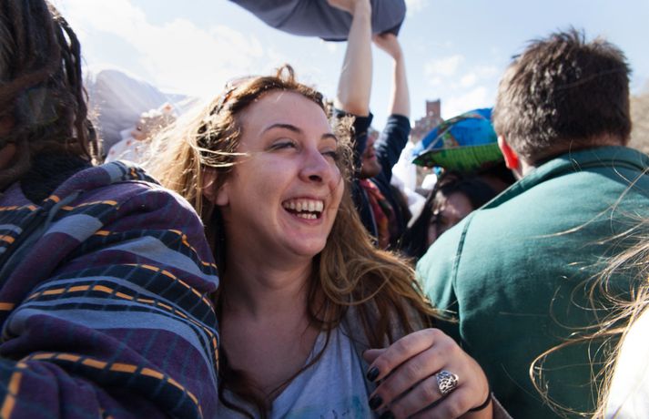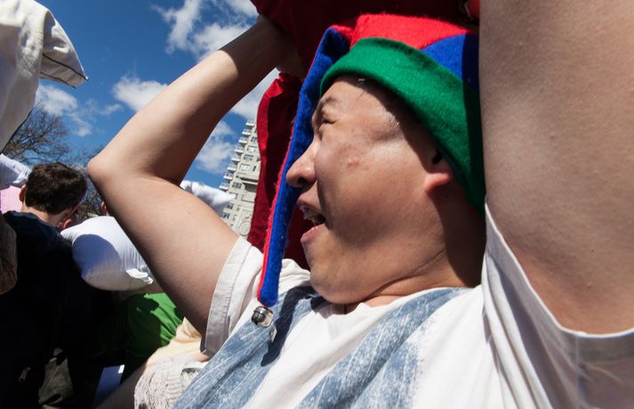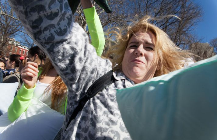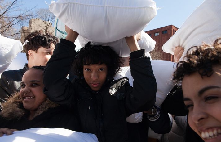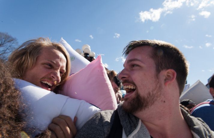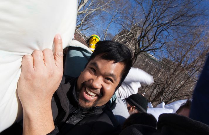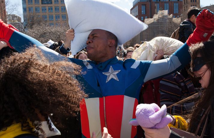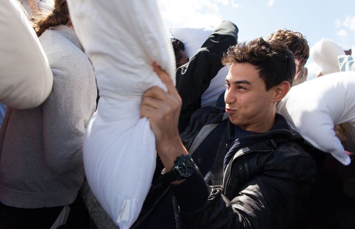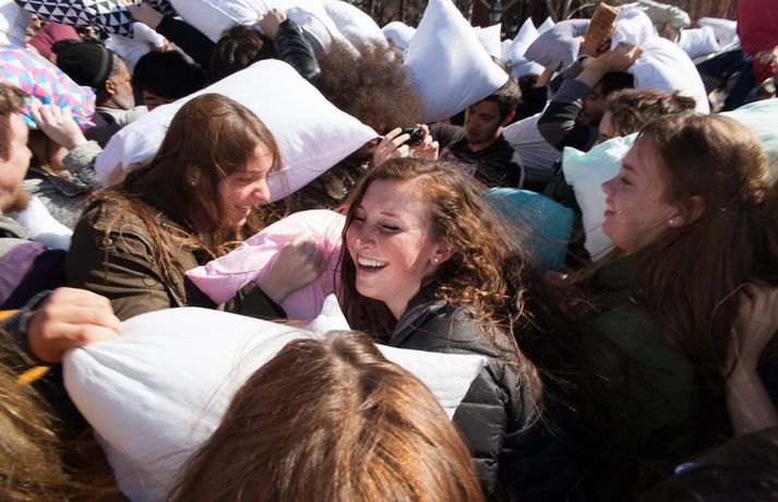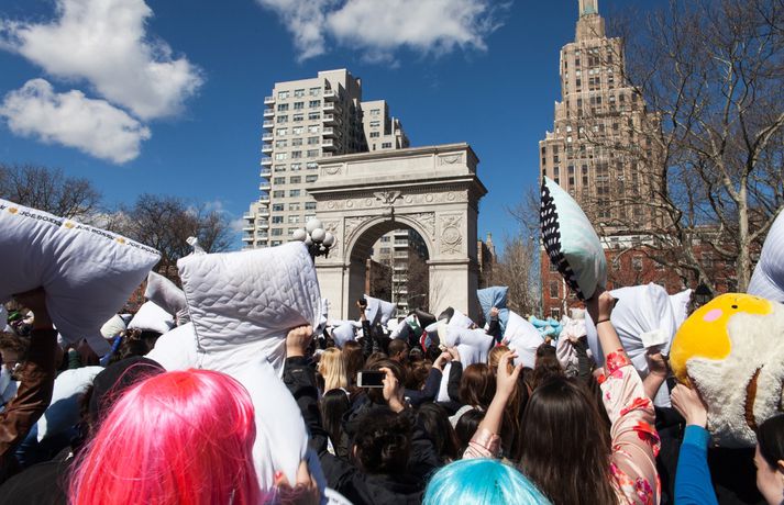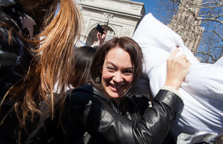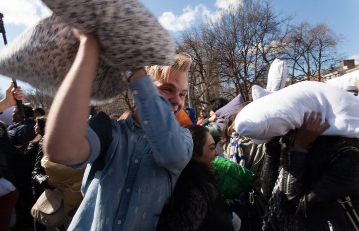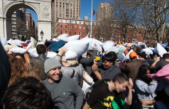 Rúmlega þúsund manns slógust í New York - Myndir Samúel Karl Ólason skrifar 5. apríl 2015 13:12 Mynd/Kári Björn Þorleifsson Alþjóðlegi dagur koddaslagsins var í gær og slógust þúsundir manna um heim allan. Kári Björn Þorleifsson, tók meðfylgjandi myndir í Washington Square Park í New York í gær, þar sem vel yfir þúsund manns létu höggin dynja á hvort öðru. Kári er nemi í ljósmyndun við Parsons School of Design í New York. Fleiri myndir eftir Kára má sjá á heimasíðu hans. Mest lesið Rúmlega helmingur starfsmanna Félagsbústaða hættur Innlent Ákærður fyrir líkamsárás en lýsir yfir sakleysi Innlent „Sátt og samlyndi“ um skyndileg starfslok varaslökkviliðsstjóra Innlent Hætta að skilgreina gróðurhúsalofttegundir sem skaðlegar Erlent Rifust um Trump áður en faðir skaut dóttur sína til bana Erlent „Myndi ekki koma mér á óvart ef það færi að gjósa þarna“ Innlent Einfalt að stýra glæpahring frá allt öðru landi Innlent Ársæll í veikindaleyfi: „Mjög skrýtið að fá sleggju ríkisstjórnar í andlitið“ Innlent Ólína fyllir í skarð Margrétar á Bifröst Innlent Smíða tengibyggingu sem verður hjarta Leifsstöðvar Innlent Fleiri fréttir Leitarheimild byggði á löngu afsönnuðum ásökunum um svindl Opna aftur á flugumferð í El Paso eftir drónaflug frá Mexíkó Opnar sig í nýrri bók: „Ég þekkti ekki þessa menn eða þessa konu“ Íri í haldi ICE óttast um líf sitt Rifust um Trump áður en faðir skaut dóttur sína til bana Loka flugvelli El Paso skyndilega og án útskýringa Jagland sviptur friðhelgi Furstadæmin þjálfa uppreisnarmenn í leynilegri herstöð Hætta að skilgreina gróðurhúsalofttegundir sem skaðlegar Einn í yfirheyrslu og ráðist í húsleit í tengslum við hvarf Nancy Guthrie Norðmenn geti ekki útilokað innrás Rússa Tíu látnir í skotárás á skóla í Kanada Nafngreindi sex mögulega samverkamenn Epstein á þinginu Trump hafi vitað meira en hann viðurkenndi: „Allir vita hvað hann hefur verið að gera“ FBI birtir myndir af grímuklæddum manni við heimili Guthrie Macron segir Evrópumönnum að hrista af sér slenið Undirbúa nýja innrás til að afvopna Hamas Nýtt samkomulag eða nýtt vopnakapphlaup? Sprengdu hurðina af brynvörðum bíl Fundu sex nöfn mögulegra samverkamanna Epstein á tveimur tímum Þrýsta á Ísraela varðandi Vesturbakkann Hótar að koma í veg fyrir opnun brúar milli Windsor og Detroit Neitaði að svara spurningum á grundvelli fimmta viðaukans Var með krabbamein og lést af völdum blóðtappa í lunga Hvetur Starmer til að segja af sér Bauluðu á Vance af „evrópsku stolti“ Áhrifamiklir norskir erindrekar rannsakaðir vegna Epsteins Vilja herða skilyrði fyrir sænskum ríkisborgararétti Vilhjálmur og Katrín hafi „djúpar áhyggjur“ vegna Epstein-afhjúpunar Christchurch-morðinginn vill draga játninguna til baka Sjá meira