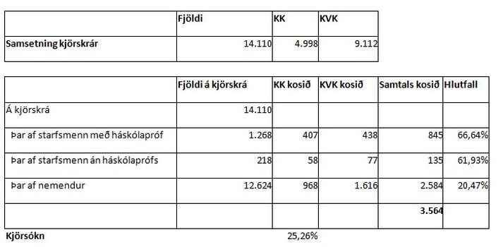 Klukkan eitt í dag höfðu ríflega 25 prósent atkvæðsbærra í Háskóla Íslands tekið þátt í rektorskjöri sem hófst klukkan níu í morgun. Áhugi á rektorskjöri virðist minni meðal nemenda en starfsmanna. Klukkan eitt í dag höfðu 2.584 nemendur skilað inn sínu atkvæði, eða rúmlega tuttugu prósent. Þá höfðu tæp 67 prósent starfsmanna með háskólapróf kosið og um 62 prósent starfsmanna án háskólaprófs. Á kjörskrá eru 14.110.mynd/háskóli íslands