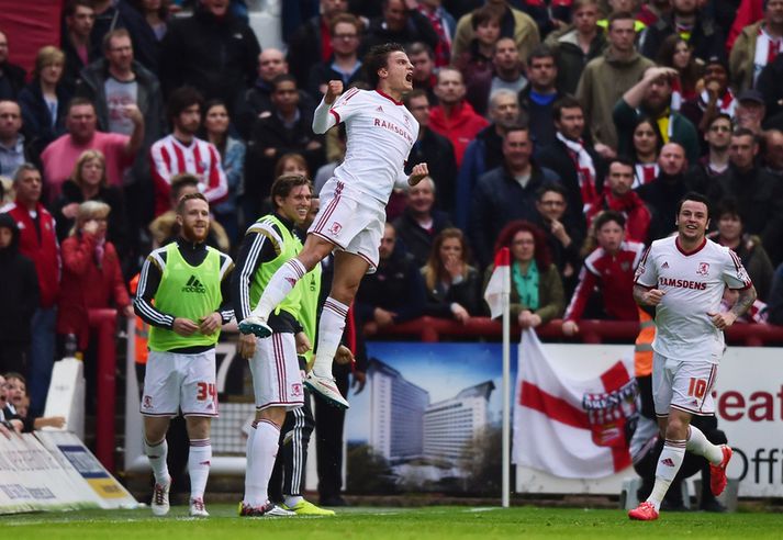 Miðvörður Middlesbrough hetjan í uppbótartíma Óskar Ófeigur Jónsson skrifar 8. maí 2015 20:49 Jelle Vossen skoraði fyrra mark Middlesbrough og fagnaði vel. Vísir/Getty Varamaðurinn Fernando Amorebieta tryggði Middlesbrough 2-1 útisigur á Brentford í fyrri undanúrslitaleik liðanna í umspilinu um laust sæti í ensku úrvalsdeildinni í fótbolta en leikurinn fór fram á heimavelli Brentford. Middlesbrough er í fínum málum en seinni leikurinn verður á heimavelli liðsins. Það lið sem hefur betur mætir annaðhvort Norwich eða Ipswich á Wembley í hreinum úrslitaleik um sætið í úrvalsdeildinni. Brentford hefur komið öllum á óvart í vetur á sínu fyrsta tímabili í ensku b-deildinni í 22 ár en liðið hefur ekki spilað í efstu deild á Englandi síðan 1947. Útlitið er hinsvegar ekki bjart eftir úrslit kvöldsins en Brentford átti miklu meira skilið úr þessum leik. Middlesbrough-liðið hefur ekki spilað í ensku úrvalsdeildinni síðan að liðið féll vorið 2009. Fernando Amorebieta kom inná sem varamaður og skoraði sigurmarkið á þriðju mínútu í uppbótartíma leiksins. Varnarmenn Brentford gleymdu honum í hornspyrnu og hann skoraði gríðarlega mikilvægt mark. Dimi Konstantopoulos, gríski markvörðurinn í liði Middlesbrough, hafði áður fært Brentford jöfnunarmark á silfurfati á 54. mínútu en Andre Gray nýtti sér það vel og bætti um leið fyrir klúður sitt skömmu áður. Það er hægt að sjá það mark hér fyrir neðan. Jelle Vossen skoraði eina mark fyrri hálfleiksins þegar hann kom Middlesbrough í 1-0 á 26. mínútu. Brentford var betra liðið í seinni hálfleiknum en uppskar á endanum ekkert úr þessum leik. Enski boltinn Mest lesið Viðurkenna að VAR hafi bilað Fótbolti Arnar Daði rekinn frá Stjörnunni en áfram þjálfari kvennaliðsins Handbolti Jólagjöf í Keflavík: Remy Martin snýr aftur Körfubolti Koepka fyrsta stjarnan sem riftir samningi við LIV Golf Úr Bestu heim í Hauka Íslenski boltinn Stefndi á ÓL en fannst látinn á hótelherbergi Sport Þessi tíu eru tilnefnd sem Íþróttamaður ársins 2025: 23 ára aldursmunur Sport Heyrði hvorki frá Blikum né Víkingum Íslenski boltinn Ruglaðar lokamínútur í Afríkukeppninni Fótbolti Ótrúlegur sigur á HM: „Ég er mjög tregur svo pressan nær ekki til mín“ Sport Fleiri fréttir Hvers vegna heillast stórliðin svo af Semenyo? Stewart, Snoop og Modric í eina sæng Vill ekki segja hversu lengi Bruno er frá Spyr hvort Guardiola stígi á vigtina Arsenal í undanúrslit eftir vító Man. Utd reyndi stíft en Semenyo kaus City „Tölfræðilega séð eiga þeir ekkert að vera í þessari stöðu“ Chelsea setur sig í samband við Semenyo Jiménez jafnaði bestu vítaskyttu sögunnar Slot mun sakna Isak í tvo mánuði eftir „glórulausa tæklingu“ Sjáðu „auma“ vítið sem skilaði Fulham sigri Fulham skildi Forest eftir við fallsvæðið Áfallið staðreynd og Isak búinn í aðgerð Fagnaði titli Liverpool sem óður maður um alla borg „Allir virðast elska hann“ „Þetta mun ekki buga okkur“ Guardiola mun vigta leikmenn Man City eftir jólin „Ef þið væruð Antoine Semenyo, hvert mynduð þið fara?“ Sjáðu mörkin: Rogers sá um Manchester United Óttast að Isak hafi fótbrotnað Tvenna frá Rogers tryggði Villa sigur gegn Manchester United Fimmta sinn sem Arsenal er á toppnum um jólin: Unnu ekki titilinn í fyrstu fjögur skiptin „Viljum við að okkar verði minnst fyrir að vera skræfur?“ „Ef dómarinn hefði sinnt sínu starfi almennilega hefði Romero ekki fengið spjald“ Haaland gaf barnabarni Hareide gjöf Sjáðu mörkin úr enska: Sviptingar, sænskt þema og svakalegar tæklingar Calvert-Lewin hættir ekki að skora Gyökeres skaut Arsenal aftur á toppinn Slot fámáll um stöðuna á Isak Gleði og sorg í sigri Liverpool Sjá meira