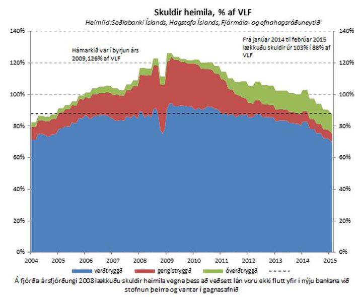Skuldir íslenskra heimila lækkað hraðar en í flestum nágrannalöndum Stefán Árni Pálsson skrifar 7. maí 2015 14:38 Íbúðaskuldir hafa lækkað úr 72% í 65% af VLF frá gildistöku skuldaaðgerða. Skuldir heimilanna eru nú jafnar því sem þær voru árið 2004 sem hlutfall af vergri landsframleiðslu. Þetta kemur fram í tilkynningu frá Fjármála og efnahagsráðuneytinu. Íbúðaskuldir hafa lækkað úr 72% í 65% af VLF frá gildistöku skuldaaðgerða og áhrifa þeirra mun gæta áfram til frekari lækkunar. Í tilkynningunni segir að skuldir heimilanna lækki hraðar á Íslandi en í nágrannalöndum. Þá hefur kaupmáttur launa aukist um átta prósent frá ársbyrjun 2013, sem hefur hjálpað almenningi til við að greiða niður skuldir. Í árslok 2014 voru heildarskuldir heimilanna um 90,5% af VLF og höfðu lækkað um 10 prósentustig á árinu 2014. Íbúðaskuldir voru 68% af VLF í árslok 2014. Um mitt ár 2014 þegar skuldalækkunarúrræði ríkisstjórnarinnar tóku gildi voru íbúðaskuldir 72% af VLF. Í lok febrúar 2015 voru íbúðaskuldir 65% af VLF. Í tilkynningu ráðuneytisins kemur fram að frá áramótum sé búið að greiða liðlega 51 milljarða vegna höfuðstólslækkunarinnar sem séu 75% af heildarfjárhæð niðurfærslunnar. „Síðasti fjórðungur hennar verður greiddur inn á höfuðstól lána í ársbyrjun 2016. Við þetta bætast verulegar fjárhæðir sem heimilin geta greitt inn á húsnæðislán sín, eða sparað til fyrstu kaupa, skattfrjálst í hverjum mánuði. Aðgerða stjórnvalda til skuldalækkunar heimila skipta því sköpum við að bæta fjárhagsstöðu heimilanna og munu skuldir heimilanna lækka enn frekar þegar heildaráhrif aðgerðanna verða að fullu komin fram um mitt ár 2017.“ Skuldir heimila hafa lækkað mun hraðar hér en í flestum nágrannalöndum okkar á undanförnu árum. Mest lesið Samfylkingin valdi sér borgarstjóraefni Innlent Gríðarleg vonbrigði að reyndri konu sé ekki treyst Innlent „Eftir þetta getur enginn treyst honum“ Erlent Annar maður skotinn til bana af ICE Erlent Stigmögnun í nágrannaerjum: „Hann vildi keyra á mig“ Innlent Tvöfalt fleiri aldraðir leituðu hjálpar vegna ofbeldis Innlent Pétur Marteinsson kjörinn oddviti Samfylkingarinnar í Reykjavík Innlent Þjóðvarðlið virkjað eftir að ICE skaut mann til bana Erlent „Enda ekki í nokkru einasta ástandi til að vera meðal fólks“ Innlent Hótar að setja hundrað prósenta toll á Kanada Erlent Fleiri fréttir Munaði litlu að nýliði skákaði borgarstjóra Stóra verkefnið að vinna aftur traust borgarbúa Gríðarleg vonbrigði að reyndri konu sé ekki treyst Pétur Marteinsson kjörinn oddviti Samfylkingarinnar í Reykjavík Samfylkingin valdi sér borgarstjóraefni Valið á milli gömlu og nýju Samfylkingarinnar Gullhúðað afnám jafnlaunavottunar Tvöfalt fleiri aldraðir leituðu hjálpar vegna ofbeldis Vandræðagangur með skilaboð á versta tíma fyrir Heiðu Leita að öðrum til að taka við Ísafjarðarfluginu Allir hafi áhuga á Íslandi Biður Dóru Björt afsökunar eftir deilur um vetrarþjónustu Þrjátíu prósent Samfylkingarfélaga greitt atkvæði það sem af er Algengast að börn beiti foreldra sína ofbeldi og prófkjör Samfylkingarinnar „Enda ekki í nokkru einasta ástandi til að vera meðal fólks“ Árásarmaðurinn svartklæddi reyndist vera ættingi Stigmögnun í nágrannaerjum: „Hann vildi keyra á mig“ Gengst nú við skilaboðunum umdeildu Hægt að nálgast vottorð um að makinn hafi rangt fyrir sér Um 900 manns nú með lögheimili í Grindavík „Það átti að taka mig í karphúsið“ Selenskí undir miklum þrýstingi Tímamótaviðræður hafnar og ögurstund hjá Samfylkingunni Eldur í sendibíl á Miklubraut Arnar Grétarsson í stjórnmálin Gjörbreytt Langahlíð fyrir milljarð Segist ekki muna eftir að hafa sent skilaboðin „Einhver SA prins mættur til að láta sem allt sé bara kózý“ Endurtekin og alvarleg mál valda áhyggjum Hiti færist í leikinn: „Frægur karl með enga reynslu“ Sjá meira