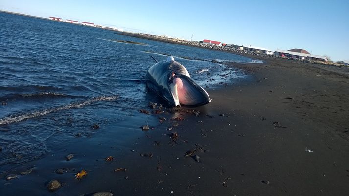 Hrefnu rak á land í Vogum Samúel Karl Ólason skrifar 6. maí 2015 10:22 Hrefnan liggur í fjörunni við Hvammsgötu í Vogum. Mynd/Ásgeir Eiríksson Hrefna liggur nú dauð í fjörunni við Hvammsgötu í Vogum eins og sjá má á myndum sem Ásgeir Eiríksson, bæjarstjóri Voga sendi á fjölmiðla nú í morgun. Ásgeir segir líklegt að hrefnan hafi drepist og rekið upp í fjöruna. Hann segir einnig að líklega sé um unga hrefnu að ræða og að hún sé um sex til sjö metrar að lengd.Mynd/Ásgeir Eiríksson Mest lesið Samfylkingin valdi sér borgarstjóraefni Innlent „Eftir þetta getur enginn treyst honum“ Erlent Gríðarleg vonbrigði að reyndri konu sé ekki treyst Innlent Stigmögnun í nágrannaerjum: „Hann vildi keyra á mig“ Innlent Játaði meira og meira eftir því sem á leið Innlent Gengst nú við skilaboðunum umdeildu Innlent Trump fer í fýlu og dregur boð sitt til Carney til baka Erlent Annar maður skotinn til bana af ICE Erlent Segist ekki muna eftir að hafa sent skilaboðin Innlent Hægt að nálgast vottorð um að makinn hafi rangt fyrir sér Innlent Fleiri fréttir Munaði litlu að nýliði skákaði borgarstjóra Stóra verkefnið að vinna aftur traust borgarbúa Gríðarleg vonbrigði að reyndri konu sé ekki treyst Pétur Marteinsson kjörinn oddviti Samfylkingarinnar í Reykjavík Samfylkingin valdi sér borgarstjóraefni Valið á milli gömlu og nýju Samfylkingarinnar Gullhúðað afnám jafnlaunavottunar Tvöfalt fleiri aldraðir leituðu hjálpar vegna ofbeldis Vandræðagangur með skilaboð á versta tíma fyrir Heiðu Leita að öðrum til að taka við Ísafjarðarfluginu Allir hafi áhuga á Íslandi Biður Dóru Björt afsökunar eftir deilur um vetrarþjónustu Þrjátíu prósent Samfylkingarfélaga greitt atkvæði það sem af er Algengast að börn beiti foreldra sína ofbeldi og prófkjör Samfylkingarinnar „Enda ekki í nokkru einasta ástandi til að vera meðal fólks“ Árásarmaðurinn svartklæddi reyndist vera ættingi Stigmögnun í nágrannaerjum: „Hann vildi keyra á mig“ Gengst nú við skilaboðunum umdeildu Hægt að nálgast vottorð um að makinn hafi rangt fyrir sér Um 900 manns nú með lögheimili í Grindavík „Það átti að taka mig í karphúsið“ Selenskí undir miklum þrýstingi Tímamótaviðræður hafnar og ögurstund hjá Samfylkingunni Eldur í sendibíl á Miklubraut Arnar Grétarsson í stjórnmálin Gjörbreytt Langahlíð fyrir milljarð Segist ekki muna eftir að hafa sent skilaboðin „Einhver SA prins mættur til að láta sem allt sé bara kózý“ Endurtekin og alvarleg mál valda áhyggjum Hiti færist í leikinn: „Frægur karl með enga reynslu“ Sjá meira