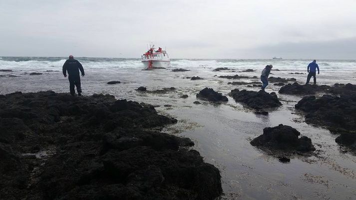Bátur strandaði við Hópsnes: Öllum um borð bjargað Stefán Árni Pálsson skrifar 13. maí 2015 13:06 Báturinn strandaði við Hópsnes. Vísir/Ernir Mannbjörg varð þegar að að bátur fór upp í fjöru við Hópsnes skammt frá innsiglingunni í Grindavík. Samkvæmt upplýsingum frá lögreglunni á Suðurnesjum voru fjórir menn voru um borð og er búið að bjarga öllum. Lögreglu barst tilkynning um slysið klukkan 12:28. Þyrla Landhelgisgæslunnar og björgunarsveitir á Suðurnesjum voru kallaðar út vegna málsins. Þá stefndi báturinn í strand. Báturinn heitir Gottlieb 2622, sem er stærri gerðin af línubát. Áhöfnin gekk úr bátnum þegar hann hafði strandað í fjörunni.Uppfært 13:25: Tilkynning hefur borist frá Landhelgisgæslunni vegna málsins. „Stjórnstöð Landhelgisgæslunnar barst nú kl. 12:23 neyðarkall frá bátnum Gottlieb 2622 sem var vélarvana við Hópsnes á Reykjanesi. Rak bátinn hratt að landi. Fjórir skipverjar voru um borð. Þegar í stað var þyrla Landhelgisgæslunnar kölluð út sem og björgunarsveitir á Suðurnesjum og björgunarskip Slysavarnarfélagsins Landsbjargar. Skömmu eftir að útkallið barst var báturinn kominn upp í kletta og lagðist þar á hliðina. Nærstaddir bátar á svæðinu komust ekki að til aðstoðar. Strekkingsvindur var á svæðinu, SA 10-12 m og aðstæður á staðnum erfiðar. Skipverjar, sem voru allir í björgunargöllum náðu að koma taug í land og kl. 12:51 barst staðfesting um að þeir væru allir komnir upp í fjöru heilir á húfi. Um hálftíma eftir að útkallið barst lenti þyrla Landhelgisgæslunnar í fjörukambinum og mun hún flytja skipverjana til Grindavíkur.“Hér strandaði báturinn.Vísir/LoftmyndirAf strandstað.Mynd/Halli Bangsi Mest lesið „Eftir þetta getur enginn treyst honum“ Erlent Samfylkingin velur sér borgarstjóraefni Innlent Stigmögnun í nágrannaerjum: „Hann vildi keyra á mig“ Innlent Annar maður skotinn til bana af ICE Erlent Tvöfalt fleiri aldraðir leituðu hjálpar vegna ofbeldis Innlent „Enda ekki í nokkru einasta ástandi til að vera meðal fólks“ Innlent Gengst nú við skilaboðunum umdeildu Innlent Hægt að nálgast vottorð um að makinn hafi rangt fyrir sér Innlent Hótar að setja hundrað prósenta toll á Kanada Erlent Vandræðagangur með skilaboð á versta tíma fyrir Heiðu Innlent Fleiri fréttir Samfylkingin velur sér borgarstjóraefni Valið á milli gömlu og nýju Samfylkingarinnar Gullhúðað afnám jafnlaunavottunar Tvöfalt fleiri aldraðir leituðu hjálpar vegna ofbeldis Vandræðagangur með skilaboð á versta tíma fyrir Heiðu Leita að öðrum til að taka við Ísafjarðarfluginu Allir hafi áhuga á Íslandi Biður Dóru Björt afsökunar eftir deilur um vetrarþjónustu Þrjátíu prósent Samfylkingarfélaga greitt atkvæði það sem af er Algengast að börn beiti foreldra sína ofbeldi og prófkjör Samfylkingarinnar „Enda ekki í nokkru einasta ástandi til að vera meðal fólks“ Árásarmaðurinn svartklæddi reyndist vera ættingi Stigmögnun í nágrannaerjum: „Hann vildi keyra á mig“ Gengst nú við skilaboðunum umdeildu Hægt að nálgast vottorð um að makinn hafi rangt fyrir sér Um 900 manns nú með lögheimili í Grindavík „Það átti að taka mig í karphúsið“ Selenskí undir miklum þrýstingi Tímamótaviðræður hafnar og ögurstund hjá Samfylkingunni Eldur í sendibíl á Miklubraut Arnar Grétarsson í stjórnmálin Gjörbreytt Langahlíð fyrir milljarð Segist ekki muna eftir að hafa sent skilaboðin „Einhver SA prins mættur til að láta sem allt sé bara kózý“ Endurtekin og alvarleg mál valda áhyggjum Hiti færist í leikinn: „Frægur karl með enga reynslu“ Samfylkingarmönnum í Reykjavík fjölgað um 72 prósent Heimilisofbeldismálin alvarlegri en áður og fundað um Úkraínu í Abu Dhabi Svona var Pallborðið með Heiðu Björgu og Pétri Játaði meira og meira eftir því sem á leið Sjá meira