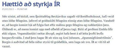 Vill að fólk hætti að styrkja ÍR: „Í stað þess hagar ÍR sér eins og Árni Johnsen“ Stefán Árni Pálsson skrifar 10. maí 2015 18:29 Jónas líkir Íþróttafélagi Reykjavíkur við Árna Johnsen. Vísir Jónas Kristjánsson, ritstjóri, hvetur fólk til þess að hætta að styrkja íþróttafélagið ÍR en frá þessu greinir hann á bloggsíðu sinni. Jónas er ekki sáttur við félagið en Reykjavíkurborg hefur kært ÍR fyrir að höggva af yfir 100 birkitrjám við Breiðholtsbraut. Trén voru farin að skyggja á auglýsingaskilti á svæði ÍR-inga „Mér sýnist, að birkið, sem Íþróttafélag Reykjavíkur sagaði við Breiðholtsbraut, hafi verið utan lóðar félagsins. Jafnvel sé gróðaskilti félagsins einnig utan lóðar félagsins. Vandséð er, að borgin komist hjá að fylgja fast eftir málinu gegn félaginu og ruddastjórn þess,“ segir Jónas. Hann bætir við að ólíðandi sé að menn komist upp með ofbeldi af þessu tagi. „Birki af gerðinni Emblu lifir ekki sögun. Vegamálastjóri neitar ábyrgð, segist hafa bent á að leita þyrfti leyfis borgaryfirvalda. Í stað þess hagar ÍR sér eins og Árni Johnsen, „égummigfrámértilmín“. Borgin á auðvitað að fella niður styrki til gróðafíkla, sem haga sér svo. ÍR er víti til að varast.“Á síðu Vegagerðarinnar segir að þann 22. september hafi borist tilkynning frá ÍR um að flettiskilti í eigu ÍR væri komið í hvarf á bak við trjágreinar. Þá tilkynntu ÍR-ingar að félagið hefði í hyggju að klippa greinarnar ofan af trjám niður og lækka þannig trjágróðurinn að hann skyggði ekki á flettiskiltið. Undir lok tilkynningarinnar frá ÍR stóð síðan; „Berist ekki formleg andmæli frá Vegagerðinni innan 15 daga frá dagsetningu þessa bréfs lítur ÍR svo á að þessi aðgerð verði látin afskiptalaus.“ Vegagerðin svaraði þann 30. september svohljóðandi: „Vegagerðin gerir ekki athugasemdir við þetta en trjágróður meðfram þjóðvegum er almennt ekki á hennar vegum. Í þessu tilviki er það Reykjavíkurborg.“ Vegagerðin vísaði því málinu til Reykjavíkurborgar sem veitti ekki leyfi fyrir því að trén yrðu lækkuð. Mest lesið Samfylkingin valdi sér borgarstjóraefni Innlent „Eftir þetta getur enginn treyst honum“ Erlent Gríðarleg vonbrigði að reyndri konu sé ekki treyst Innlent Stigmögnun í nágrannaerjum: „Hann vildi keyra á mig“ Innlent Annar maður skotinn til bana af ICE Erlent Tvöfalt fleiri aldraðir leituðu hjálpar vegna ofbeldis Innlent „Enda ekki í nokkru einasta ástandi til að vera meðal fólks“ Innlent Pétur Marteinsson kjörinn oddviti Samfylkingarinnar í Reykjavík Innlent Gengst nú við skilaboðunum umdeildu Innlent Hótar að setja hundrað prósenta toll á Kanada Erlent Fleiri fréttir Stóra verkefnið að vinna aftur traust borgarbúa Gríðarleg vonbrigði að reyndri konu sé ekki treyst Pétur Marteinsson kjörinn oddviti Samfylkingarinnar í Reykjavík Samfylkingin valdi sér borgarstjóraefni Valið á milli gömlu og nýju Samfylkingarinnar Gullhúðað afnám jafnlaunavottunar Tvöfalt fleiri aldraðir leituðu hjálpar vegna ofbeldis Vandræðagangur með skilaboð á versta tíma fyrir Heiðu Leita að öðrum til að taka við Ísafjarðarfluginu Allir hafi áhuga á Íslandi Biður Dóru Björt afsökunar eftir deilur um vetrarþjónustu Þrjátíu prósent Samfylkingarfélaga greitt atkvæði það sem af er Algengast að börn beiti foreldra sína ofbeldi og prófkjör Samfylkingarinnar „Enda ekki í nokkru einasta ástandi til að vera meðal fólks“ Árásarmaðurinn svartklæddi reyndist vera ættingi Stigmögnun í nágrannaerjum: „Hann vildi keyra á mig“ Gengst nú við skilaboðunum umdeildu Hægt að nálgast vottorð um að makinn hafi rangt fyrir sér Um 900 manns nú með lögheimili í Grindavík „Það átti að taka mig í karphúsið“ Selenskí undir miklum þrýstingi Tímamótaviðræður hafnar og ögurstund hjá Samfylkingunni Eldur í sendibíl á Miklubraut Arnar Grétarsson í stjórnmálin Gjörbreytt Langahlíð fyrir milljarð Segist ekki muna eftir að hafa sent skilaboðin „Einhver SA prins mættur til að láta sem allt sé bara kózý“ Endurtekin og alvarleg mál valda áhyggjum Hiti færist í leikinn: „Frægur karl með enga reynslu“ Samfylkingarmönnum í Reykjavík fjölgað um 72 prósent Sjá meira