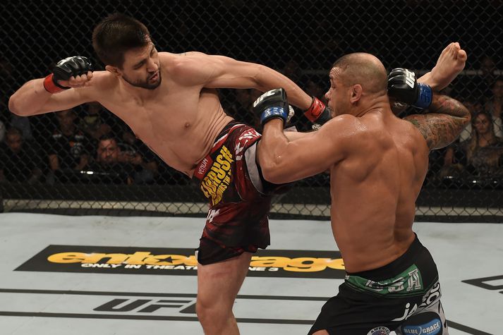 Condit lagði Alves að velli í Brasilíu 31. maí 2015 11:45 Condit og Alves gáfu allt í bardagann. vísir/getty Carlos Condit bar sigurorð á Thiago Alves í bardaga þeirra í UFC í nótt. Dómarinn stöðvaði bardagan að læknisráði eftir 2. lotu en þá var Alves illa leikinn eftir meðhöndlun Condit. Þetta var fyrsti bardagi hins 31 árs gamla Condit síðan hann barðist við Tyron Woodley í mars 2014. Condit meiddist illa á hné í þeim bardaga og þurfti aðgerð til að koma sér í stand á nýjan leik. Það var hins vegar ekki að sjá að Condit væri neitt ryðgaður gegn Alves í nótt. Alves var vel studdur af áhorfendum í sal en bardaginn fór fram í heimalandi hans, Brasilíu. Condit var duglegur að breyta um stíl í fyrstu lotu og það virtist trufla Alves. Alves reyndi að sækja en Condit náði að lenda nokkrum góðum höggum og spörkum sem drógu vel úr krafti heimamannsins. Litlu munaði að dómarinn stoppaði bardagan í 2. lotu þegar Alves féll í gólfið eftir gott olnbogahögg frá Condit en Alves kom sér á aftur á fætur. Alves lagði allt í bardagann en allt kom fyrir ekki þar sem læknir bardagans mat ástandið á Alves það alvarlegt að réttast væri að stöðva bardagann. Condit hefur nú unnið 30 bardaga á sínum ferli og tapað 8. Alves hefur hins vegar unnið 26 bardaga en tapað 10 talsins. Aðrar íþróttir Mest lesið Hættur aðeins þrítugur Golf Sjáðu geggjaðan snúning Alberts áður en hann skoraði frábært mark Fótbolti Áfallið staðreynd og Isak búinn í aðgerð Enski boltinn Bunting dró orð sín til baka með tárin í augunum: „Ég er ekki meistari fólksins“ Sport Sakaður um svindl á HM í pílukasti Sport Afkáralegt fagn hjá hetju Sambíu Fótbolti Táningur fær mikið hrós fyrir viðbrögð sín þegar mótherji missti meðvitund Fótbolti Steraleikarnir segi ungu fólki að það sé aldrei nógu fullkomið Sport Áhorfendur ærðust eftir mögulega mark mótsins í fyrsta leik Fótbolti Klappstýrur Björgvins Karls slógu í gegn Sport Fleiri fréttir Einn leikmaður með samning og völlurinn ólöglegur Vildi tapa legg: „Mesti hávaði sem ég hef heyrt“ Salah færði Egyptum draumabyrjun Fulham skildi Forest eftir við fallsvæðið Áfallið staðreynd og Isak búinn í aðgerð Neres hetja Napoli í Sádi-Arabíu Aron Einar lagði upp dýrmætt sigurmark Sagði látna systur sína hafa tryggt sigurinn ótrúlega Steraleikarnir segi ungu fólki að það sé aldrei nógu fullkomið Afkáralegt fagn hjá hetju Sambíu Glódís Perla veik í jólafríið en enn taplaus Hættur aðeins þrítugur Glódís og Hákon best í fótboltanum á árinu Frelsaði fjárfestirinn Dani Alves gefur sjálfum sér samning Fagnaði titli Liverpool sem óður maður um alla borg Mbappé breytti um fagn af góðu tilefni „Allir virðast elska hann“ Stjörnuútherji Steelers sló til áhorfenda í miðjum leik Haukur getur náð hundrað plús hundrað fyrir EM-fríið Meira en 37 stöðugildi hjá Knattspyrnusambandi Íslands Táningur fær mikið hrós fyrir viðbrögð sín þegar mótherji missti meðvitund „Þetta mun ekki buga okkur“ Guardiola mun vigta leikmenn Man City eftir jólin Stórstjarna úr WNBA-deildinni í heimsókn á Íslandi Mætir öldungnum sem breytti lífi hans Missti af tveimur mánuðum eftir að hafa slasast við að tengja sjónvarpið „Ef þið væruð Antoine Semenyo, hvert mynduð þið fara?“ Freyr himinlifandi með íslensku strákana Sjáðu geggjaðan snúning Alberts áður en hann skoraði frábært mark Klappstýrur Björgvins Karls slógu í gegn Sjá meira