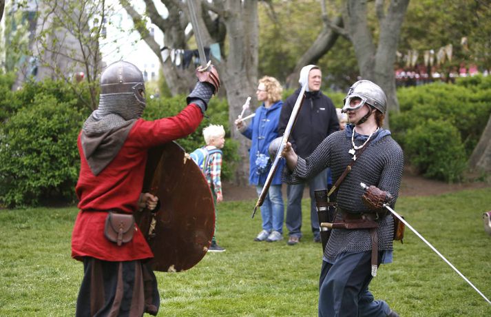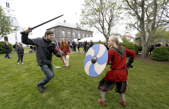 Víkingar tókust á í miðborginni í dag 17. júní 2015 20:26 Margt var um manninn í miðborg Reykjavíkur í dag þar sem fólk ýmist gæddi sér á kandíflosi eða mótmælti á Austurvelli. Aðrir hlýddu á ljúfa tóni á Arnarhóli meðan bardagakappar sveifluðu sverðum. Andri Marínó ljósmyndari fréttastofunnar fangaði andrúmsloftið í borginni í dag og afraksturinn má sjá hér að ofan.Vísir/Andri Marínó Mest lesið „Við getum gert það sem við viljum“ Erlent „Þetta er svolítið óvenjulegt, ég er ekki á þingi“ Innlent Landsleikir á vinnutíma fela í sér tækifæri Innlent Kom ekki á teppið Innlent Foreldrarnir vissu ekki af kynferðisofbeldinu Innlent Pétur vill leiða Viðreisn í Kópavogi Innlent Fengið svör frá Bandaríkjunum um Íslandsyfirlýsingar Trumps Innlent Nú geta íbúar skráð sjálfir hvað megi betur fara í borginni Innlent Halla slær á putta handboltahetjunnar Innlent „Ég á þetta og má þetta“ Innlent Fleiri fréttir Nú geta íbúar skráð sjálfir hvað megi betur fara í borginni „Þetta er svolítið óvenjulegt, ég er ekki á þingi“ Landsleikir á vinnutíma fela í sér tækifæri Pétur vill leiða Viðreisn í Kópavogi Kom ekki á teppið Landsvirkjun hyggst bjóða út alla verkþætti Hvammsvirkjunar í ár Lilja sækist eftir því að leiða Framsókn Willum fer ekki fram og styður Lilju Foreldrarnir vissu ekki af kynferðisofbeldinu Magnea vill hækka sig um sæti Vissu ekki af kynferðisbrotinu fyrr en lögreglan hafði samband Fengið svör frá Bandaríkjunum um Íslandsyfirlýsingar Trumps Laugarnestangi friðlýstur sem menningarlandslag Mesti fjöldi í sögu bráðamóttökunnar Leita manns vegna kynferðisbrots við Austurbæjarbíó Sósíalistar sendu nær allar tekjur í félög tengdum fyrri stjórn Mætast í Pallborðinu á lokasprettinum Kafað í óbirta og umtalaða skýrslu um Félagsbústaði Rannsóknaskipin gera hlé á loðnuleit vegna óveðurs Viðreisn býður fram undir merkjum Samfylkingar Þrjú erlend her- og varðskip í Reykjavík Ósammála um hvort lögregla hafi gefið fyrirmæli „Ég á þetta og má þetta“ „Það er ekki hægt að muna allan þennan djöful“ Nauðgaði konu og reyndi að færa henni blóm daginn eftir Hvalveiðimótmælin fyrir dóm og Danir segja ekkert samið um Grænland Húsleit fór fram víðar en á Akureyri Halla slær á putta handboltahetjunnar „Ég framkvæmdi þetta af algjörri nauðsyn“ „Sama hvað gerist þá sigra hvalirnir“ Sjá meira
