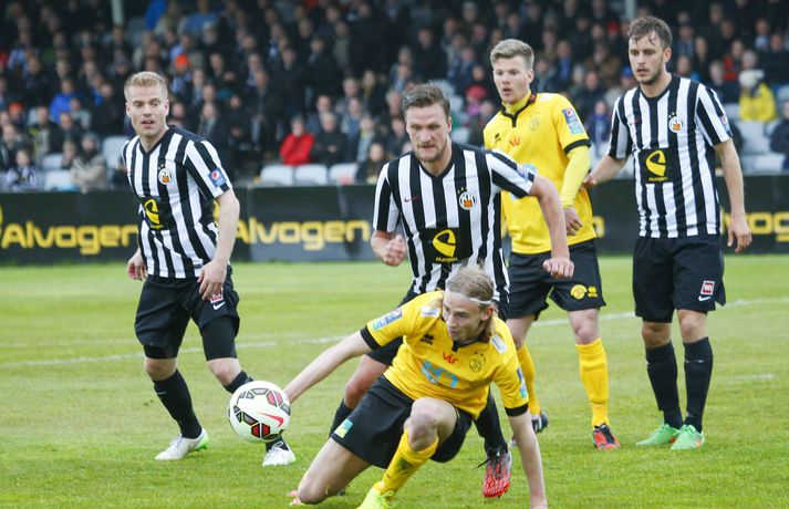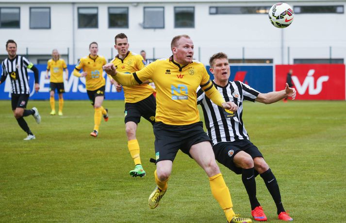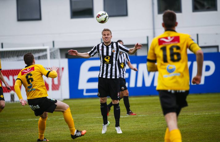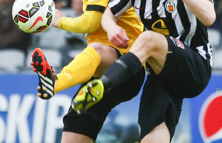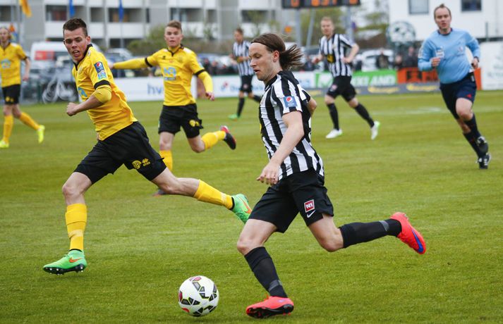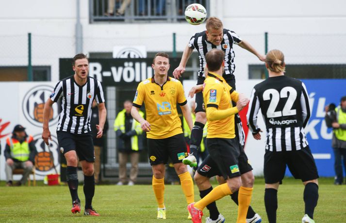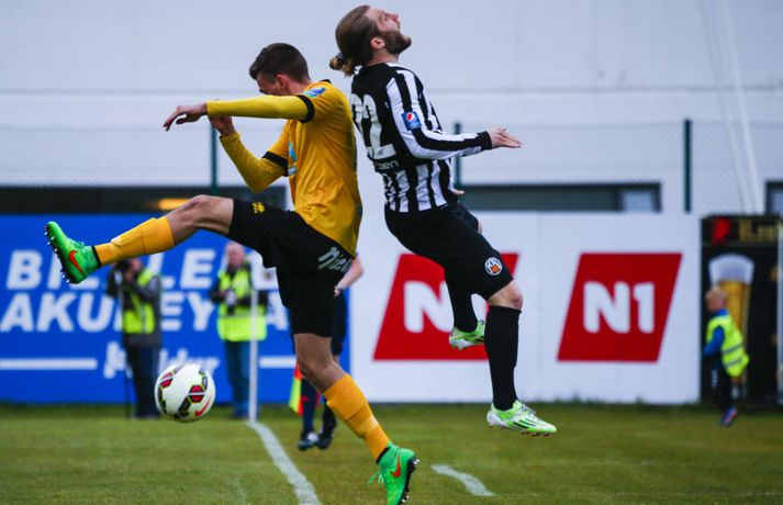 Umfjöllun, viðtöl, einkunnir og myndir: KR - ÍA 1-1 | Skagamenn náðu í stig Stefán Árni Pálsson skrifar 15. júní 2015 13:45 Árni Snær Ólafsson er á undan Sören Fredriksen í boltann. Vísir/vilhelm KR-ingar náðu aðeins í stig gegn Skagamönnum í 8. umferð Pepsi-deildar karla í kvöld en leikurinn fór 1-1 í Vesturbænum. Ásgeir Marteinsson gerði mark Skagamanna en Almarr Ormarsson mark KR. Leikurinn hófst nokkuð rólega og bæði lið lengi í gang. KR-ingar voru meira með boltann en Skagamenn ætluðu greinilega að beita skyndisóknum. Aftasta línu KR virkaði óörugg og þar fór fremstur í flokki Stefán Logi Magnússon í markinu. Hann gerði ítrekuð mistök í fyrri hálfleiknum og maður fékk á tilfinninguna að hann væri að smita út frá sér óöryggi. Liðin voru bæði í vandræðum með að skapa sér færi en það voru samt þeir gulu sem skoruðu fyrsta mark leiksins. Það kom einni mínútu fyrir lok fyrri hálfleiksins en þá skallaði Ásgeir Marteinsson boltann laglega í netið eftir stórkostlega fyrirgjöf frá Ólafi Val Valdimarssyni. Staðan var því 0-1 í hálfleik. KR-ingar voru mikið mun betri í síðari hálfleiknum en þeim fyrri. Þeir byrjuðu strax á mikilli pressu á Skagamarkið og eins og leikurinn þróaðist þá var jöfnunarmarkið bara í loftinu. Það kom eftir rúmlega klukkutíma leik þegar Almarr Ormarsson náði að þvinga boltann í netið með mjöðminni eftir mikinn darraðardans inn í vítateig Skagamanna. Bæði lið fengu sín færi út leikinn og gátu bæði stolið sigrinum. Lokamínúturnar voru ótrúlegar og fengu leikmenn beggja liða frábær færi en inn vildi boltinn ekki. Stefán Logi Magnússon, markvörður KR, varði stórkostlega undir lok leiksins en þá átti Jón Vilhelm Ákason aukaspyrnu sem stefndi í vinkilinn. Niðurstaðan 1-1 jafntefli og KR-ingar hafa aðeins fengið eitt stig í síðustu tveimur umferðum. Gunnlaugur: Hefðum átt að klára þetta undir lokinGunnlaugur Jónsson í kvöld.Vísir/vilhelm„Við vorum ógnandi og sköpum okkur fín færi í þessum leik,“ segir Gunnlaugur Jónsson, þjálfari ÍA, eftir leikinn. „Að mínu viti áttum við að skora fleiri mörk í dag. Við erum bara að berjast fyrir lífi okkar í þessari deild og staðan fyrir þennan leik var bara ekki glæsileg. Við ætluðum bara að koma inn í þennan leik óhræddir, gefum þeim alvöru leik og svo varð raunin.“ Gunnlaugur segir að Skagamenn hefðu hæglega getað skorað annað mark í fyrri hálfleiknum. „Þeir fengu sín færi í leiknum en ég er ánægður með að strákarnir gáfust aldrei upp. Við fengum síðan fullt af færum undir lokin og hefðum alveg getað stolið þessum sigri.“ Bjarni: Verðum í vandræðum ef við spilum svonaBjarni Guðjónsson var fjörugur á hliðarlínunni í kvöld.vísir/vilhelm„Þetta er ekki gott, hér viljum við vinna alla leiki,“ segir Bjarni Guðjónsson, þjálfari KR, eftir leikinn. „Við vorum slakir í fyrri hálfleik og bætum vel úr því í þeim síðari. Þá fengum við helling af færum til þess að gera útum leikinn.“ Ræðan sem Bjarni gaf leikmönnum sínum í hálfleiknum snérist um að fá meiri kraft í leikinn og halda boltanum lengur innan liðsins. „Við viljum spila alvöru fótbolta og það gekk stóran hluta í seinni hálfleik. Við fengum nokkuð mörg færi, markmaðurinn varði nokkrum sinnum vel frá okkur.“ Bjarni segir að ef liðið ætli sér að spila svona í sumar þá verði það í vandræðum. „Við höfum aftur á móti vopnin til þess að bregðast við og laga þetta, breyta þessu og hafa hlutina í lagi.“ Jón Vilhelm: Ég ætlaði bara að vippa yfir Stefán LogaJón Vilhelm fyrr í sumar.„Verður maður ekki að vera sáttur með eitt stig á þessum velli,“ segir Jón Vilhelm Ákason, eftir leikinn. „Við hefðum klárlega getað klúðrað þessu í restina þegar við fengum þrjú til fjögur góð færi,“ segir Jón sem misnotaði fínt færi undir lokin þegar hann var kominn einn í gegn. Þá ætlaði hann að vippa yfir hinn hávaxna Stefán Loga í marki KR. „Já, ég hefði hugsað mér að gera það. Hann bara skoppaði nokkuð illa fyrir framan mig í þetta sinn.“ Jón setti síðan boltann alveg við vinkilinn nokkrum sekúndum fyrir leikslok en aftur varði Stefán Logi. „Hann gerði það gríðarlega vel í markinu en við fengum nokkur færi í kjölfarið og hefðum alveg getað stolið þessum leik. Það eru töluverð batamerki á okkar leik og í síðustu tveimur leikjum höfum við verið að berjast miklu meira.“ Almarr: Ég mjaðmaði boltann í netiðAlmarr í leik með KR.„Þetta eru klárlega tvö töpuð stig fyrir okkur, við ætluðum að ná í þau öll,“ segir Almarr Ormarsson, markaskorari KR, eftir leikinn. „Við vorum ekki góðir í fyrri hálfleik og fengið heldur betur að heyra það í hálfleik. Við bættum okkar leik mikið í þeim síðari og áttum að koma boltanum oftar inn.“ Almarr skoraði eina mark KR í leiknum. Fáir sáum í raun hver skoraði markið. „Skari sparkaði boltanum inn í teig og mér tókst einhvern veginn að mjaðma hann inn. Ekki fallegasta markið, en þau telja öll jafn mikið.“vísir/vilhelm Pepsi Max-deild karla Mest lesið Sterkasta kona heims svipt titlinum þegar í ljós kom að hún fæddist karlkyns Sport Fiskur og rauðvín í Barcelona í skugga sögusagna: „Best að segja sem minnst“ Handbolti Skjótur bati Janusar: „Tel mig heppinn að ekki hafi farið verr“ Handbolti Dæmd í langt bann fyrir að leyna því hvar hún væri Sport Rifjuðu upp sögu af formanni KSÍ og slagsmál Dyer og Bowyer Enski boltinn „Það helsta sem ég sakna við Þýskaland“ Handbolti Ætla að senda skýr skilaboð gegn Íslandi og gætu fengið vænan bónus Handbolti Dagskráin í dag: Arsenal gegn Bayern og Liverpool mætir