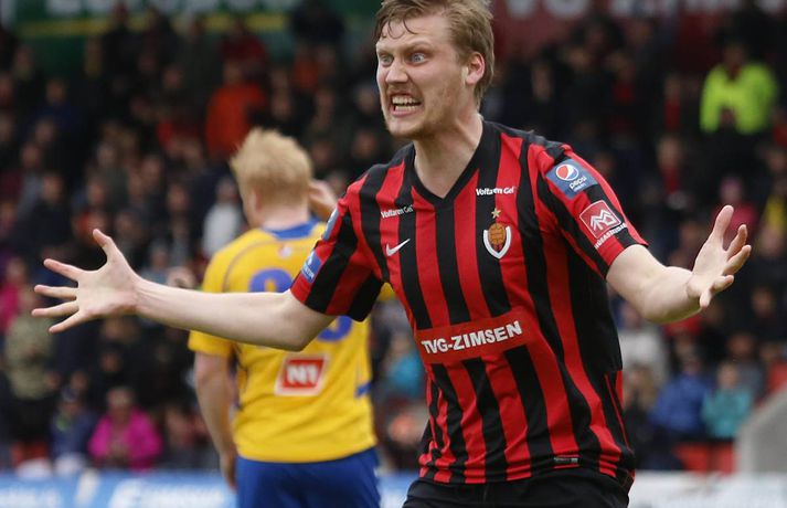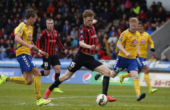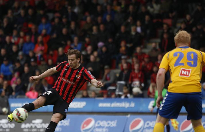 Umfjöllun, viðtöl, einkunnir og myndir: Víkingur - Fjölnir 2-0 | Langþráður sigur Víkinga Jóhann Óli Eiðsson á Víkingsvelli skrifar 22. júní 2015 23:00 Andri Rúnar Bjarnason reynir skot að marki Fjölnis. vísir/valli Þeir sem horfðu aðeins á töfluna fyrir leiki settu peninga sína vafalaust á það að Fjölnir myndi leggja Víking að velli í kvöld enda liðið í þriðja sæti deildarinnar og gat með réttum úrslitum, fimm marka sigri eða meir, komist á topp deildarinnar. Raunin varð hins vegar sú að Víkingar gegnu af velli með öll stigin þrjú. Bæði lið gerðu tvær breytingar á byrjunarliðum sínum en skörð Fjölnismanna voru öllu stærri. Fyrirliðinn Bergsveinn Ólafsson var í leikbanni og Daniel Ivanovski, sem hefur verið við hlið hans í sumar, er farinn af landi brott. Haukur Lárusson og Guðmundur Karl Guðmundsson léku sem miðverðir í kvöld. Leikurinn byrjaði afar rólega og hvorugt liðið náði að skapa sér neitt af viti. Víkingar skoruðu mark eftir rúmar tuttugu mínútur en Andri Rúnar Bjarnason var rangstæður að mati aðstoðardómara og fékk það því ekki að skora. Hann fékk gullið tækifæri til að skora mínútu síðar en afgreiðsla hans var ekki góð. Varnarmenn Fjölnis lentu oft í basli með hraða Rolf Toft og það var það sem orsakaði fyrsta mark leiksins. Toft náði að slíta sig lausan frá Hauki Lárussyni og koma skoti á markið. Toft hefur vafalaust átt betri skot í gegnum tíðina en Þórður Ingason í marki Fjölnis réð ekki við boltann. Í síðari hálfleik var það sama upp á teningnum. Annað mark heimamanna kom eftir tíu mínútur af síðari hálfleiknum. Þá stakk Toft varnarmenn af í annað sinn í leiknum en í þetta skiptið renndi hann knettinum út á Davíð Örn Atlason sem skoraði auðveldlega. Undir lok leiksins reyndu Fjölnismenn það sem þeir gátu til að minnka muninn en allt kom fyrir ekki. Víkingar voru talsvert nær því að skora fleiri mörk og í raun algerir klaufar að gera það ekki. Eitt skiptið voru þeir tveir gegn markverði og öðru sinni þrír gegn einum varnarmanni en afrekuðu að glutra því niður. Það hafði engin áhrif á úrslitin og unnu rauðir og svartir sinn fyrsta sigur frá því í fyrstu umferð. Það sem meira er, þá héldu þeir hreinu í fyrsta skipti í sumar. Þrátt fyrir stigin þrjú eru þeir enn í áttunda sæti en lengra er niður í fallið en áður. Rolf Toft var stórgóður í leiknum og án alls vafa maður leiksins. Með hraða sínum olli hann Fjölnismönnum miklu veseni og hafði að lokum mark og stoðsendingu upp úr krafsinu. Andri Rúnar vann vel uppi á toppnum en fannst helst til of oft í rangstöðu. Einnig er vert að minnast á framlag miðvarðanna Milos Zivkovic og Alan Lowing. Þeim tókst að halda Gunnari Má og Þóri alveg niðri upp á topp og í tvígang náði Milos að sigra skallaeinvígi við Gunnar á slíkan hátt að annað eins hefur ekki sést lengi. Grafarvogsbúar halda þriðja sætinu þrátt fyrir tapið en eru án alls vafa fúlir með frammistöðu sína. Þetta var einfaldlega ekki það Fölnislið sem við höfum vanist það sem af er sumri. Haukur og Guðmundur voru ekki nógu hraðir til að klára dæmið og það virtist skila sér í því að bakverðirnir Arnór Eyvar og Viðar voru ragir við að aðstoða kanntmennina. Aron Sigurðarsson virtist á stundum ætla að gera Dofra Snorrasyni, sem lék í hægri bakverði í kvöld, lífið leitt en virtist svo gleyma því jafnharðan. Bæði hann og Ragnar Leósson eiga meira inni en þeir sýndu í kvöld. Fjölnir náði nokkrum skotum í kvöld en þau voru flest af löngu færi og nær undantekningalaust enduðu þau í varnarmanni áður en þau gátu orðið Thomas Nielsen til ama. Þeir uppskáru nokkrar hornspyrnur en náðu einfaldlega alls ekki að færa sér þær í nyt. Víkingar fara í heimsókn í Lautina í næstu umferð en sá leikur fer fram á föstudag. Fylkismenn eru aðeins sæti fyrir ofan þá í deildinni og ljóst að ef Víkingar ríða feitum hesti frá þeirri viðureign að þeir geta kvatt neðri helminginn í bili. Fjölnis bíður hins vegar toppslagur við FH í Grafarvoginum. Eigi ekki að fara illa verða þeir að standa vaktina betur en þeir gerðu í kvöld.Milos: Það eina sem ég gerði var að fara í flott jakkaföt „Þetta voru eiginlega það eina sem var hreint eftir að ég var á 25 daga námskeiði erlendis,” sagði Milos Milojevic eftir sigurinn en hann stóð vaktina í stað Ólafs Þórðarssonar sem var í leikbanni. Milos kom fyrr heim af námskeiðinu út af banninu. „Ég hef klætt mig eftir veðri að undanförnu og það var frábært fótboltaveður í dag svo ég henti mér í flott jakkaföt og flotta skó.“ Strákarnir hans Milos klæddu sig líka í sparifötin í kvöld og stóðu sig stór vel allan leikinn. Fyrsti sigur Víkings frá í fyrstu umferð og þeir héldu hreinu í fyrsta skipti á tímabilinu. „Við tókum þrjú stig gegn flottu og spræku Fjölnisliði sme hefur verið spila frábæran fótbolta og náð frábærum úrslitum í fyrstu umferðum mótsins. Það eina sem ég gerði var að klæða mig í flott jakkaföt og fara eftir uppstillingunni hjá Óla og það gekk allt upp hjá okkur.“ Fjölnismenn voru í basli með leikinn og upplegg heimamanna gekk upp allan leikinn. „Við vissum að þeir þyrftu að breyta sínu liði en á endanum þá eru þetta ellefu af okkar strákum á móti ellefu af þeirra ellefu. Þá snýst þetta um að velja réttu augnablikin til að gera réttu hlutina og þeir gerðu það. Þetta var karakter og tempó upp á tíu í kvöld.“ Gústi Gylfa: Toft fékk að róla um allan völl „Við vorum í erfiðleikum allan leikinn og sáum var til sólar,“ sagði Ágúst Gylfason eftir leikinn. „Þeir mættu vel stemmdir og riðluðu okkar l