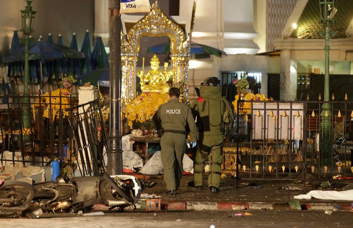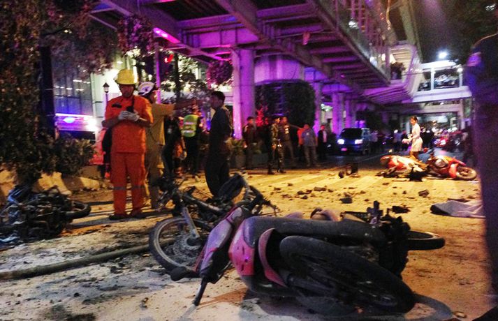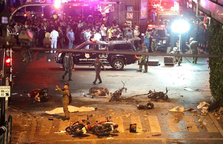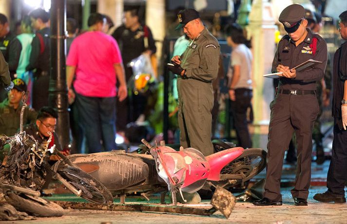 Árásinni í Bangkok var beint gegn ferðamönnum Jóhann Óli Eiðsson skrifar 17. ágúst 2015 15:14 Fjöldi manns var á staðnum er sprengingin varð. vísir/ap Minnst tólf eru látnir og hátt í áttatíu særðir eftir að mótórhjólasprengja sprakk í Bangkok, höfuðborg Taílands. Ríkisstjórn landsins segir að sprengjunni hafi verið ætlað að skaða ferðamannaiðnað í landinu og lama þar með efnahagskerfi þess. 78 manns hafa verið fluttir á nærliggjandi sjúkrahús en hlúð er að minna slösuðum á nærliggjandi hótelum. Sprengingin átti sér stað á fjölförnum gatnamótum skammt frá Erawan hofinu í höfuðborginnni. Margir heimsækja hofið á degi hverjum, jafnt ferðamenn sem heimafólk, en þar má finna styttu af Brahma, gyðju hindúa.Bangkok bomb blast pic.twitter.com/fPcBk2qk1N — Agence France-Presse (@AFP) August 17, 2015 Torgið hefur í gegnum tíðina verið nýtt til mótmæla í landinu en fyrir fimm árum síðan létust níutíu manns er herinn hóf skothríð að mótmælendum sem voru komnir saman til að lýsa yfir andúð sinni á stjórnvöldum í landinu. Aðeins rétt rúmir sex kílómetrar eru frá hofinu að þinghúsi landsins. Mikill óróleiki hefur verið í landinu undanfarin ár en landinu hefur verið stýrt af hernum frá því í maí í fyrra. Herinn tók þá stjórnina eftir að mótmæli höfðu staðið yfir í landinu svo mánuðum skipti. Oftar en ekki fóru þau fram þar sem sprengjan sprakk. Enginn hefur enn lýst yfir ábyrgð á árásinni en talið er líklegt að múslimar í suðurhluta landsins séu að baki henni. Sprengjur eru afar sjaldséðar í höfuðborginni en öllu algengari syðst í landinu. Rúm 95% þeirra 67 millljón manns sem í landinu búa eru búddistar en aðrir eru ýmist múslimar eða hindúar. „Markmiðið var að eyðileggja hagkerfið og ferðamannaiðnaðinn því sprengjan sprakk á miklu ferðamannasvæði,“ segir Prawit Wongsuwan varnarmálaráðherra Taílands. „Við höfum fundið eina sprengju á svæðinu og teljum líklegt að það séu fleiri. Við leitum af þeim í augnablikinu. Það gæti orðið önnur sprenging svo við biðjum fólk um að vera ekki á þvælingi að óþörfu í kringum svæðið,“ segir Wongsuwan.vísir/apvísir/apvísir/apvísir/apvísir/apvísir/apvísir/ap Tengdar fréttir Öflug sprenging í Bangkok Fyrstu fregnir herma að minnst tólf séu látnir og á annan tug séu særðir. 17. ágúst 2015 12:42 Mest lesið Magnús Eiríksson borinn til grafar Innlent „Kanntu ekki mannasiði mannfjandi?“ Innlent Óvæntur blaðamannafundur: Las „afrekabókina“ og sýndi myndir af glæpamönnum Erlent Hafi nauðgað sex ára stúlku og eiginkonu sinni og birt af því myndir Innlent Kvaðst hafa drepið fjölskylduna og ætlað að stinga sig í hjartað Innlent Trump fer mikinn á Truth Social og virðist ætla sér Kanada Erlent Neituðu að greiða starfsfólki á leið í eigin rekstur uppsagnarfrest Innlent „Ekki gott að fólk sé endalaust að sulla svona í víni“ Innlent Heitt í hamsi vegna Grænlands Innlent Fyrsta árinu af fjórum lokið Erlent Fleiri fréttir Einn látinn eftir annað lestarslys á Spáni Óvæntur blaðamannafundur: Las „afrekabókina“ og sýndi myndir af glæpamönnum Fæðingum fækkaði um 1,62 milljónir milli ára Varaði við lögmáli frumskógarins og hæddist að Trump Beiting hervalds ólíkleg en ekki útilokuð Ráðherra Trumps segir Evrópu móðursjúka Skutu flugskeytum fyrir tólf milljarða á einni nóttu Fyrsta árinu af fjórum lokið Fjórar hákarlaárásir á aðeins 48 klukkustundum Trump fer mikinn á Truth Social og virðist ætla sér Kanada Vöruðu við slæmum skilyrðum á brautinni Vitleysan „í þessum óþekka strák í Hvíta húsinu“ leiði vonandi til sjálfstæðis Skoða bann við nektarforritum eftir X-hneykslið Býður Pútín sæti í „friðarráði“ fyrir Gasaströndina Hættur að hugsa bara um frið fyrst hann fékk ekki Nóbelinn Tala látinna hækkar í lestarslysinu á Spáni Danir máttlausir gagnvart rússnesku ógninni í 20 ár Rúmlega tuttugu látnir eftir árekstur tveggja hraðlesta Boðar leiðtogaráðið á aukafund vegna hótana Trumps Brýndi fyrir Trump að tollun hans væri „röng“ Þjóðverjar yfirgefa Grænland Ræddi við Trump: „Hlakka til að sjá hann“ Hervæddur hvunndagurinn í Nuuk Átta látnir á einum degi vegna snjóflóða Miklar sviptingar í Sýrlandi Gríðarleg vonbrigði og mikið áhyggjuefni Tollahótanir Trump gætu hrundið af stað uggvænlegri atburðarás Nóbelsnefndin afdráttarlaus varðandi framsal verðlaunapeninga Vilja beita „ofurvopni“ ESB gegn Bandaríkjunum Hundruð hermanna í viðbragðsstöðu vegna Minnesota Sjá meira