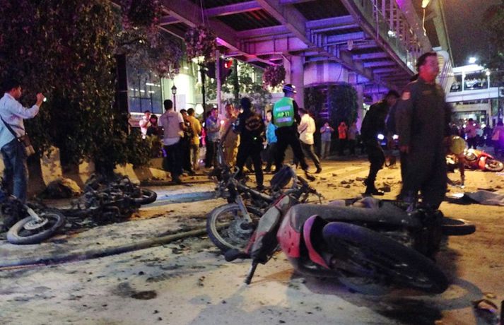 Minnst tólf eru látnir og hátt í áttatíu særðir eftir að mótórhjólasprengja sprakk í Bangkok, höfuðborg Taílands. Ríkisstjórn landsins segir að sprengjunni hafi verið ætlað að skaða ferðamannaiðnað í landinu og lama þar með efnahagskerfi þess. 78 manns hafa verið fluttir á nærliggjandi sjúkrahús en hlúð er að minna slösuðum á nærliggjandi hótelum. Sprengingin átti sér stað á fjölförnum gatnamótum skammt frá Erawan hofinu í höfuðborginnni. Margir heimsækja hofið á degi hverjum, jafnt ferðamenn sem heimafólk, en þar má finna styttu af Brahma, gyðju hindúa.Bangkok bomb blast pic.twitter.com/fPcBk2qk1N — Agence France-Presse (@AFP) August 17, 2015 Torgið hefur í gegnum tíðina verið nýtt til mótmæla í landinu en fyrir fimm árum síðan létust níutíu manns er herinn hóf skothríð að mótmælendum sem voru komnir saman til að lýsa yfir andúð sinni á stjórnvöldum í landinu. Aðeins rétt rúmir sex kílómetrar eru frá hofinu að þinghúsi landsins. Mikill óróleiki hefur verið í landinu undanfarin ár en landinu hefur verið stýrt af hernum frá því í maí í fyrra. Herinn tók þá stjórnina eftir að mótmæli höfðu staðið yfir í landinu svo mánuðum skipti. Oftar en ekki fóru þau fram þar sem sprengjan sprakk. Enginn hefur enn lýst yfir ábyrgð á árásinni en talið er líklegt að múslimar í suðurhluta landsins séu að baki henni. Sprengjur eru afar sjaldséðar í höfuðborginni en öllu algengari syðst í landinu. Rúm 95% þeirra 67 millljón manns sem í landinu búa eru búddistar en aðrir eru ýmist múslimar eða hindúar. „Markmiðið var að eyðileggja hagkerfið og ferðamannaiðnaðinn því sprengjan sprakk á miklu ferðamannasvæði,“ segir Prawit Wongsuwan varnarmálaráðherra Taílands. „Við höfum fundið eina sprengju á svæðinu og teljum líklegt að það séu fleiri. Við leitum af þeim í augnablikinu. Það gæti orðið önnur sprenging svo við biðjum fólk um að vera ekki á þvælingi að óþörfu í kringum svæðið,“ segir Wongsuwan.vísir/apvísir/apvísir/apvísir/apvísir/apvísir/apvísir/ap
