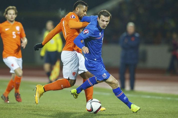 Theódór Elmar: Verð að vera raunsær 28. ágúst 2015 08:30 Theódór Elmar í leiknum gegn Hollandi. Vísir/Getty Theódór Elmar Bjarnason, miðjumaður AGF, var spurður út í tækifæri sín hjá íslenska landsliðinu í dönskum fjölmiðlum um helgina en hann sagðist vera tilbúinn að spila hvar sem er á vellinum fyrir íslenska liðið. Það kom töluvert á óvart þegar Theódór Elmar byrjaði í hægri bakverði í fyrsta leik liðsins gegn Tyrklandi fyrir ári síðan en hann stóð sig með prýði í fyrstu leikjum liðsins þrátt fyrir að vera miðjumaður að upplagi. Missti hann sæti sitt í byrjunarliðinu til Birkis Más Sævarssonar í vor en hann segist vera tilbúinn að spila hvar sem er á vellinum fyrir landsliðið. „Við erum með marga frábæra miðjumenn sem eru í stórum félögum félögum í Evrópu þannig ég verð að vera raunsær. Það vantaði bakverði og ég endaði þar og hef spilað nokkra leiki núna. Ég er ánægður að vera hluti af hópnum og vonast til þess að geta farið á Evrópumótið á næsta ári. Ég mun spila þá stöðu sem ég verð settur í og gefa mitt besta.“ EM 2016 í Frakklandi Mest lesið Dómarinn hlýtur mikið lof fyrir stundarbræði í garð Jake Paul og Joshua Sport Haaland gaf barnabarni Hareide gjöf Enski boltinn Ronaldo á nærbuxunum lætur Elon Musk efast um sjálfan sig Fótbolti Tvær títanplötur settar í Jake Paul eftir kjálkabrotið Sport Sjáðu mörkin úr enska: Sviptingar, sænskt þema og svakalegar tæklingar Enski boltinn Stór nöfn úr leik á HM í pílukasti Sport „Ef dómarinn hefði sinnt sínu starfi almennilega hefði Romero ekki fengið spjald“ Enski boltinn Gleði og sorg í sigri Liverpool Enski boltinn Slæm fjárhagsstaða HSÍ kemur ekki niður á EM Handbolti Slot fámáll um stöðuna á Isak Enski boltinn Fleiri fréttir „Viljum við að okkar verði minnst fyrir að vera skræfur?“ „Ef dómarinn hefði sinnt sínu starfi almennilega hefði Romero ekki fengið spjald“ Haaland gaf barnabarni Hareide gjöf Sjáðu mörkin úr enska: Sviptingar, sænskt þema og svakalegar tæklingar Madrídingar anda ofan í hálsmálið á Börsungum Calvert-Lewin hættir ekki að skora Gyökeres skaut Arsenal aftur á toppinn Ronaldo á nærbuxunum lætur Elon Musk efast um sjálfan sig Orri Steinn kominn með nýjan þjálfara Slot fámáll um stöðuna á Isak Gleði og sorg í sigri Liverpool Real Madrid - Sevilla | Tekst að róa ástandið fyrir jól? Willum spilaði sinn fyrsta leik í tæpa fjóra mánuði Dramatík er Broja reyndist hetja Burnley Haaland frábær er Manchester City komst á toppinn Skagastrákarnir áttu misjöfnu gengi að fagna Afríkukeppnin verður haldin á fjögurra ára fresti Andri Lucas skoraði í langþráðum sigri Blackburn Chelsea vann upp tveggja marka forskot á St James' Park Ekkert fararsnið á Guardiola sem segir að City verði að vera undirbúið Tíu bestu mörkin úr leikjum Liverpool og Tottenham Salah bað samherjana afsökunar Lineker fokillur við blaðamann: „Þvílíkt kjaftæði“ Skírði soninn LFC og Mac Allister lét draum feðganna rætast Varði fjórar vítaspyrnur með brotna hendi Immobile skaut Bologna í úrslit Jóga og pílates lykillinn að snöggri endurkomu Hrannar Snær til Noregs Breiðablik, Valur og Þór/KA fengu milljónir vegna EM Elías mættur til meistaranna Sjá meira