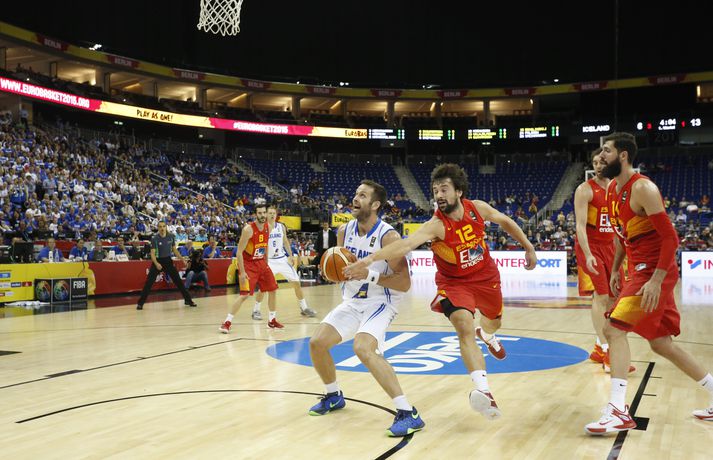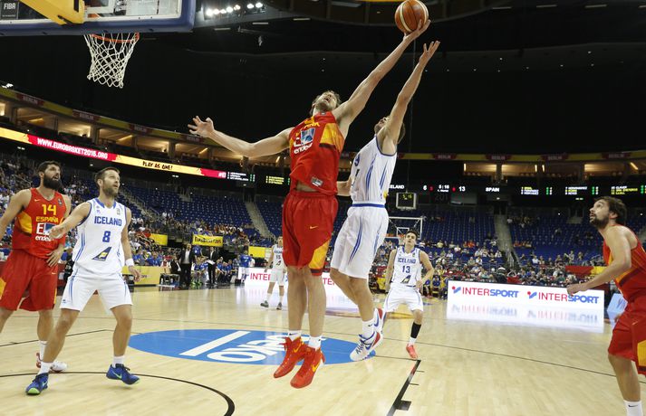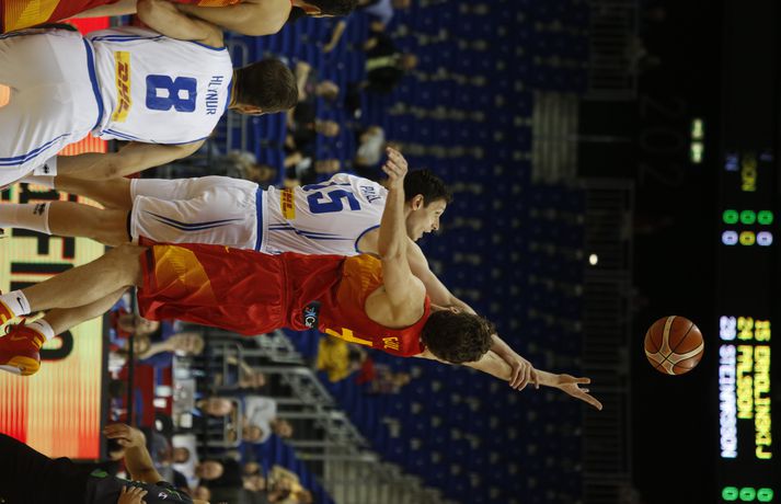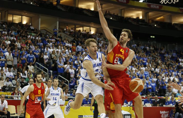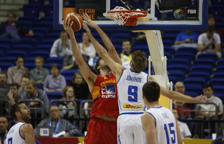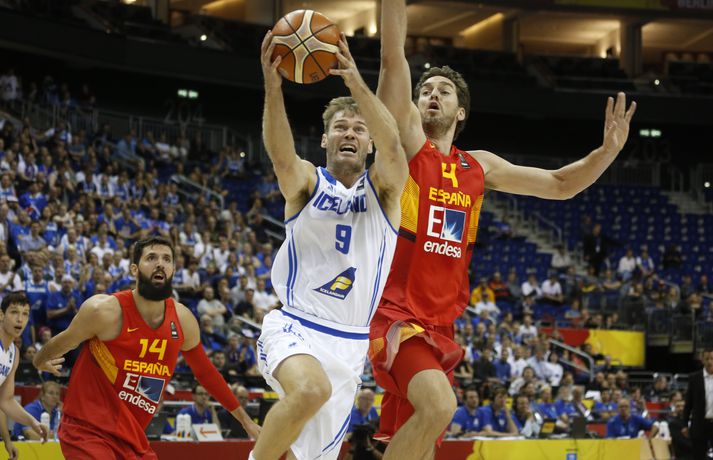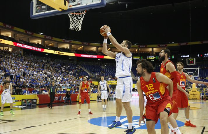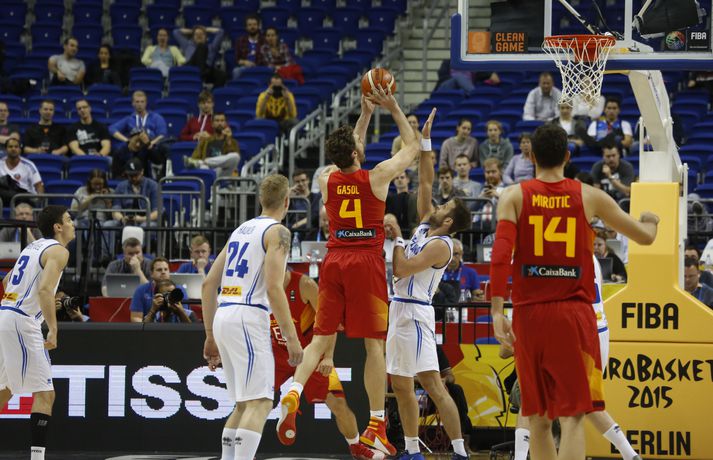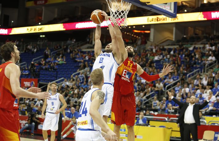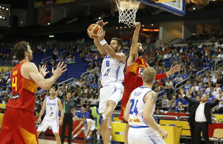 Ísland tapaði sínum fjórða leik í röð á Evrópumótinu í körfubolta þegar íslensku strákarnir biðu lægri hlut fyrir gríðarlega sterku liði Spánverja, 73-99. Íslenska liðið hélt í við það spænska í fyrri hálfleik og spilaði á köflum stórvel. Ísland náði m.a. mögnuðum 11-0 spretti í 2. leikhluta þar sem liðið breytti stöðunni úr 20-28 í 31-28. Ísland náði mest fjögurra stiga forskoti, 34-30, þegar Jakob Örn Sigurðarson setti niður þrist þegar tæpar fjórar mínútur voru eftir af fyrri hálfleik. En þá sögðu Spánverjar hingað og ekki lengra og luku fyrri hálfleiknum á 11-2 spretti og leiddu með fimm stigum, 36-41, í hálfleik. Spænska liðið, með Chicago Bulls-stjörnurnar Pau Gasol og Nikola Mirotic í broddi fylkingar, hafði svo öll völd á vellinum í seinni hálfleik og vann að lokum 26 stiga sigur, 73-99.Valgarður Gíslason, ljósmyndari Fréttablaðsins og Vísis, er staddur í Berlín og tók þessar skemmtilegu myndir sem fylgja fréttinni.vísir/vallivísir/vallivísir/vallivísir/vallivísir/vallivísir/vallivísir/vallivísir/vallivísir/vallivísir/valli