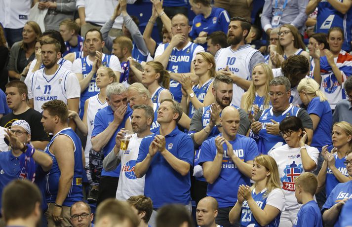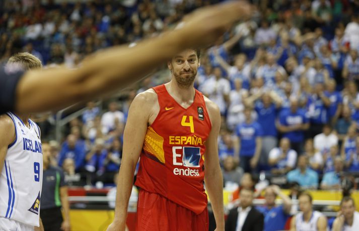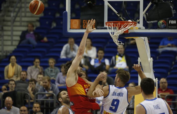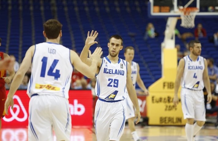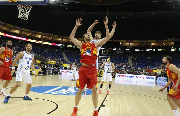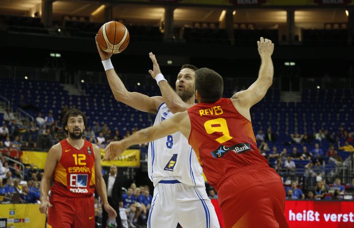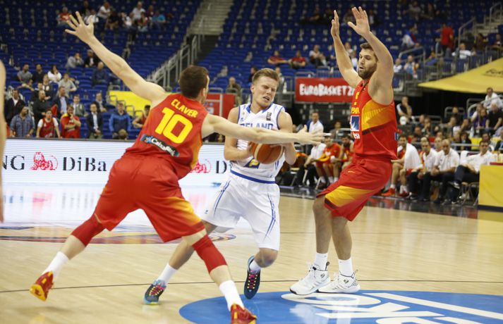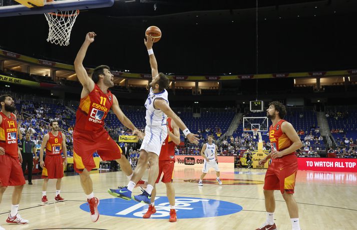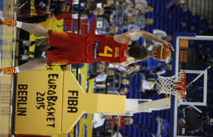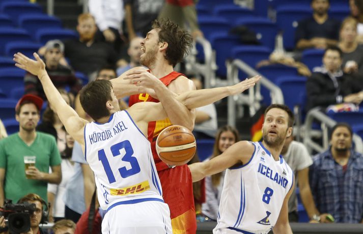 Ísland tapaði sínum fjórða leik í röð á Evrópumótinu í körfubolta þegar íslensku strákarnir biðu lægri hlut fyrir gríðarlega sterku liði Spánverja, 73-99. Íslenska liðið hélt í við það spænska í fyrri hálfleik og spilaði á köflum stórvel. Ísland náði m.a. mögnuðum 11-0 spretti í 2. leikhluta þar sem liðið breytti stöðunni úr 20-28 í 31-28. Ísland náði mest fjögurra stiga forskoti, 34-30, þegar Jakob Örn Sigurðarson setti niður þrist þegar tæpar fjórar mínútur voru eftir af fyrri hálfleik. En þá sögðu Spánverjar hingað og ekki lengra og luku fyrri hálfleiknum á 11-2 spretti og leiddu með fimm stigum, 36-41, í hálfleik. Spænska liðið, með Chicago Bulls-stjörnurnar Pau Gasol og Nikola Mirotic í broddi fylkingar, hafði svo öll völd á vellinum í seinni hálfleik og vann að lokum 26 stiga sigur, 73-99.Valgarður Gíslason, ljósmyndari Fréttablaðsins og Vísis, er staddur í Berlín og tók þessar skemmtilegu myndir sem fylgja fréttinni.vísir/vallivísir/vallivísir/vallivísir/vallivísir/vallivísir/vallivísir/vallivísir/vallivísir/vallivísir/valli
