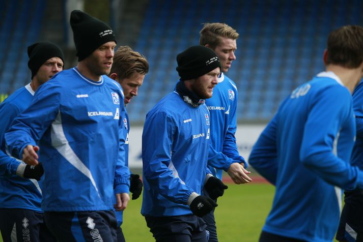 Undirbúningur íslenska landsliðsins fyrir síðustu tvo leikina í undankeppni EM 2016 hófst í dag en strákarnir funduðu með þjálfurunum Lars Lagerbäck og Heimi Hallgrímssyni í morgun og æfðu svo á Laugardalsvelli í hádeginu. Ísland mætir Lettlandi á heimavelli á laugardaginn en fer svo til Tyrklands og spilar ytra á þriðjudaginn. Ísland er sem kunnugt er þegar búið að tryggja sér sæti í úrslitakeppni EM 2016 en Lagerbäck sagði við Vísi í dag að það væri mikilvægt að nálgast leikina með réttu hugarfari - og slaka alls ekki á. „Aðstæður eru auðvitað sérstakar vegna þess að við erum komnir áfram. En við ræddum það á okkar fyrsta fundi með leikmönnunum að nú þurfum við að fara út fyrir þægindarammann og vera 100 prósent fagmenn,“ sagði Lagerbäck.Sjá einnig: Verðum ekki með neina tilraunastarfssemi „Það er alltaf mikilvægt að leggja sig alla fram og læra af leikjunum en nú skiptir líka máli að vinna til að auka möguleika á að komast upp í þriðja styrkleikaflokk fyrir dráttinn í desember.“ „Leikmenn og þjálfarar þurfa því að líta á þessa tvo leiki líkt og þeir væru upp á líf og dauða hjá okkur,“ sagði hann enn fremur.Lars og Eiður Smári Guðjohnsen slá á létta strengi.Vísir/VilhelmÍslandi tókst ekki að skora þegar liðið mætti Kasakstan á Laugardalsvelli í síðasta mánuði og strákarnir þurftu að bíða lengi eftir fyrsta markinu í útileiknum gegn Lettlandi fyrir ári síðan. Strákarnir unnu leikinn, 3-0, en skoruðu öll mörkin á síðustu 25 mínútunum eftir að Lettar misstu mann af velli með rautt spjald. Lagerbäck reiknar með því að það verði erfitt fyrir Ísland að skora á laugardaginn. „Þetta verður svipað og í þessum tveimur leikjum. Lettar munu verjast aftarlega og með vel skipulagt lið leikmanna sem berjast mikið. Það gæti tekið tíma að brjóta þá niður og því væri gott að fá mark snemma í leikinn en það gæti reynst erfitt.“ „Við ætlum að reyna að gera betur en í leiknum gegn Kasakstan. Við hreyfðum okkur ekki nógu mikið þegar við sóttum inn á síðasta þriðjung vallarins. Við þurfum að láta reyna meira á andstæðinginn, taka fleiri hlaup án boltans og komast á bak við varnarmennina.“ „Við þurfum að vinna í þessu á æfingum í vikunni. Þetta er eitthvað sem við þurfum að gera vel því annars er of auðvelt að verjast okkur. Þetta verður allt öðruvísi en að spila við lið eins og Holland sem er meira með boltann.“Aron Einar skokkar með félögum sínum á æfingunni í dag.Vísir/VilhelmAron Einar Gunnarsson landsliðsfyrirliði hefur aðeins spilað í 25 mínútur með Cardiff í ensku B-deildinni á leiktíðinni en Lagerbäck hefur litlar áhyggjur af því eins og er. „Ef þetta verður svona áfram þá er það auðvitað ekki gott. Það á við um alla leikmenn. En það eru margir leikir í B-deildinni í Englandi og enn langt í EM þannig að ég vonast til að hann fái tækifæri.“ Hann segist annars vera ánægður með stöðu leikmanna landsliðsins. Flestir séu að spila reglulega þó svo að einhverjir þurfi að sætta sig við meiri bekkjarsetu. „Alfreð [Finnbogason] er að fá meiri tíma með sínu liði en Rúrik [Gíslason] hefur verið nokkuð á bekknum í Þýskalandi. En heilt yfir er ástandið gott og margir þeirra eru að standa sig virkilega vel þar að auki.“Alfreð fagnar marki sínu í Meistaradeildinni.Vísir/AFPAlfreð vakti mikla athygli þegar hann tryggði Olympiakos sigur á Arsenal í leik liðanna í Meistaradeild Evrópu í síðustu viku. Eftir leikinn var Alfreð spurður hvort hann teldi að Lagerbäck væri að horfa, sem Alfreð taldi líklegt. „Jú, jú. Auðvitað var ég að horfa,“ sagði Lagerbäck í léttum dúr og bætti við að hann horfi á eins marga leiki og hann getur, sérstaklega með íslensku leikmönnumum.Sjá einnig: Alfreð: Draumakvöld fyrir mig og allt félagið „Ég horfi sennilega á of marga leiki. Maður verður háður því. Sérstaklega þegar íslenskur leikmaður að spila - þá horfir maður, hvort sem er í beinni útsendingu eða á upptöku.“ Hann hrósaði Alfreð fyrir markið sem hann skoraði. „Þetta er hans stærsti kostur. Hann er frábær í teignum og hefur gott auga fyrir því að staðsetja sig rétt.“ „Þetta var ekki síður mikilvægt fyrir hann upp á það að gera að hann fái meira að spila, ekki síst þar sem hann fékk lítið að spila með Real Sociedad í fyrra.“