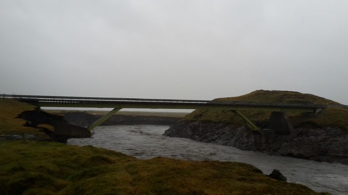 Rennslið í Skaftá eins og í litlu hlaupi vegna mikillar úrkomu Sunna Kristín Hilmarsdóttir skrifar 5. október 2015 12:28 Brúin yfir Eldvatn í gærdag. mynd/guðmundur valur Brúin yfir Eldvatn skammt frá Ytri-Ásum stendur enn en Skaftá hefur grafið mikið undan undirstöðum hennar um helgina og landið sigið vegna hlaupsins í ánni. Brúin hefur nú verið lokuð síðan á laugardag og er ekki útlit fyrir að hún verði opnuð í bráð. Guðmundur Valur Guðmundsson, brúarverkfræðingur hjá Vegagerðinni, segir erfitt að meta hvað verður um brúna. „Við erum að greina það núna hvernig staðan er og við þurfum að bíða eftir því að vatnið sjatni betur áður en við sjáum hvað þarf að gera. Það eru mjög veik jarðlög þarna sem búið er að grafa undan en við sjáum ekkert hvað þarf að gera fyrr en vatnið er búið að lækka meira,“ segir Guðmundur.Mun rigna fram á morgunNær stanslaust hefur rignt á suðausturlandi síðan í gærmorgun og því er enn mikið vatn í Skaftá. Gísli Halldór Magnússon, bóndi á Ytri-Ásum, segir að vatnsmagnið í ánni nú sé eins og í litlu hlaupi. Gísli segir það ekki góða stöðu fyrir sveitarfélagið ef að brúin fari þar sem um mikilvæga samgönguæð sé að ræða fyrir sveitina. Brúin stytti meðal annars leiðina niður á þjóðveg en ef hennar nýtur ekki við þarf að fara um Hrífunesheiði sem getur verið erfið yfirferðar á veturna.Samkvæmt upplýsingum frá Veðurstofunni mun áfram rigna á suðausturlandi í dag og fram á nótt. Aðeins mun draga úr rigningunni í dag en svo gæti hugsanlega bætt aftur í hana í nótt.Enn hætta á að flæði yfir hringveginnEnn er fylgst með því á einum stað á þjóðvegi 1 hvort að vatn muni flæða yfir veginn að sögn Víðis Reynissonar, lögreglufulltrúa á Suðurlandi. Um er að ræða stað sem er austarlega í Eldhrauni.Víðir segir að nú sé að koma betur í ljós hversu mikið tjón hafi orðið í hlaupinu.„Við munum væntanlega setjast niður í dag með aðilum eins og Bjargráðasjóði og Landgræðslunni til að koma og líta á það tjón sem orðið hefur hér.“ Hlaup í Skaftá Tengdar fréttir Óljóst hvort bændur fái tjón vegna Skaftárhlaups bætt Bóndi á svæðinu furðar sig á því að lög um viðlagatryggingu eigi ekki við um jökulhlaup. 5. október 2015 11:23 Hlaupið séð úr lofti - Myndir Skaftárhlaupið sem nú er í rénum er það langstærsta sem mælingar ná til frá 1955. 4. október 2015 11:49 Undirstöðurnar illa farnar undir brúnni Brúnni yfir Eldvatn hjá Ásum var lokað í dag vegna þess hvað aurflóðið úr Skaftárjökli hefur grafið mikið undan brúnni. 3. október 2015 20:07 „Þetta er alltaf að síga á ógæfuhliðina“ Miklar skemmdir hafa orðið á brúm, túnum og vegum vegna Skaftárhlaupsins. Þjóðvegur eitt er enn opinn þó vatn flæði víða beggja vegna við hann. Lögreglan er með viðbúnað ef til þess kemur að það þurfi að loka veginum síðar í dag eða á morgun. 3. október 2015 11:09 Mest lesið Hrindir af stað söfnun fyrir móður stúlkunnar sem lést í Suður-Afríku Innlent Málið sem Trump getur ekki losað sig við Erlent Varð vitni að ótrúlegum norðurljósum: „Mér fannst þetta magnað“ Innlent Færir nýársboðið fram á þrettándann Innlent Fjórir fluttir á sjúkrahús eftir bílveltu á Suðurlandi Innlent „Ég vil ekki nokkurn tímann sjá neitt svona aftur“ Innlent Þau eru tilnefnd sem maður ársins Innlent Ætlar ekki að beita sér í máli starfsmanns Útlendingastofnunar Innlent Leggur aftur til hverfislögreglustöð í Breiðholti Innlent Hljóti að vera komið að því að skoða öryggisgæslu við skóla Innlent Fleiri fréttir Hrindir af stað söfnun fyrir móður stúlkunnar sem lést í Suður-Afríku Varð vitni að ótrúlegum norðurljósum: „Mér fannst þetta magnað“ Færir nýársboðið fram á þrettándann Fjórir fluttir á sjúkrahús eftir bílveltu á Suðurlandi Leggur aftur til hverfislögreglustöð í Breiðholti Nú má heita Love, Tóní, Ranimosk og Draumur Kvartar til umboðsmanns og vonar að Vegagerðin sjái að sér Ætlar ekki að beita sér í máli starfsmanns Útlendingastofnunar „Ég vil ekki nokkurn tímann sjá neitt svona aftur“ Gyðingar á Íslandi upplifa aukinn ótta Ferðaþjónusta blómstrar í uppsveitum Árnessýslu „Þetta er bara ljótt“ Hljóti að vera komið að því að skoða öryggisgæslu við skóla Ætlar að skýra hvenær rjúfa megi þagnarskyldu Þagnarskylda heilbrigðisstarfsfólks og öryggisgæsla við grunnskóla Eyjólfur í orlof og Inga þrefaldur ráðherra Vegagerðin segir flóðin í Vík fyrirséð Fjölmiðlar, bókmenntir og hægrimennska á Sprengisandi „En hver sagði að þetta ætti að vera auðvelt?“ Milljónir til almannatengla og átta sinnum meira en í fyrra Grunuð um að koma til landsins til að brjóta á öldruðum Leggja hald á skip á alþjóðahafsvæði undan ströndum Venesúela Bindur vonir við Vor til vinstri Systir og amma drengs í meðferð létust í Suður-Afríku „Við erum pottþétt að koma út í mínus, hversu miklum vitum við ekki“ „Þetta er alveg ásættanlegur samningur“ Deildi nöfnum skjólstæðinga á Instagram Íslendingar þægileg fórnarlömb fyrir vasaþjófa „Að öllu óbreyttu mun þjóðvegurinn fara í sundur“ Vonbrigði í Vík og rýnt í Epstein-skjölin Sjá meira