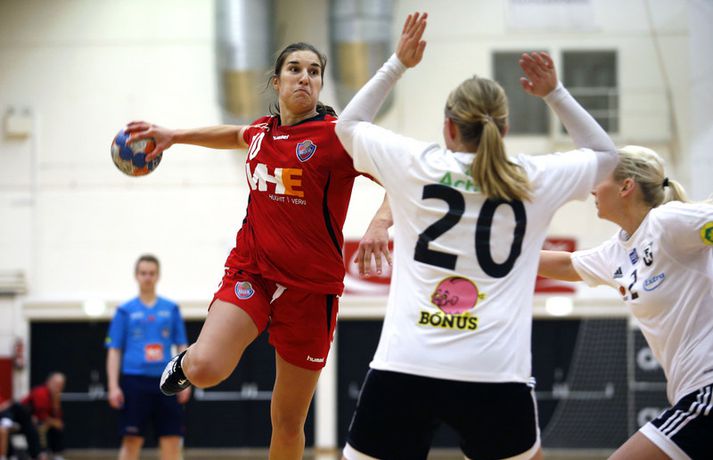 Haukakonur unnu sinn fjórða sigur í röð í Olís-deild kvenna í handbolta þegar þær sóttu tvö stig til nágranna sinn í Kaplakrika. Haukaliðið vann leikinn 31-26 og er nú í þriðja sæti deildarinnar stigi á eftir ÍBV og Gróttu sem eru jöfn á toppnum en eiga líka leiki inni á Haukanna. Heiðdís Rún Guðmundsdóttir skoraði tíu mörk fyrir FH-liðið og var markahæst á vellinum en þessi frábæra frammistaða hennar dugði ekki. Hin portúgalska Maria Ines Silva Pereira er öflugur leikmaður og hún var með níu mörk fyrir Haukaliðið í kvöld. Stefán Karlsson, ljósmyndari Vísis og Fréttablaðsins, var á leiknum í kvöld og náði þessum skemmtilegu myndum hér fyrir ofan.FH - Haukar 26-31 (12-15)Mörk FH: Heiðdís Rún Guðmundsdóttir 10, Ingibjörg Pálmadóttir 5, Sigrún Jóhannsdóttir 2, Steinunn Snorradóttir 2, Fanney Þóra Þórsdóttir 2, Birna Íris Helgadóttir 1, Rakel Sigurðardóttir 1, Arnheiður Guðmundsdóttir 1, Sara Kristjánsdóttir 1, Elín Anna Baldursdóttir 1.Mörk Haukar: Maria Ines Da Silve Pereira 9, María Karlsdóttir 6, Ramune Pekarskyte 4, Ragnheiður Ragnarsdóttir 4, Vilborg Pétursdóttir 2, Karen Ósk Kolbeinsdóttir 2, Jóna Sigríður Halldórsdóttir 2, Ragnheiður Sveinsdóttir 1, Anna Lillian Þrastardóttir 1.Maria Ines Silva Pereira skoraði 9 mörk fyrir Haukaliðið í kvöld. Vísir/Stefán