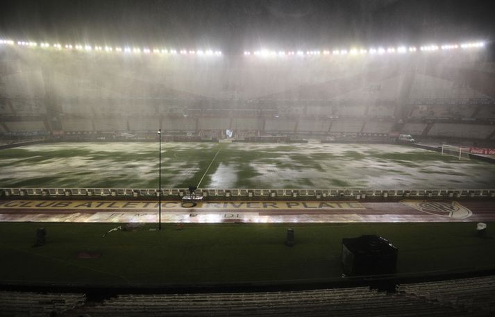 Ekkert varð af stórleiknum í nótt og þetta var ástæðan | Myndir Óskar Ófeigur Jónsson skrifar 13. nóvember 2015 11:00 Vísir/Getty Suður-Ameríku stórveldin Argentína og Brasilía áttu að mætast í mikilvægum leik í undankeppni HM 2018 í nótt en ekkert varð af leiknum. Dómarar leiksins urðu að aflýsa leiknum klukkutíma fyrir fyrsta flaut vegna hellidembu í Buenos Aires. Monumental-leikvangurinn var nánast einn stór pollur og þá gekk áhorfendum illa að komast á völlinn vegna úrhellisins. Leikurinn hefur verið settur á miðnætti í kvöld að íslenskum tíma eða klukkan 21.00 að staðartíma. „Við hittum dómarana og fulltrúa frá Argentínu og það voru allir samála um að það var kom ekki til greina að láta þennan leik fara fram við þessar aðstæður," sagði Gilmar Rinaldi, aðstoðarþjálfari Brasilíu. „Það væri bara of erfitt að spila góðan fótbolta, það voru haglél og eldingar og spáin sýndi að þetta átti bara eftir að versna," sagði Rinaldi. Leikurinn er í 3. umferð Suður-Ameríkuriðilsins og eins og er eru báðar þjóðirnar ekki meðal fimm efstu. Brasilíumenn eru með þrjú stig af sex mögulegum en Argentínumenn hafa aðeins náð í eitt stig út úr fyrstu tveimur leikjum sínum. Argentínumenn eru án margra af sínum stærstu stjörnum eins og Lionel Messi, Sergio Aguero og Carlos Tevez en Neymar, stærsta stjarna brasilíska landsliðsins er aftur á móti að snúa til baka eftir fjögurra leikja leikbann. Hér fyrir neðan má sjá nokkrar myndir af aðstæðunum í Buenos Aires í nótt.Vísir/GettyVísir/EPAVísir/GettyVísir/EPAVísir/GettyVísir/Getty Fótbolti HM 2014 í Brasilíu Mest lesið Viðurkenna að VAR hafi bilað Fótbolti Arnar Daði rekinn frá Stjörnunni en áfram þjálfari kvennaliðsins Handbolti Jólagjöf í Keflavík: Remy Martin snýr aftur Körfubolti Koepka fyrsta stjarnan sem riftir samningi við LIV Golf Úr Bestu heim í Hauka Íslenski boltinn Þessi tíu eru tilnefnd sem Íþróttamaður ársins 2025: 23 ára aldursmunur Sport Stefndi á ÓL en fannst látinn á hótelherbergi Sport Heyrði hvorki frá Blikum né Víkingum Íslenski boltinn Ótrúlegur sigur á HM: „Ég er mjög tregur svo pressan nær ekki til mín“ Sport Ruglaðar lokamínútur í Afríkukeppninni Fótbolti Fleiri fréttir Stewart, Snoop og Modric í eina sæng Mahrez batt enda á bið Alsíringa Heyrði hvorki frá Blikum né Víkingum Ruglaðar lokamínútur í Afríkukeppninni Vill ekki segja hversu lengi Bruno er frá Spyr hvort Guardiola stígi á vigtina Viðurkenna að VAR hafi bilað Úr Bestu heim í Hauka „Þetta er stærsti klúbbur Íslands“ Kaupmannahafnarbúi afgreiddi Úganda Arsenal í undanúrslit eftir vító Man. Utd reyndi stíft en Semenyo kaus City Iwobi og Lookman áberandi í sigri Nígeríu „Tölfræðilega séð eiga þeir ekkert að vera í þessari stöðu“ Amanda hætt hjá Twente Jackson hóf Afríkumótið með látum Fullkrug leysir Origi af í Mílanó Versta tímabil Vinícius í mörg ár og samningaviðræður sigla í strand Kongóliðar byrja á sigri Glódís framlengir samninginn við Bayern Chelsea setur sig í samband við Semenyo Sagan ekki sönn: „Veit ekki hvaðan þetta á að hafa komið“ Hætt við að spila í Ástralíu en óvíst hvar leikurinn verður Neymar kominn á lappir og lofar að skora í úrslitaleik HM Jiménez jafnaði bestu vítaskyttu sögunnar Slot mun sakna Isak í tvo mánuði eftir „glórulausa tæklingu“ Sjáðu „auma“ vítið sem skilaði Fulham sigri Erfitt að vera í burtu þegar mamma greindist „Svona lítur frábær ákvörðun út“ Einn leikmaður með samning og völlurinn ólöglegur Sjá meira