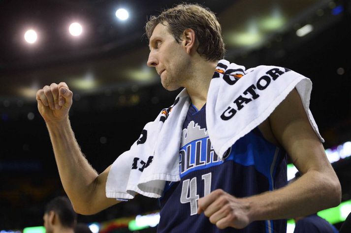 Allar reglur um stöðufót virðast fara út um veður og vind þegar kemur að þýsku körfuboltagoðsögninni Dirk Nowitzki. Dirk Nowitzki er orðinn 37 ára gamall og hann er á sínu átjánda tímabili í NBA-deildinni þar sem hann hefur spilað allan sinn feril með Dallas Mavericks. Nowitzki var með 16 stig, 10 fráköst og 4 stoðsendingar þegar Dallas Mavericks tapaði 100-96 á heimavelli í Texasslag á móti Houston Rockets á dögunum. Það sem vakti þó einna mesta athygli úr þessum leik þegar Dirk Nowitzki fékk hreinlega að dansa með boltann í höndunum þegar James Harden var að reyna að dekka kappann. James Harden er sautján sentímetrum lægri en Dirk og langt frá því að vera í hópi bestu varnarmanna NBA-deildarinnar. Hann mátti því ekki við því að Þjóðverjinn fengi að fara svona frjálslega með skrefaregluna. James Harden hafði samt betur á endanum. hann skoraði fleiri stig (25) en Dirk Nowitzki og gaf líka fleiri stoðsendingar (9) í leiknum. Það sem skipti síðan aðalmáli er að James Harden og félagar í Houston Rockets unnu leikinn. Dallas Mavericks hefur unnið 12 leiki af 21 í byrjun tímabilsins og er eins og er í fjórða sæti Vesturdeildarinnar. Dirk Nowitzki er að skora 17,5 stig í leik og hitta úr 50,2 prósent skota sinna sem eru aðeins hærri tölur en í fyrra. Dansinn hans Dirk Nowitzki fór ekkert framhjá fólkinu á The Senior Basketball Analyst sem settu myndbrot með þessari löglegu en samt ólöglegu hreyfingu Dirk Nowitzki inn á Vine-síðu sína. Hún er hér fyrir neðan og þar er sjón sögu ríkari.