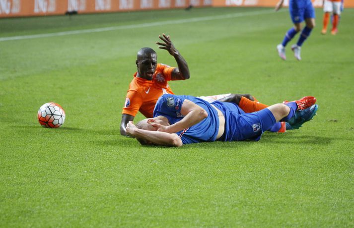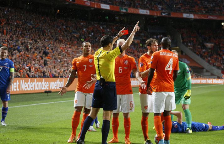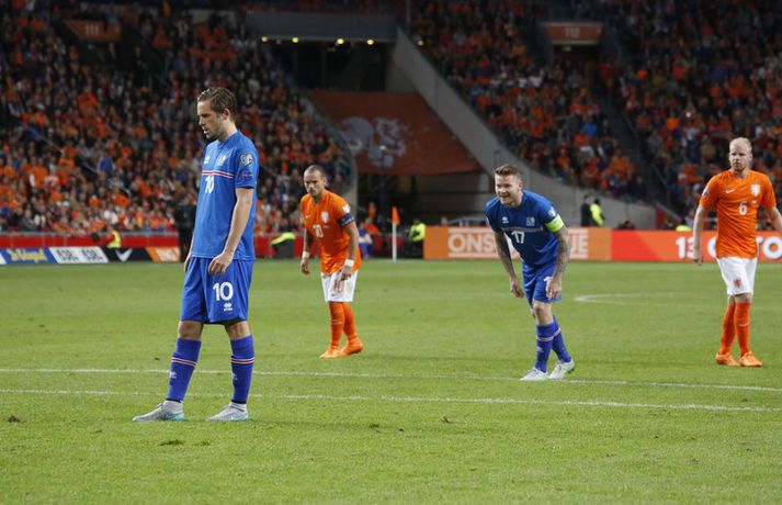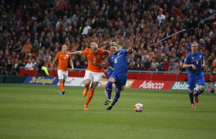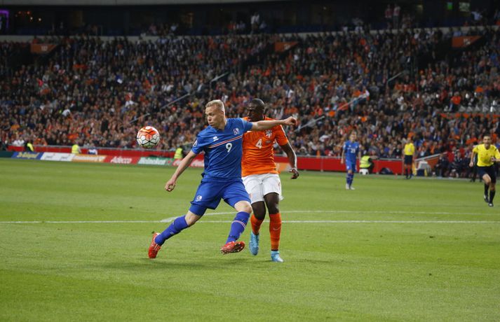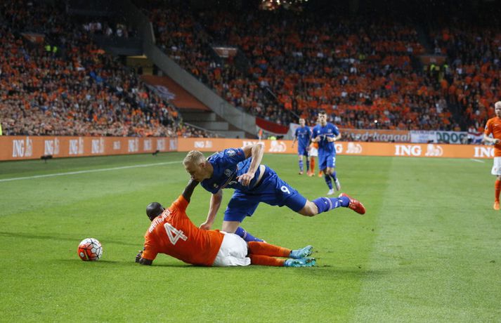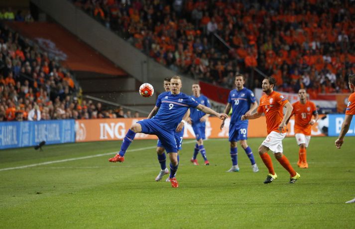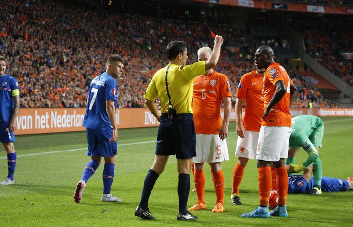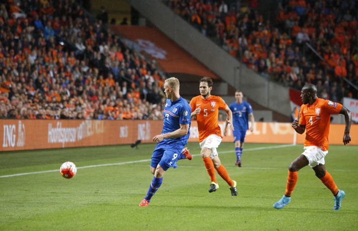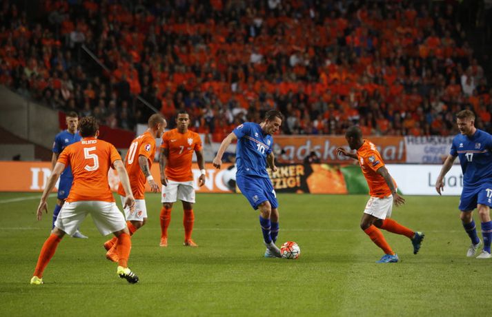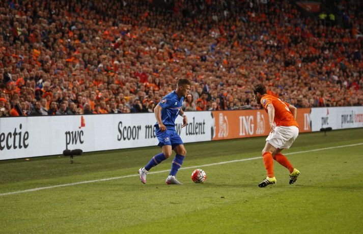 Íslenska fótboltalandsliðið er komið með níu tær inn á Evrópumótið í Frakklandi næsta sumar eftir 1-0 sigur á Hollandi á Amsterdam Arena í kvöld. Gylfi Þór Sigurðsson skorað eina markið úr vítaspyrnu snemma í síðari hálfleik eftir að brotið var á Birki Bjarnasyni. Okkar menn spiluðu manni fleiri í sextíu mínútur eftir ða Bruno Martins Indi, varnarmanni Hollands, var réttilega vísað af velli eftir að hafa slegið til Kolbeins Sigþórssonar.Valgarður Gíslason var á leiknum á Amsterdam í kvöld og náði þessum skemmtilegu myndum hér fyrir ofan og fyrir neðan. Íslenska liðið hefur náð í átján stig í fyrstu sjö leikjum sínum í riðlinum og hefur átta stiga forskot á Holland þegar aðeins níu stig eru eftir í pottinum. Það þýðir að liðið vantar bara eitt stig til að tryggja það að Hollendingar geti ekki komist upp fyrir Ísland. Um er að ræða sögulegan leik fyrir margar sakir. Aldrei hefur Ísland verið í svo góðri stöðu áður í undankeppni stórmóts þegar þrír leikir eru eftir. Hollendingar hafa auk þess aldrei tapað keppnisleik á Amsterdam Arena. Engin þjóð hefur áður, frá upphafi stórmóta í knattspyrnu, lagt Holland að velli í báðum leikjunum í riðlinum.Vísir/ValliVísir/ValliVísir/ValliVísir/ValliVísir/ValliVísir/Valli