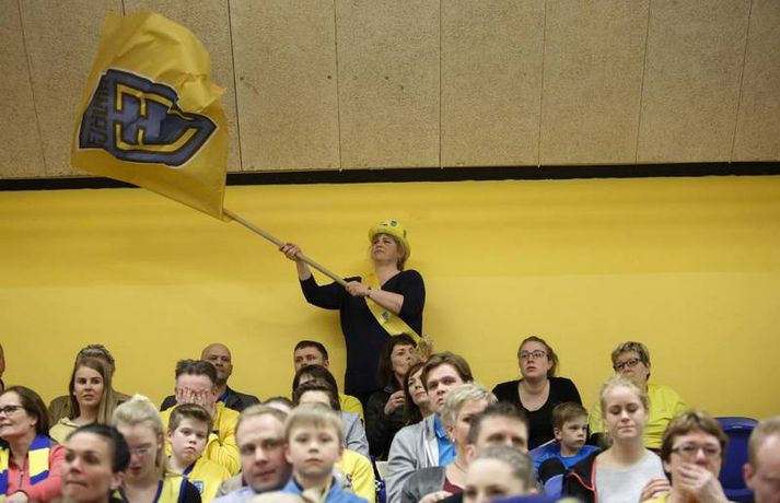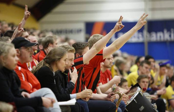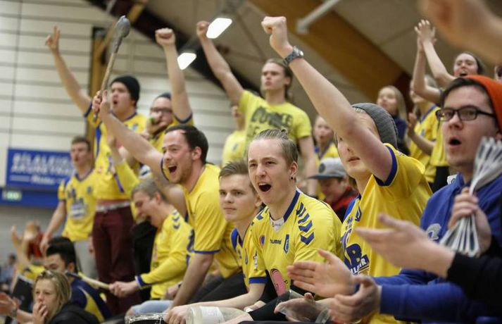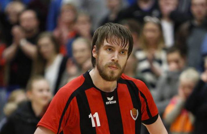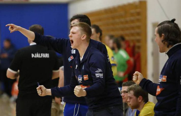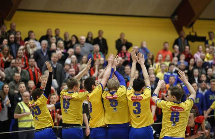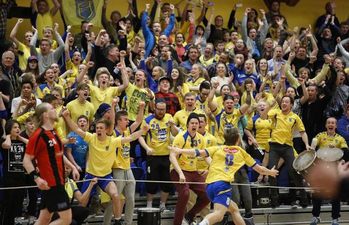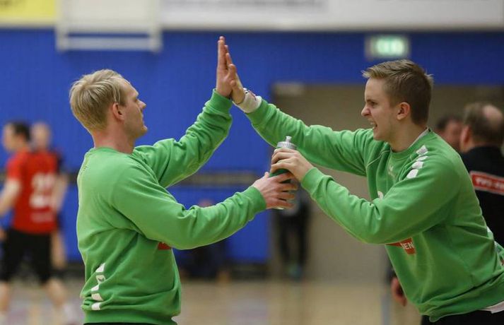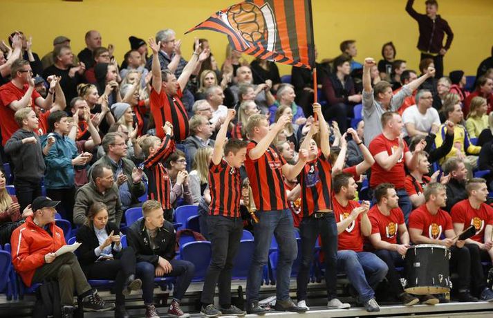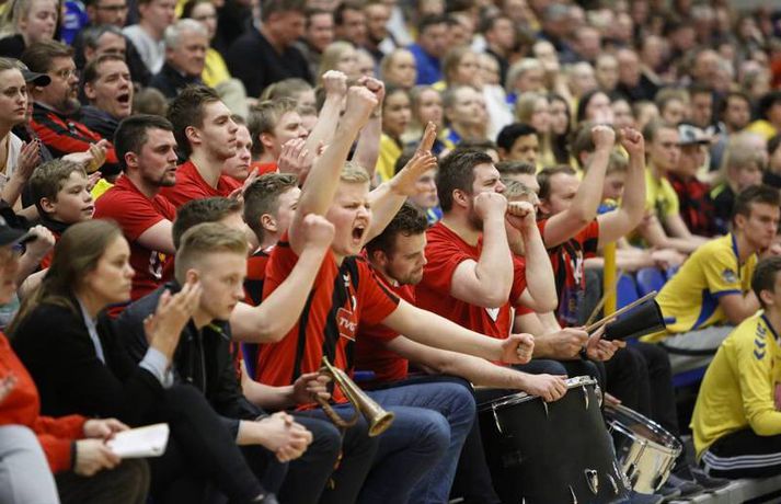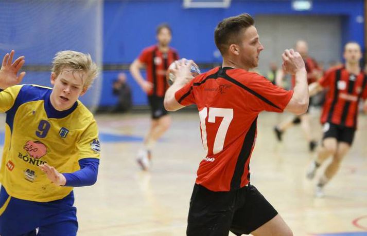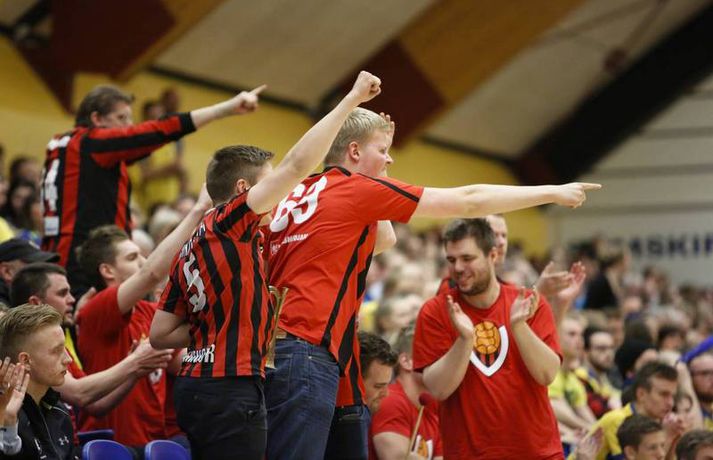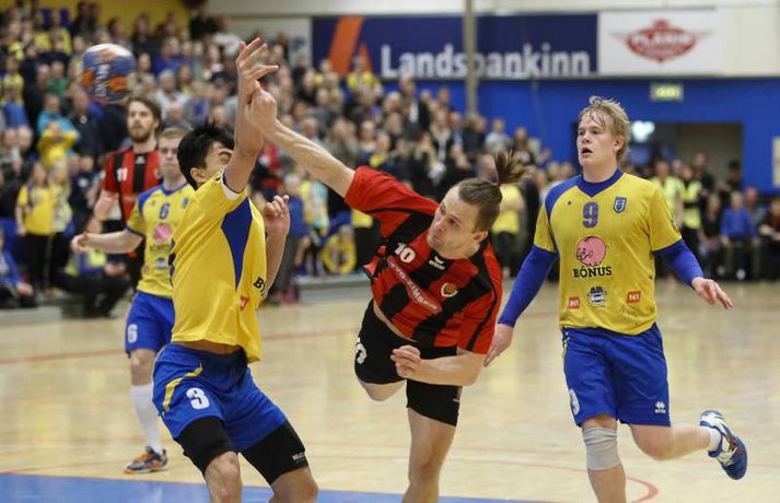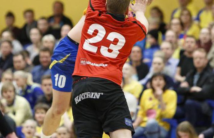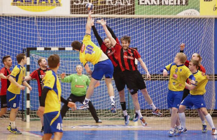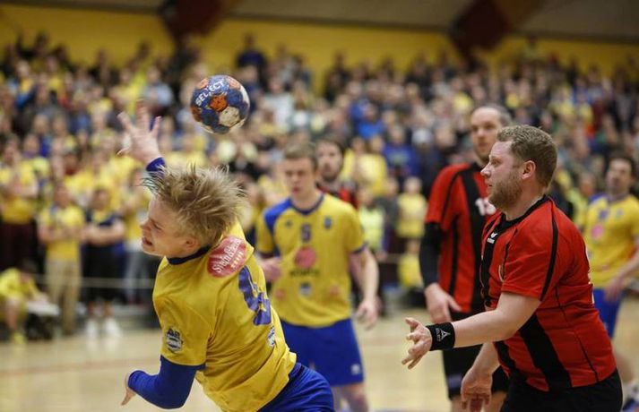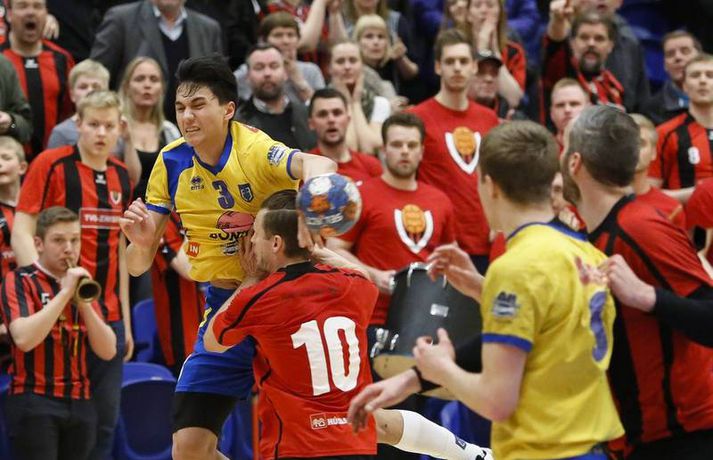 Fjölnir vann dramatískan sigur á Víkingi í fjórða leik liðanna um laust sæti í Olís-deild karla í handbolta á næsta tímabili.Ernir Eyjólfsson, ljósmyndari Vísis og Fréttablaðsins, var á leiknum og náði þessum myndum hér fyrir ofan. Leikurinn var framlengdur og réðist á lokasekúndum hennar þegar Kristján Örn Kristjánsson tryggði heimamönnum sigurinn með ótrúlegu marki. Lokatölur 24-23 en liðin mætast í oddaleik í Víkinni á fimmtudaginn. Víkingar byrjuðu leikinn betur gegn Fjölnisliði sem virkaði yfirspennt. Gestirnir komust í 1-4 en Fjölnismenn svöruðu með þremur mörkum í röð. Kristján skoraði tvö þessara marka en þessi 17 ára skytta var allt í öllu í sóknarleik Fjölnis í fyrri hálfleik. Gríðarlegt efni þessi strákur og hefur alla burði til að ná langt. Fjölnismenn náðu smám saman betri tökum á leiknum og voru duglegir að refsa Víkingum fyrir mistök þeirra í sókninni með hraðaupphlaupum. Heimamenn breyttu stöðunni úr 7-8 í 12-9 með góðum leik. Þá var Ágústi Jóhannssyni, þjálfara Víkings, nóg boðið og tók sitt annað leikhlé á fjögurra mínútna kafla. Eitthvað hefur landsliðsþjálfarinn sagt því hans menn ráku af sér slyðruorðið og luku fyrri hálfleiknum með 4-0 kafla og leiddu með einu marki í hálfleik, 12-13. Einar Baldvin Baldvinsson átti hvað stærstan þátt í þessum umsnúningi en þessi efnilegi markvörður varði sjö skot eftir að hann kom inn á um miðjan fyrri hálfleik. Fjölnismenn byrjuðu seinni hálfleikinn af gríðarlegum krafti, skoruðu þrjú fyrstu mörk hans og náðu tveggja marka forskoti, 15-13. Víkingar skoruðu tvö af næstu þremur mörkum en í stöðunni 16-15 komu þrjú Fjölnismörk í röð og staðan orðin 19-15, heimamönnum í vil. Frábær kafli hjá Fjölnisliðinu sem vann fyrstu 11 mínútur seinni hálfleiks 7-2. En eftir þessa frábæru byrjun á seinni hálfleik kom bakslag í sóknarleik Fjölnismanna sem töpuðu hverjum boltanum á fætur öðrum. Víkingar minnkuðu muninn í eitt mark, 19-18, og virtust líklegir til að láta kné fylgja kviði. En þrátt fyrir vandræðin í sókninni var varnarleikur Fjölnis sterkur og þá varði Ingvar Guðmundsson vel í markinu. Það varð þeim til happs þegar uppi var staðið. Heimamenn komust þremur mörkum yfir, 21-18, en sem fyrr komu Víkingar til baka. Sigurður Eggertsson jafnaði metin í 21-21 með sínu fimmta marki en Sveinn Þorgeirsson svaraði með marki hinum megin. Ingvar varði í tvígang frá Víkingum í næstu sókn þeirra. Fjölnismenn fengu svo tækifæri til að gulltryggja sér sigurinn en glutruðu boltanum frá sér einu sinni sem oftar í seinni hálfleik. Víkingar brunuðu fram og Jónas Bragi Hafsteinsson jafnaði metin í 22-22 með sínu fyrsta marki. Fjölnismenn tóku leikhlé þegar 28 sekúndur voru eftir og að því loknu fékk Arnar Ingi Guðmundsson ágætis færi en Magnús Erlendsson varði. Víkingum tókst ekki að skora á þeim sekúndum sem eftir voru og því þurfti að framlengja. Jóhann Reynir Gunnlaugsson skoraði fyrsta mark framlengingarinnar úr vítakasti og kom Víkingi í 23-22. Og þannig var staðan fram á lokasekúndur fyrri hálfleiksins þegar Arnar Ingi jafnaði með hálfgerðu flautumarki. Sama baráttan hélt áfram í seinni hálfleiknum þar sem hvorugt liðið virtist geta keypt sér mark. Í lokasókn Víkings varði Ingvar frá Arnari Frey Theodórssyni. Fjölnismenn sneru vörn í sókn og boltinn barst á Kristján sem brunaði fram eins og eimreið og þrumaði svo boltanum framhjá Magnúsi, góðum markverði Víkinga. Ótrúlegir endir á mögnuðum leik. Kristján var markahæstur í liði Fjölnis með sjö mörk en alls skoruðu níu leikmenn liðsins í kvöld. Jóhann Reynir var atkvæðamestur í liði Víkings með 10 mörk.Arnar: Megum ekki vera of góðir með okkur Arnar Gunnarsson, þjálfari Fjölnis, var merkilega yfirvegaður eftir ótrúlegan sigur Grafarvogspilta á Víkingi í kvöld. „Hvað er eiginlega hægt að segja? Ég er ánægður að vera kominn í þessa stöðu sem fáir höfðu trú á,“ sagði Arnar. „Ég er stoltur af strákunum en við megum ekki vera of góðir með okkur. Það er einn leikur eftir.“ Fjölnismenn leiddu mestallan leikinn en Víkingar komu alltaf til baka. Arnar sagði það ekkert óeðlilegt. „Það er kannski eðlilegt, þeir eru með hörkulið. En við vorum sterkari í heildina og hefðum átt að klára þetta í venjulegum leiktíma en það var sterkt að klára þetta í framlengingunni,“ sagði Arnar en við hverju býst hann í oddaleiknum á fimmtudaginn? „Ég býst við hörkuleik eins og þessir leikir hafa verið, þ.e.a.s. þrír síðustu leikir. „Við mætum fullir sjálfstrausts og tilhlökkunar,“ sagði þjálfarinn sem hrósaði stuðningsmönnum Fjölnis sem voru fjölmargir í Dalhúsum í kvöld en stemmningin á leiknum var lygileg. „Ég var að rifja það upp um daginn að þegar ég kom fyrst hingað í sumar spurði ég hvað húsið tæki marga. Það var sagt að það skipti engu máli, það yrði aldrei fullt hús í vetur. En það er búið að vera fullt í síðustu leikjum sem er ánægjulegt.“Kristján Örn: Lofa sigri á fimmtudaginn „Ég pældi ekki neitt. Ég hljóp að markinu, leit á klukkuna og sá að það voru sjö sekúndur eftir og skaut bara,“ sagði Kristján Örn Kristjánsson, hetja Fjölnismanna, eftir sigurinn ótrúlega á Víkingi í kvöld en Kristján tryggði Fjölni sigurinn með marki á lokasekúndum framlengingarinnar og þar með oddaleik í einvíginu. „Við gáfum 100% í þennan leik og það var ekkert gefið eftir. „Við ákváðum að massa þetta,“ sagði Kristján en var hann farinn að hafa áhyggjur þegar Víkingar komu aftur og aftur til baka í leiknum? „Nei, ekkert rosalega miklar. Við vorum yfir nær allan 