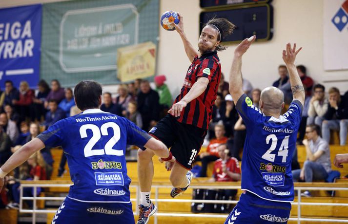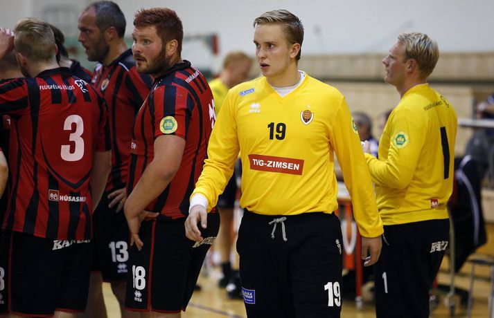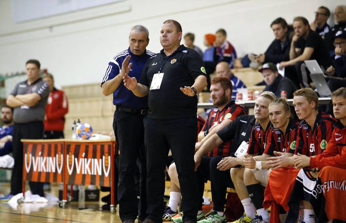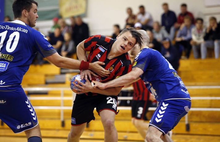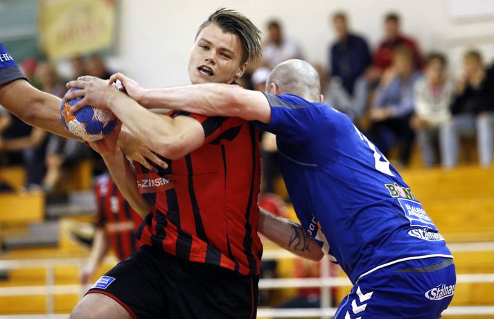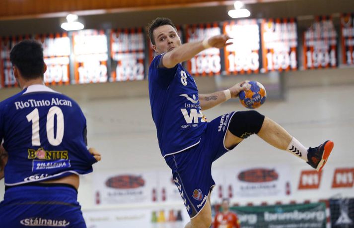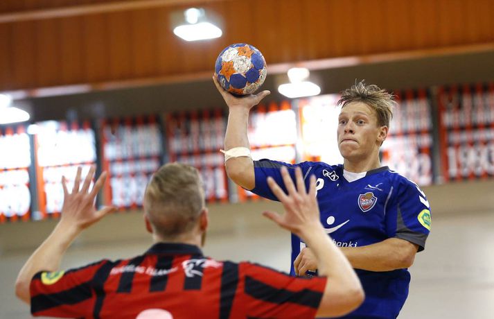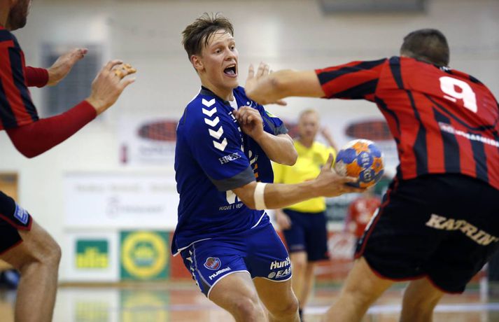 Umfjöllun, viðtöl og myndir: Víkingur - Haukar 19-28 | Meistararnir byrja á sigri Anton Ingi Leifsson í Víkinni skrifar 9. september 2015 21:15 vísir/stefán Íslandsmeistar Hauka áttu ekki í teljandi vandræðum með að leggja nýliða Víkinga af velli í fyrstu umferð Olís-deildar karla. Lokatölur urðu níu mark sigur meistarana, 28-19, en staðan í hálfleik 14-8. Heimamenn voru vel inni í leiknum í fyrri hálfleik, en slæmur lokakafli gerði þeim erfitt fyrir. Staðan í hálfleik 14-8, eins og fyrr segir, og í síðari hálfleik var þetta formsatriði fyrir gestina sem unnu að lokum níu marka sigur, 29-18. Stefán Karlsson, ljósmyndari Vísis og Fréttablaðsins, var í Víkinni í kvöld og má sjá myndasafn hans hér efst í fréttinni. Fyrsta markið var Víkinga sem voru að skora sitt fyrsta mark í efstu deild í sex ár. Það slökknaði aðeins á þem eftir það og Haukarnir gengu á lagið. Haukarnir skoruðu sex mörk í röð og lokuðu gjörsamlega á sóknarleik Víkinga með virkilega góðum varnarleik. Staðan 6-1 eftir stundarfjórðung. Þá vöknuðu hins vegar nýliðarnir aftur við sér. Jóhann Reynir Gunnlaugsson skoraði þeirra annað mark eftir stundarfjórðung eftir að þeirra fyrsta kom á annari mínutu og við tók 4-1 kafli hjá Víking sem komu sér aftur inn í leikinn. Þeir fóru að spila mun betur eftir að þeir Bjartur Guðmundsson og Arnór Þorri komu í útilínuna og Bjartur stjórnaði spilinu vel. Eftir að Daníel Örn Einarsson hafði minnkað muninn í eitt mark þegar sex mínútur voru til hálfleiks hrukku Íslandsmeistararnir aftur í gírinn. Þeir skelltu vörninni í lás, Víkingarnir fóru að taka óskynsamleg skot og lokakfali fyrri hálfleiks endaði með 5-1 kafla. Haukarnir sex mörkum yfir í hálfleik, 14-8, og síðari hálfleikurinn formsatriði fyrir meistarana. Síðari hálfleikurinn þróaðist svipaður og sá fyrri. Haukarnir höfðu töggl og haldir á lykilköflum leiksins, en inn á milli spiluðu Víkingarnir fínan bolta. Þess á milli duttu þeir oft á tíðum í óðagot og voru að kasta boltanum útaf eða voru of ákafir og skutu eftir fáeinar sekúndur í sókn. Víkingar náðu mest að minnka muninn í fögur mörk í síðari hálfleiks, en Haukavélin mallaði og mallaði. Þegar tíu mínínútur voru eftir var munurinn sjö mörk. Haukarnir voru aldrei í neinum vandræðum í síðari hálfleik, en Víkingarnir þurfa að laga margt og mikið fyrir næstu leiki þó það sé auðvitað erfitt að byrja á að spila gegn meisturunum. Ríkjandi meistararnir fengu þó full mörg auðveld mörk, úr hraðaupphlaupum og seinni bylgjum, og ég er viss um að það er eitthvað sem Ágúst Jóhannsson væri til í að laga fyrir næstu leik. Leikurinn í kvöld var framför hjá Haukunum frá leiknum í meistari meistaranna þar sem þeir töpuðu fyrir ÍBV, en lokatölur urðu níu marka sigur Hauka; 28-19. Janus Daði Smárason var frábær í liði Hauka og skoraði átta mörk og fiskaði eitt víti, en hann og Tjörvi Þorgeirsson stýrðu sóknarleik Hauka af mikilli festu. Leið og þeir stigu út af sporinu - riðlaðist sóknarleikurinn, en spili þeir eins og best verður á kosið í vetur verða önnur lið í vandræðum. Jóhann Reynir Gunnlaugsson reyndist langmarkahæsti maður nýliðanna, en hann skoraði átta mörk í kvöld þar af þrjú úr hraðaupphlaupum. Ægir Hrafn Jónsson, varnartröllið, kom næstur með þrjú mörk úr þremur skotum.Janus átti góðan leik í kvöld.vísir/stefánJanus Daði: Nú fer maður heim og hlaðar batteríin fyrir Ítalíu „Þetta var ágætt. Þetta var skref upp á við frá því í síðasta leik, en við erum smá ryðgaðir á köflum,” sagði Janus Daði, leikmaður Hauka, en hann átti afar góðan leik. „Við eigum það til að vera full fljótir að detta í hálfgert kæruleysi. Þá erum við helvíti slakir - þó það gangi af og til. Þetta er eitthvað sem við tökum með okkur til Ítalíu á morgun.” Haukarnir byrjuðu af miklum krafti og voru komnir í 6-1 eftir einungis nokkrar mínútur þrátt fyrir að Víkingar hafi skorað fyrsta markið. Janus er ekki viss um að samherjar hans hafi hugsað að þetta væri strax komið í upphafi leiks. „Ég veit það nú ekki. Þetta hefur aðeins verið vofandi yfir okkur og var einnig í fyrra. Við þurfum að sýna það að við erum meistaraefni og klára svona leiki þegar tækifæri gefst,” en hann segir þetta skref upp á við frá tapleiknum gegn ÍBV í meistari meistaranna á dögunum. „Algjörlega. Þar erum við ekki með í fyrri hálfleik, en í dag byrjum við leikinn af krafti og erum mættir frá fyrstu mínútu svo við byggjum á því.” „Nú fer maður heim og hvílir sig og reynir að hlaða aðeins batteríin fyrir Ítalíu,” en Haukarnir halda á morgun til Ítalíu þar sem liðið mætir ítölsku liði í Evrópukeppninni. Hvernig metur Janus möguleikana fyrir þessa leiki? „Annað hvort töpum við eða vinnum, er það ekki bara þannig? Við höfum hort aðeins á þá, en það er erfitt að gefa sér mynd hvernig þeir eru. Við þurfum bara að mæta klárir,” sagði Janus að lokum.Ægir Hrafn: Erum sjálfum okkur verstir „Mér fannst þetta vera full stórt tap. Við erum sjálfum okkur verstir. Við erum alltaf að narta í þá, en þá koma tæknifeilar og óþarfa mistök. Það vantaði ekki mikið uppá að þetta yrði leikur,” sagði Ægir Hrafn Jónsson, fyrirliði Víkings, við Vísi í leikslok. „Við lögðum upp með að vera skynsamir sóknarlega og að stilla upp í vörninni. Mér fannst þeir vera í vandræðum með okkur varnarlega.” Víkingar áttu afleitan kafla undir lok fyrri hálfleiks. Þeir höfðu minnkað muninn í eitt til tvö mörk, en Haukar skoruðu sex af síðustu sjö mörkum fyrri hálfleiks og voru sex mörkum yfir í hálfleik. H