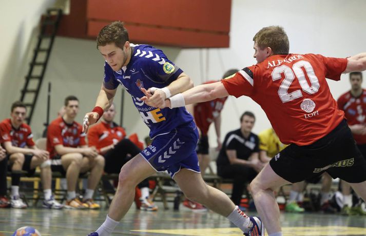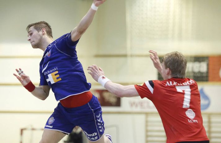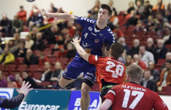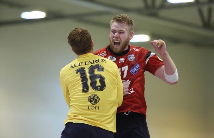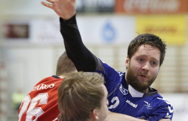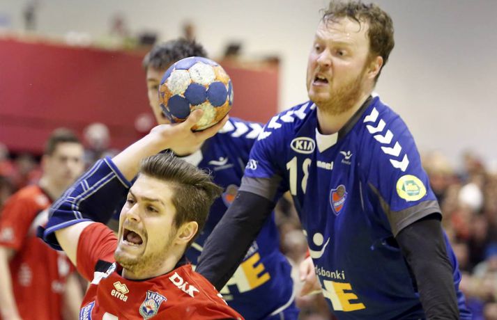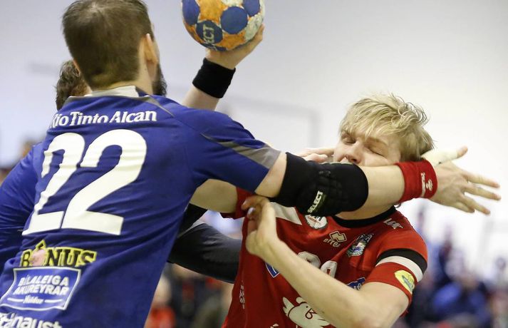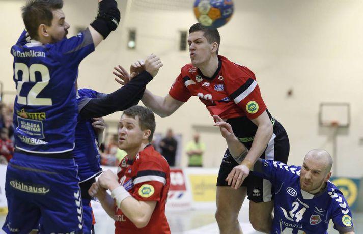 Afturelding og Haukar skildu jöfn í annað sinn í vetur þegar liðin mættust í N1-höllinni í Mosfellsbæ í 20. umferð Olís-deildar karla í kvöld. Lokatölur 25-25. Davíð Svansson reyndist hetja Mosfellinga en hann varði vítakast Þrastar Þráinssonar þegar leiktíminn var liðinn og tryggði sínum mönnum annað stigið.Valgarður Gíslason, ljósmyndari Fréttablaðsins og Vísis, var að Varmá í kvöld og tók myndirnar sem fylgja umfjölluninni. Haukarnir höfðu unnið alla fjóra leiki sína eftir áramót - þrjá í deild og einn í bikar - og þeir byrjuðu betur. Tjörvi Þorgeirsson fór vel af stað og skoraði þrjú af fimm fyrstu mörkum gestanna sem komust í 5-8 eftir 12 mínútna leik. Þá sögðu Mosfellingar hingað og ekki lengra, vörnin styrkist og Davíð var vel með á nótunum þar fyrir aftan. Í sókninni leystu heimamenn ítrekað inn á línu gegn framliggjandi vörn Hauka sem bar góðan árangur. Afturelding skoraði sjö mörk í röð og komst fjórum mörkum yfir, 12-8. Sóknarleikur var afar slakur á þessum kafla en gestirnir skoruðu ekki mark í 10 mínútur.Örn Ingi Bjarkason fær högg frá Matthíasi Árna Ingimarssyni.vísir/valliEn Haukar gáfust ekki upp og jöfnuðu metin í 12-12. Mosfellingar voru mikið út af á þessum kafla en dómarar leiksins, þeir Jónas Elíasson og Anton Gylfi Pálsson, lögðu nokkuð stranga línu. Þröstur var drjúgur fyrir Hauka á lokamínútum fyrri hálfleiks en hann skoraði þrjú af fimm síðustu mörkum liðsins í hálfleiknum. Eftir vel útfærða lokasókn sem Birkir Benediktsson batt endahnútinn á fór Afturelding með tveggja marka forystu til búningsherbergja, 15-13. Hugur Haukamanna virtist hafa orðið eftir í klefanum því Hafnfirðingar voru ekki með í upphafi seinni hálfleiks þar sem Mosfellingar skoruðu hvert markið á fætur öðru. Afturelding byrjaði seinni hálfleikinn á 5-1 kafla og leiddi með sex mörkum, 20-14, þegar rúmar 20 mínútur voru eftir af leiknum. En líkt og í fyrri hálfleik neituðu Haukar að gefast upp og þeir fóru að saxa á forskot heimamanna. Gestirnir breyttu vörn og í sókninni leituðu þeir mikið til Heimis Óla Heimssonar sem skoraði sjö mörk af línunni í kvöld. Heimir skoraði m.a. fimm af sex síðustu mörkum Hauka sem fengu gullið tækifæri til að hirða stigin tvö, en Davíð kom í veg fyrir það eins og fyrr sagði. Línumaðurinn Pétur Júníusson átti afbragðsleik fyrir Aftureldingu, jafnt í vörn sem sókn. Hann var markahæstur í liði heimamanna með fimm mörk, líkt og Örn Ingi Bjarkason, Jóhann Jóhannsson og nafni hans Gunnar Einarsson. Þá skilaði Kristinn Bjarkason fjórum mörkum úr vinstra horninu. Davíð stóð fyrir sínu með 16 skot varin, þ.á.m. vítið mikilvæga undir lokin. Heimir Óli var markahæstur í liði Hauka með sjö mörk, en Þröstur kom næstur með fimm.Stuðboltarnir Davíð Svansson og Pétur Júníusson fagna marki.vísir/valliDavíð: Hvað gerir maður ekki fyrir sjónvarpið? Davíð Svansson tryggði Aftureldingu annað stigið gegn Haukum í Olís-deild karla í kvöld en hann varði vítakast Þrastar Þráinssonar þegar leiktíminn var liðinn. "Hvað gerir maður ekki fyrir sjónvarpið?" sagði Davíð léttur eftir leikinn sem var sýndur í beinni útsendingu á RÚV Íþróttum. Markvörðurinn knái hefði þó viljað fá bæði stigin úr leik kvöldsins. "Þetta var tapað stig, klárlega. Síðasta korterið í leiknum var skelfilegt, bæði sóknar- og varnarlega. "Við glutruðum boltanum frá okkur í sókninni og jafnvel í hraðaupphlaupum. Og svo skorar Heimir (Óli Heimisson, leikmaður Hauka) fullt af mörkum af línunni. "Það var ekki gott," sagði Davíð sem var þó ánægður með spilamennsku Aftureldingar lengst af. "Ég var heilt yfir ánægður með leikinn. Þetta var svona upp og ofan, en þokkalegt í gegnum allan leikinn. "Við vorum mjög góðir framan af í seinni hálfleik en svo gerist eitthvað. Það var eins og við ætluðum að vinna leikinn einn, tveir og núna," sagði Davíð sem er sáttur með uppskeruna eftir HM-hléið en Mosfellingar hafa krækt í sjö stig af átta mögulegum. "Við erum sáttir með öll stig sem við fáum. Við erum búnir að fá 13 stig í hvorri umferð - fyrstu og annarri - og við erum á góðri leið með að ná því í þeirri þriðju."Patrekur Jóhannesson var ánægður með endurkomuna.vísir/valliPatrekur: Hægt að fara í alls konar orðaleiki Patrekur Jóhannesson, þjálfari Hauka, var ánægður með margt í leik sinna manna í jafnteflinu gegn Aftureldingu í kvöld. En hvort lítur hann á stigið sem unnið eða tapað? "Þetta var eitt stig," sagði Patrekur og hló við. "Það er hægt að fara í alls konar orðaleiki. Þeir voru 20-14 yfir á heimavelli en við erum yfir og áttum að vinna þá í lokin, að mér fannst. "Við komum vel inn í leikinn og byrjunin var góð en svo kemur kafli þar sem ekkert gekk upp, lítil markvarsla og vörnin var ekki nógu beitt. Og byrjun seinni hálfleiks var engan veginn nógu góð. "En við breyttum aðeins í lokin, tókum Örn Inga (Bjarkason) út, vorum aftarlega á línumanninn og létum þá koma svolítið inn á miðsvæðið sem gekk mjög vel. "Við komumst inn í leikinn og fáum svo möguleika til að klára þetta," sagði Patrekur sem var ánægður með línuspil Hauka í leiknum en Heimir Óli Heimisson skoraði sjö mörk af línunni í kvöld. "Það gekk mjög vel. Árni (Steinn Steinþórsson) var líka að spila vel fyrir hornið. Við unnum vel saman, tveir og tveir, og fundum góðar lausnir á varnarleik þeirra." Haukar hafa fengið sjö stig af átta mögulegum eftir HM-hléið og Patrekur er ánægður með uppskeruna. "Við erum að spila betur en fyrir áramót en slæmu kaflarnir í kvöld voru lengri en þeir hafa verið og við þurfum að laga það fyrir næs