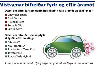 Reglubreyting borgarinnar fækkar visthæfum bílum Jóhann Óli Eiðsson skrifar 9. janúar 2015 07:30 Bílastæðaklukka í visthæfum bíl og Runólfur Ólafsson, framkvæmdastjóri FÍB. vísir/ernir/auðunn Reykjavíkurborg herti um áramótin reglur um hvaða bílar teljast visthæfir og hverjir ekki. Síðan 2011 hafa visthæfir bílar getað lagt frítt í gjaldskyld bílastæði borgarinnar í allt að níutíu mínútur. Fjöldi bifreiða fellur úr visthæfa flokknum með breytingunum og munu eigendur þeirra ekki geta nýtt sér þennan valkost. Áður töldust bílar visthæfir ef þeir losuðu minna en 120 grömm af koltvísýringi á hvern kílómetra í blönduðum akstri en þetta mark hefur nú verið lækkað niður í hundrað grömm. Bifreiðar sem ganga fyrir vetni, rafmagni og metani falla einnig í flokk visthæfra ökutækja. Bílarnir mega í mesta falli vera 1.800 kílógrömm að þyngd og mega ekki vera á negldum vetrardekkjum. Í upplýsingum frá Samgöngustofu kemur fram að 11.432 skráðar bifreiðar hafi losað á bilinu 100-120 grömm af koltvísýringi á hvern kílómetra. Sá fjöldi hefur talist óvisthæfur frá áramótum. Að auki vantar upplýsingar um tvinnökutæki. Á vefsíðu Bílgreinasambandsins má finna lista yfir bíla sem brenna bensíni, dísilolíu eða metani og uppfylla skilyrðin til að teljast visthæfir bílar. Á þeim lista eru rúmlega níutíu tegundir en aðeins tæpur þriðjungur þeirra uppfyllir nú skilyrðin til að teljast visthæfur. Rétt er að taka fram að listinn var síðast uppfærður í sumar og er ekki tæmandi talning á þeim ökutækjum er uppfylla skilyrðin.Fjölmargar bílategundir teljast ekki lengur visthæfar.„Það er bagalegt að það sé ráðist í þessar breytingar svo snöggt,“ segir Runólfur Ólafsson, framkvæmdastjóri Félags íslenskra bifreiðaeigenda (FÍB). „Þetta getur verið einn af þeim hlutum sem hefur áhrif á ákvörðun neytenda um hvaða bíll verður fyrir valinu.“ Á heimasíðu FÍB má finna tilkynningu þar sem vakin er athygli á breytingunni. Þar er bent á að hún hafi lítið verið auglýst. Félagið hafi eingöngu fundið færslu þann 12. desember síðastliðinn á Facebook-síðu Bílastæðasjóðs og á vef sjóðsins með ódagsettri tilkynningu. Runólfur bætir því við að einhverjir séu nýbúnir að fá sér bíl sem féll áður í visthæfan flokk en sé þar ekki lengur. Aðrir gætu hafa pantað sér visthæfan bíl en á meðan þeir biðu eftir honum hafi hann fallið úr flokknum með einu pennastriki. „Þetta eru ekki vinnubrögð í anda þess sem við viljum sjá. Svona breytingar ætti að auglýsa með miklum fyrirvara,“ segir Runólfur. Mest lesið Hljóp inn í brennandi byggingu til að bjarga nágrannanum Innlent „Hættulegasti maður Noregs“ fannst látinn í fangaklefa Erlent Svona mun Suðurlandsbraut líta út Innlent Hótaði málþófi vegna veiða sem tengdasonurinn stundar Innlent Tæplega þrjátíu prósent Tesla Y þurftu í endurskoðun Innlent Sveitarstjóra ekki heimilt að banna hundahald Innlent „Við eigum ekki að vera hrædd við að taka umræðuna“ Innlent Afi fór ekki yfir strikið með meintri rassskellingu Innlent Ellefu meðlimir glæpafjölskyldu teknir af lífi í Kína Erlent Saksóknarar hóta uppreisn í Minneapolis Erlent Fleiri fréttir Hafði aldrei heyrt um handbolta fyrr en hún kynntist handboltaóðu þjóðinni Auglýsa forskráningu í skóla í Grindavík Segir ekkert náttúrulögmál að bílasalar þurfi að velta hækkunum út í verðlagið Þrjár hlutu heiðursverðlaun Fimm handteknir grunaðir um skipulagðan þjófnað Ráðherra situr fyrir svörum, gleðitíðindi og konan sem hafði aldrei heyrt um handbolta Seinka sýningum fyrir leikinn Óbirt svör og starfslokin tekin fyrir Tæplega þrjátíu prósent Tesla Y þurftu í endurskoðun Mikil andstaða við nýtt 160 herbergja hótel á Laugarvatni Á fjórða hundrað vilja á lista Sjálfstæðisflokks í Reykjavík Hótaði málþófi vegna veiða sem tengdasonurinn stundar Svona mun Suðurlandsbraut líta út Kannast ekki við tilraunir til að stofna nýtt Vélfag Ljósið flytur í Grafarvog Launin lækkuð um 97 prósent en ekki afnumin „Við eigum ekki að vera hrædd við að taka umræðuna“ Pallborðið: Aðstoðarmenn, bæjarstjóri og viðskiptafræðingur Viðreisnarfélögum fjölgað um helming fyrir prófkjör Afi fór ekki yfir strikið með meintri rassskellingu Guðjón endurkjörinn og Simon líka Mannabreytingar samráðsfunda eins og tiltekt á jólakortalista Óttast vaxtahækkanir vegna sleggjunnar sem stjórnvöld „fengu í trýnið“ Verðbólgan eykst en loðnan gleður Bein útsending: Opinn fundur um áfallaþol Íslands Sakar mótframbjóðanda um trúnaðarbrest og kallar eftir prófkjöri Leigubílar verði á lituðum númeraplötum Alltaf til í slaginn en vonar að samningar haldi Vísar ásökunum um óeðlileg afskipti í kosningabaráttu á bug Sveitarstjóra ekki heimilt að banna hundahald Sjá meira