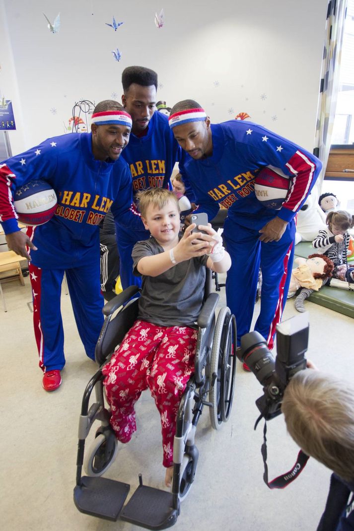 Harlem Globetrotters glöddu börnin á Barnaspítala Hringsins Sveinn Arnarson skrifar 24. mars 2015 22:45 Kristófer Ingi Kjærnested fékk svolitla hjálp frá þessum amerísku snillingum við að snúa körfuboltum á fingrum sér. Vísir/Pjetur Bandarísku körfuknattleikssnillingarnir í Harlem Globetrotters eru nú staddir hér á landi til að skemmta Íslendingum. Alla jafna þegar þeir koma til landsins koma þeir við á Barnaspítala Hringsins og gleðja þar yngri kynslóðina með knattfimi sinni. Kristófer Ingi Kjærnested var einn þeirra sem fengu hjálp við að snúa boltum á fingrum sér við mikla ánægju. „Ég get ekki gert þetta sjálfur, eða ég hef allavega ekki prufað það,“ sagði Kristófer Ingi. Mest lesið Kona þungt haldin og sjö hundar hennar brunnu inni Innlent „Þurfum að búa við það á meðan að vera með þennan ofbeldissegg“ Innlent Konur hafi þurft að afgreiða áttatíu vændiskaupendur á þremur dögum Innlent Bríet og Pálmi takast á fyrir dómstólum Lífið Svarar gagnrýni vegna umdeildra gistihýsa í Skaftafelli Innlent Tekur ekki undir greiningu Heiðu Bjargar um konur í Samfylkingunni Innlent „Ég hafði ekki ímyndunaraflið í að sjá þetta fyrir mér“ Innlent Morðið á Pretti gagnrýnt úr ólíklegustu áttum Erlent Gríðarleg andstaða við lagareldisdrög Hönnu Katrínar Innlent Ungir Sjálfstæðismenn fengu áfengi í ferð með Vilhjálmi og fóru svo á kjörstað Innlent Fleiri fréttir „Ég hafði ekki ímyndunaraflið í að sjá þetta fyrir mér“ Þrjú dæmd fyrir að flytja inn BMW fullan af kókaíni Ein í framboði og áfram formaður Einar og Magnea í efstu sætum Framsóknar í Reykjavík Konur hafi þurft að afgreiða áttatíu vændiskaupendur á þremur dögum Sprenging í vændi og handboltafár eftir sigur á Svíum Gríðarleg andstaða við lagareldisdrög Hönnu Katrínar Kona þungt haldin og sjö hundar hennar brunnu inni Tekur ekki undir greiningu Heiðu Bjargar um konur í Samfylkingunni Svarar gagnrýni vegna umdeildra gistihýsa í Skaftafelli Brunavarnir Suðurnesja luku störfum á öðrum tímanum í nótt Handtekinn grunaður um íkveikju „Þurfum að búa við það á meðan að vera með þennan ofbeldissegg“ Inni í húsinu þegar eldur logaði í fjölbýlishúsi Náttúruverndarsamtök fjarlægðu stíflu Ungir Sjálfstæðismenn fengu áfengi í ferð með Vilhjálmi og fóru svo á kjörstað Loðna fundist á stóru svæði Metfjöldi vill stíga á svið með Íslenska dansflokknum Faðirinn í hungurverkfalli í lokaðri móttökustöð og móðirin ein með börnin Aðeins tíu prósent sem leita til Stígamóta kæra ofbeldið Spyr hvort að Rúv finnist hún „hundleiðinleg t***a“ „Örstutt þunglyndi yfir niðurstöðunum“ Maðurinn er fundinn Kerfið hafi brugðist Sjálfstæðismenn mynda bandalag á Akureyri Sundabraut og Fljótagöng verkefni innviðafélagsins Háværar flugvélar sem vöktu athygli í gær voru á æfingu „Fyrst og fremst er verið að hafna oddvitanum“ Fyrrverandi yngsti þingmaður sögunnar skiptir um flokk og fer fram Heiðu hafnað og fjöldi niðurfellinga heimilisofbeldismála hjá lögreglu Sjá meira
