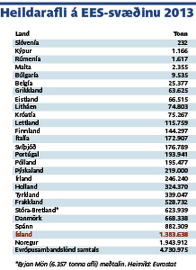 Ísland er næststærsta fiskveiðiþjóðin á Evrópska efnahagssvæðinu Óli Kristján Ármannsson skrifar 2. apríl 2015 07:00 Sá guli: Þorskur í kari á hafnarbakka. Ísland er neðarlega á topp 20 lista þeirra þjóða sem mestum afla landa í heiminum. Fréttablaðið/GVA Nýting sjávarafla hér á landi er með því allra besta sem gerist í heiminum þótt Íslendingar séu ekki sú þjóð sem hvað mest veiðir á heimsvísu. Þetta kemur fram í úttekt í nýjasta tölublaði efnahagsritsins Vísbendingar. Þar kemur fram að undanfarin ár hafi Ísland verið í 15. til 20. sæti yfir þau lönd sem mestum sjávarafla landa í heiminum. Sé bara litið til Evrópska efnahagssvæðisins sést hins vegar hversu þungt sjávarútvegurinn vegur í samanburði við nágrannalöndin. Nýjar tölur Eurostat, evrópsku hagstofunnar, sýna að fiskveiðar Íslands árið 2013 námu tæplega 1,4 milljónum tonna, sem er næstmesti aflinn á Evrópska efnahagssvæðinu (EES) á eftir Noregi sem veiddi rúmar 1,9 milljónir tonna. Í þriðja sæti er svo Spánn með veiðar upp á rúm 882 þúsund tonn.Innan EES er Ísland því með um einn sjötta af heildarveiðunum, líkt og bent er á í Vísbendingu, en Norðmenn veiddu nærri fjórðung. „Þessi tvö EES-ríki, Ísland og Noregur, veiða samtals um 40 prósent af heildarveiði á svæðinu,“ segir í ritinu. Bent er á að yrði Ísland fullgildur aðili að Evrópusambandinu þá yrði landið þar mesta fiskveiðilandið með milli fjórðung og fimmtung aflans. „Ætla má að sjónarmið landsins myndu vega þungt í greininni,“ segir þar jafnframt. Þá kemur fram í samantekt Vísbendingar að hér sé afli nýttur með skilvirkari hætti en víðast annars staðar. Nýting aflans sé best í Danmörku, á Íslandi og í Noregi. „Og hinar þjóðirnar eru langt á eftir. Sérstaklega vekur athygli að Spánverjar eru miklu neðar. Íslendingar eru með um það bil fjórum sinnum betri nýtingu á sínum flota en Spánverjar og Hollendingar.“ Þetta er sagt benda til þess að hagkvæmnin í íslenskum sjávarútvegi sé miklu meiri en hjá þessum þjóðum. „Væri sjávarútvegur innan Evrópusambandsins rekinn á samkeppnisgrunni væri staða íslensku útgerðanna mjög góð, enda eiga íslenskar útgerðir fyrirtæki innan Evrópusambandsins.“ Í grein Vísbendingar er líka slegið á sögusagnir um að íslenskum sjávarútvegi kynni að stafa hætta af spænska fiskveiðiflotanum yrði af aðild Íslands að Evrópusambandinu. Vegna reglunnar um hlutfallslegan stöðugleika myndu aðeins íslenskar útgerðir hafa veiðiheimildir í íslenskri landhelgi. Svipaðar sögur af Spánverjum hafi gengið bæði í Bretlandi og Danmörku. „En á báðum stöðum hefur þó útgerðin haldist í eigu og forsjá heimamanna.“ Mest lesið „Þurfum að búa við það á meðan að vera með þennan ofbeldissegg“ Innlent Bríet og Pálmi takast á fyrir dómstólum Innlent Ungir Sjálfstæðismenn fengu áfengi í ferð með Vilhjálmi og fóru svo á kjörstað Innlent Inni í húsinu þegar eldur logaði í fjölbýlishúsi Innlent Morðið á Pretti gagnrýnt úr ólíklegustu áttum Erlent Handtekinn grunaður um íkveikju Innlent Faðirinn í hungurverkfalli í lokaðri móttökustöð og móðirin ein með börnin Innlent Brunavarnir Suðurnesja luku störfum á öðrum tímanum í nótt Innlent Náttúruverndarsamtök fjarlægðu stíflu Innlent Fyrrverandi yngsti þingmaður sögunnar skiptir um flokk og fer fram Innlent Fleiri fréttir Brunavarnir Suðurnesja luku störfum á öðrum tímanum í nótt Bríet og Pálmi takast á fyrir dómstólum Handtekinn grunaður um íkveikju „Þurfum að búa við það á meðan að vera með þennan ofbeldissegg“ Inni í húsinu þegar eldur logaði í fjölbýlishúsi Náttúruverndarsamtök fjarlægðu stíflu Ungir Sjálfstæðismenn fengu áfengi í ferð með Vilhjálmi og fóru svo á kjörstað Loðna fundist á stóru svæði Metfjöldi vill stíga á svið með Íslenska dansflokknum Faðirinn í hungurverkfalli í lokaðri móttökustöð og móðirin ein með börnin Aðeins tíu prósent sem leita til Stígamóta kæra ofbeldið Spyr hvort að Rúv finnist hún „hundleiðinleg t***a“ „Örstutt þunglyndi yfir niðurstöðunum“ Maðurinn er fundinn Kerfið hafi brugðist Sjálfstæðismenn mynda bandalag á Akureyri Sundabraut og Fljótagöng verkefni innviðafélagsins Háværar flugvélar sem vöktu athygli í gær voru á æfingu „Fyrst og fremst er verið að hafna oddvitanum“ Fyrrverandi yngsti þingmaður sögunnar skiptir um flokk og fer fram Heiðu hafnað og fjöldi niðurfellinga heimilisofbeldismála hjá lögreglu Segir Heiðu hafa átt betra skilið Icelandair aflýsir flugferðum Fyrrverandi ráðherrar ræða alþjóðamálin Gripnir á 165 á áttatíu götu og á 157 á sextíu götu Tvö pör handtekin grunuð um líkamsárásir Munaði litlu að nýliði skákaði borgarstjóra Stóra verkefnið að vinna aftur traust borgarbúa Gríðarleg vonbrigði að reyndri konu sé ekki treyst Pétur Marteinsson kjörinn oddviti Samfylkingarinnar í Reykjavík Sjá meira