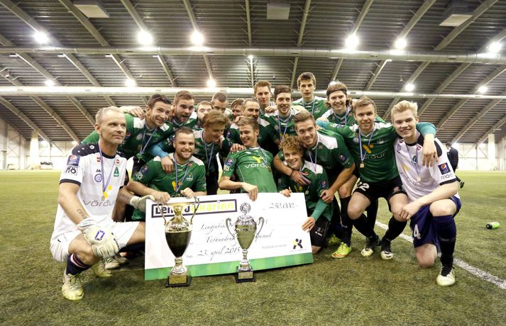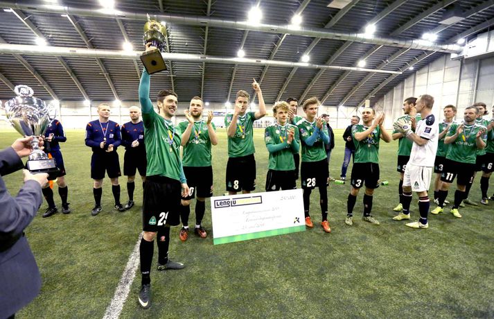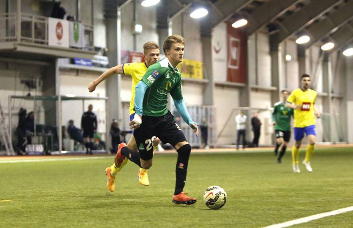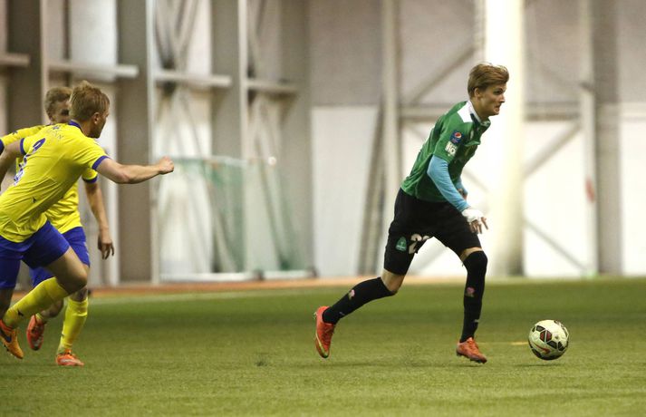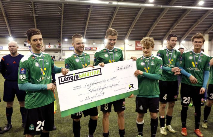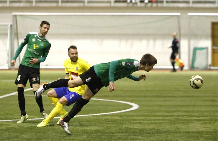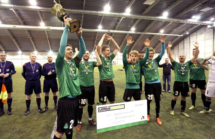 Umfjöllun, viðtöl og myndir: Breiðablik - KA 1-0 | Breiðablik Lengjubikarmeistari í annað sinn Tómas Þór Þórðarson skrifar 23. apríl 2015 19:30 Arnór Sveinn lyftir bikarnum. Vísir/andri marinó Breiðablik varð Lengjubikarmeistari í fótbolta karla í annað sinn í sögu félagsins eftir sigur á KA, 1-0, í úrslitaleik sem fram fór í Kórnum í dag. Breiðablik byrjaði frábærlega og var komið yfir eftir tæpar sex mínútur, en markið var virkilega laglegt. Oliver Sigurjónsson fékk boltann á miðjum vallarhelmingi KA og vippaði honum skemmtilega, utanfótar, yfir vörn norðanmanna. Ellert Hreinsson fékk boltann í vítateignum, hafði betur í baráttunni við Hrannar Björn Steingrímsson sem reyndi að komast í milli, og skoraði af stuttu færi framhjá Srdjan Rajkovic. Blikar voru miklu betri aðilinn fyrstu 35 mínútur fyrri hálfleiks og voru klaufar að bæta ekki við marki. Arnþór Ari Atlason skaut yfir af fimm metra færi eftir glæsilega fyrirgjöf Kristins Jónssonar sem kom upp úr flottu spili Breiðabliks. Blikarnir áttu fullt af flottum spilköflum þar sem þeir notuðu vængina vel og pressuðu stíft á KA-liðið með flottum fyrirgjöfum. Fyrri hálfleikurinn var meira og minna í eign Kópavogsliðsins en því tókst ekki að bæta við marki í fyrri hálfleik. KA-menn komust aðeins betur í takt við leikinn síðustu tíu mínútur fyrri hálfleiks og mættu af krafti í þann síðari. Samt sem áður var það Breiðablik sem fékk enn eitt færið. Kristinn Jónsson, sem var frábær í leiknum eins og hann hefur verið allt undirbúningstímabilið, átti að skora á 53. mínútu þegar skalli hans úr markteignum var varinn meistaralega af Srjdan Rajkovic. Davíð Kristján Ólafsson lagði upp það færi eins og fleiri í leiknum, en hann og Höskuldur Gunnlaugsson, þessir ungu vængmenn Breiðabliks, gerðu bakvörðum KA lífið leitt í leiknum. Davíð og Höskuldur fá mun stærra hlutverk í sumar, en þeir hafa spilað nær alla leiki á undirbúningstímabilinu. Þeir hafa tekið miklum framförum og ekki sakar fyrir þá að vera með bakvarðaparið Arnór Svein Aðalsteinsson og Kristinn Jónsson fyrir aftan sig. Höskuldur gerði sig nokkrum sinnum líklegan til að skora í leiknum, en hann hefði getað komið Breiðabliki í 2-0 þegar skalli hans small í stönginni á 66. mínútu. Að sjálfsögðu var það Kristinn sem lagði upp það færi. Blikar tóku lífinu með ró síðustu 25 mínútur leiksins. Þeir héldu boltanum vel, spiluðu agaðan sóknarleik og vörðust frekar máttlitlum sóknarlotum KA-manna auðveldlega. Lokatölur, 1-0, og Breiðablik búið að vinna tvo titla á undirbúningstímabilinu undir stjórn Arnars Grétarssonar; Fótbolta.net-mótið og Lengjubikarinn. Það var svo Arnór Sveinn Aðalsteinsson, fyrirliði Breiðabliks, sem lyfti Lengjubikarnum og tók við 250.000 króna ávísun sem Blikar fengu í sigurlaun.Arnar: Þetta er ekki bara vorbragur á Blikum "Ég get ekki kvartað yfir einu eða neinu," sagði Arnar Grétarsson, þjálfari Breiðabliks, við Vísi aðspurður um undirbúningstímabilið hjá liðinu, en það er nú búið að vinna tvo titla. "Eina sem ég get kvartað yfir í þessum leik er að menn nýta ekki færin sín. Að öðru leyti vorum við að spila alveg glimrandi leik, sérstaklega í fyrri hálfleik," sagði Arnar. Blikar voru mun betri en KA-menn í leiknum, sérstaklega í fyrri hálfleik þar sem liðið yfirspilaði norðanmenn. "KA hefur bara verið að tapa með einu marki gegn Pepsi-deildarliðunum, en við opnuðum þá trekk í trekk með flottri spilamennsku. Eðlilega gátu menn ekki haldið því uppi í 90 mínútur," sagði Arnar. "Ég var ánægður með að halda hreinu. Þeir voru ekki að opna okkur neitt en KA er hættulegt í föstum leikatriðum og er með sterka menn. Þeir reyndu langar sendingar inn í teiginn og vonuðust að boltinn dytti fyrir þá. Það gerðist nokkrum sinnum en þeim tókst ekki að skora." Arnar er bjartsýnn fyrir komandi tímabili og sér enga ástæðu fyrir því að Blikarnir eigi ekki að spila jafnvel í Pepsi-deildinni og á undirbúningsmótunum. "Ég er bara mjög ánægður með undirbúninginn og þessa tvo titla. Menn segja alltaf að það sé vorbragur á Blikum. Ég sé enga ástæðu þess að þetta eigi að hætta í sumar. Eini munurinn er að á flestum völlum er venjulegt gras. Þetta er bara í hausnum á mönnum," sagði Arnar sem virðist búinn að finna sitt byrjunarlið. "Menn sjá nú nokkurn veginn hvernig hlutirnir eru og svo erum við að koma ákveðnum mönnum í topp stand. Svo vonandi bætast einn eða tveir nýir í hópinn. Það er verið að vinna í því og vonandi fáum við góðar fréttir á næstu dögum," sagði Arnar Grétarsson.Kristinn: Stefnum á efstu þrjú sætin Kristinn Jónsson, bakvörður Breiðabliks, var frábær í leiknum í dag og hefði átt að skora. Hann er ánægður með að vinna annan titil á undirbúningstímabilinu. "Þetta er eins og hver annar titill fyrir okkur. Við förum í alla leiki til að vinna og það sama gildir um öll mót. Við viljum stimpla það inn í menn að við viljum vinna bikara," sagði Kristinn við Vísi eftir leikinn. "Þetta gefur okkur byr undir báða vængi fyrir mótið sem við förum í fullir sjálfstrausts. Það er mikil tilhlökkun hjá okkur fyrir fyrsta leik." Blikar voru miklu betri en KA-menn í leiknum og áttu að vinna stærra. "Mér fannst fyrri hálfleikurinn frábær og líklega var hann sá besti sem við höfum spilað á undirbúningstímabilinu," sagði Kristinn. "Þetta datt niður í seinni hálfleik, en mér fannst þetta aldrei vera í hættu. Við fengum færi til að klára leikinn sem við gerðum ekki og það verðum við að laga." Undirbúningstímabilið hefur verið gott hjá Breiðabliki og þar á bæ fara menn fullir sjálfstrausts inn
