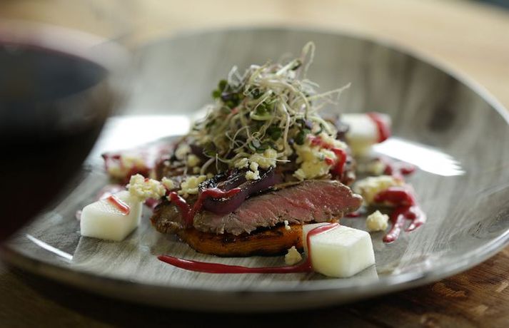 Nautastrimlar með girnilegu salati sem meðlæti og hindberja-vinagrette.Grillaðir nautastrimlar Uppskrift fyrir 4400 g nautafilet (fullhreinsað)100 ml appelsínusafi100 ml ólífuolía1 tsk. fínt salt½ hvítlauksgeiri Skerið kjötið í 100 gramma steikur og berjið það með kjöthamri þar til það er orðið 5 mm að þykkt. Setjið appelsínusafann og olíuna saman í matvinnsluvél og vinnið saman í 1 mín. Hellið blöndunni yfir kjötið og látið kjötið standa í 1-2 tíma. Setjið kjötið á heitt grillið og grillið í um 1,5 mín á hvorri hlið. Takið af grillinu og setjið álpappír yfir og látið standa í 10 mín.Hindberja-vinaigrette100 ml ólífuolía100 g frosin hindber2 msk. balsamik-edik2 msk. hlynsíróp Setjið allt hráefnið í blandara og blandið vel saman.Meðlæti1 stk. gráðaostur1 stk. rauðlaukur (skrældur)½ stk. grasker½ stk. hunangsmelóna50 ml ólífuolía1 msk. hvítlauksduft1 tsk. cayenne-pipar1 box baunaspírur Skerið rauðlaukinn í tvennt og graskerið í 5 mm þykkar sneiðar og setjið í skál með þurrkryddunum og ólífuolíunni. Blandið öllu saman og kryddið með salti og pipar og látið standa í 2 tíma. Setjið á heitt grillið og grillið í 4 mín. á hvorri hlið eða þar til hvort tveggja er eldað í gegn. Skrælið og skerið melónuna í stóra kubba og myljið gráðaostinn niður. Skerið kjötið í þunna strimla og setjið allt saman á fat.