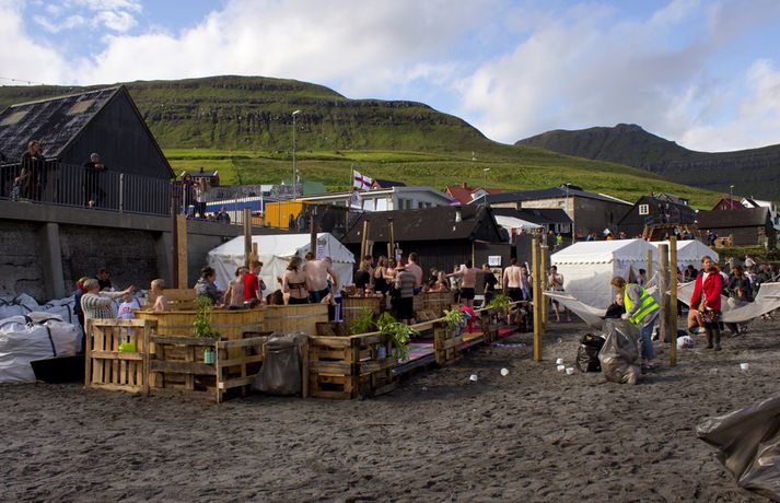 G! Festival í Færeyjum þar sem glæsileg tjöld fara í ruslið Jens Guð skrifar 20. júlí 2016 22:00 Heitu pottarnir á G!Festivalen. Mynd/Gréta Hauksdóttir G! Festival er stærsta árlega útirokkhátíðin í Færeyjum. Þetta árið fór hún fram núna um helgina. Á fjórða hundrað tónlistarmenn afgreiddu um sjötíu dagskráratriði á þremur sviðum í Götu á Austurey. Að venju komu þeir frá ýmsum löndum. Í ár frá Malí, Austurríki, Bandaríkjunum, Finnlandi, Ítalíu, Írlandi og Danmörku auk Færeyja og Íslands. Fulltrúi Íslands í ár var hljómsveitin Agent Fresco. Áður hafa spilað á G! Festivali meðal annarra Skálmöld, Hjálmar, Mugison, Enzími, Bloodgroup, Dr. Spock og margir fleiri. Uppruna G! Festivals má rekja til Kidda kanínu (einnig kenndur við Hljómalind). 2002 stóð hann fyrir yfirgripsmiklu átaki til að kynna færeyska tónlist á Íslandi. Hann skipulagði hljómleikaferðir færeyskra tónlistarmanna um Ísland. Hann bauð upp á færeyska hljómleika hvar sem því var við komið. Íslendingar tóku Tý (Ormurin langi), Eivöru, 200, Hanusi G., Kristian Blak og fleiri færeyskum tónlistarmönnum opnum örmum. Jón Týril, gítarleikari hljómsveitar Eivarar, Clickhaze, fékk innblástur: Að setja færeyska tónlist í fjölþjóðlegt samhengi með alvöru tónlistarhátíð í Færeyjum. Fram til þessa var það færeyskum tónlistarmönnum framandi hugsun að spila utan Færeyja. Haustið 2002 ýtti Jón Týril G! Festivali úr vör. Í ár hófst G! Festival að venju á rólegu nótunum á fimmtudegi; með lítt þekktum nöfnum. Þessi dagur er hugsaður sem upphitun fyrir fjölmennt starfslið. Þungi straumurinn liggur á hátíðina eftir vinnulok almennings á föstudeginum. Vandamálið var að flóðgáttir himins opnuðust um það leyti. Helliregn setti allt úr skorðum. Færeyingar eru vanari rigningu en flestir aðrir jarðarbúar. Hún er þó oftar mildur úði fremur en íslenskt skýfall. En nú var þetta alvöru rigning. Litla tæra lækjarsprænan sem rennur niður Suður-Götu breyttist í beljandi brúnt fljót er fossaði upp á bakka. Lát varð á straumi gesta inn á hátíðarsvæðið. Þegar upp var staðið urðu gestir ekki eins margir og undanfarin ár. Að sögn festivalsstjórans, Sigvarar Laksá, var heildarfjöldinn eitthvað á fimmta þúsund (að meðtöldum erlendu fjölmiðlafólki, skemmtikröftum, gæslu og öðrum starfsmönnum). Í góðu árferði er hann um og yfir sjö þúsund. Einstaka dagskrárlið var frestað til laugardags. Öðrum fannst rigningin góð. Margir drógu ponsjó-regnslá úr vasa sínum. Hápunktar dagsins voru færeyska víkingametalbandið Hamradun og malíska blússveitin Songhoy Blues. Framvörður Hamradun er Pól Arni sem hérlendis gerði garðinn frægan sem söngvari Týs 2002.Á laugardeginum var komið besta veður. Fimm heitir pottar höfðu aðdráttarafl á sandströndinni fyrir framan stærsta sviðið. Pottverjar hlupu af og til út í sjó til að kæla sig. Hvít sölutjöld settu sterkan svip á hátíðarsvæðið. Þar var á boðstólum allt frá drykkjarföngum og heitum mat til hljómplatna og bóka. Eivör er ekki einungis drottning í huga Íslendinga heldur líka Færeyinga. Slíkur var troðningur inn á áheyrendasvæðið hjá henni að gæslan þurfti að hleypa inn í hollum. Sumir klifruðu upp á nálæg hús og veggi til að losna við troðninginn og sjá betur yfir svæðið. Í lok hvers lags var ákaft klappað. Annika Hoydal á einnig harðsnúinn aðdáendahóp. Hún heillaði Íslendinga um 1970 með laginu „Ólavur Riddararós“ sem hún söng með Harkaliðinu. Eivör hefur nefnt Anniku sem sterkan áhrifavald sinn. Agent Fresco rak endahnút á dagskrána. Liðsmenn hljómsveitarinnar voru afar ánægðir með allt á hátíðinni. Fagmennska í fyrirrúmi hvar sem niður var borið. Ekki síður voru þeir ánægðir með hlýjar móttökur áheyrenda. Ýmsir þekktu músíkina og sungu með. Sigvör staðfesti að engin vandræðamál hefðu komið upp á hátíðinni, fremur en áður. Engin slagsmál. Engar nauðganir. Enginn þjófnaður. Engin skemmdarverk. Athygli vakti hvað svæðið var snyrtilegt. Það var ekki fyrr en undir lok dagskrár hvers dags sem bera fór á plastglösum og einnota matarbökkum á jörðinni. Gæsla var fjölmenn og áberandi, jákvæð og glaðsleg. Börn á öllum aldri röltu frjáls og ein síns liðs um svæðið fram yfir miðnætti. Á tjaldstæðinu í Götu mátti sjá fjölda glæsilegra og dýrra tjalda. Sum með gluggum og fortjaldi. Öll splunkuný. Færeyingar taka þau ekki heim með sér heldur henda þeim í stóran ruslagám. Aðspurðir hvers vegna var svarið: „Þau eru búin að gera sitt gagn.“ En hvað með að nota það aftur á næsta ári: „Og geyma þetta flykki einhversstaðar í heilt ár?“ Þetta er þeim annarlegt. Tvö óhöpp skyggðu á annars frábæra helgi. Annars vegar rúllaði Dani 150 metra niður fjallið fyrir ofan Götukleif (á milli Suður- og Norður-Götu). Hann slasaðist töluvert og dvelur á sjúkrahúsi. Hins vegar hrapaði ný-sjálenskur maður af færeyskum ættum niður hamraklett fyrir ofan Norður-Götu. Hann lést. Þessi slys tengjast á engan hátt G!Festivali. Þau urðu langt fyrir utan hátíðarsvæðið. Um var að ræða almenna ferðamenn. Jens Guð og Gréta Hauksdóttir sóttu G!Festival heim í ár og deila reynslu sinni hér að ofan. Að neðan má sjá myndasyrpu Grétu frá hátíðinni.Annika Hoydal, Ólavur Riddararós og hringdans áheyrenda.Mynd/Gréta HauksdóttirEivör Pálsdóttir var á meðal þeirra sem tróðu upp.Mynd/GRéta HauksdóttirMynd/Gréta HauksdóttirKiddi Kanína og félagar.Krakkar í flæðarmáli og tónleikar í bakgrunni.Mynd/Gréta HauksdóttirSakaris spilar á hátíðinni.Mynd/Gréta Hauksdóttir Mest lesið Ungfrú Ísland rýfur tengslin við Ungfr