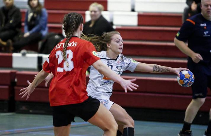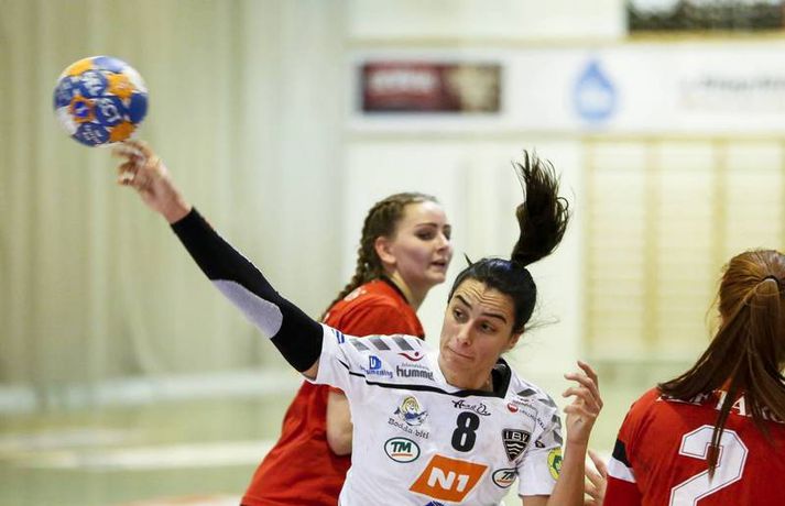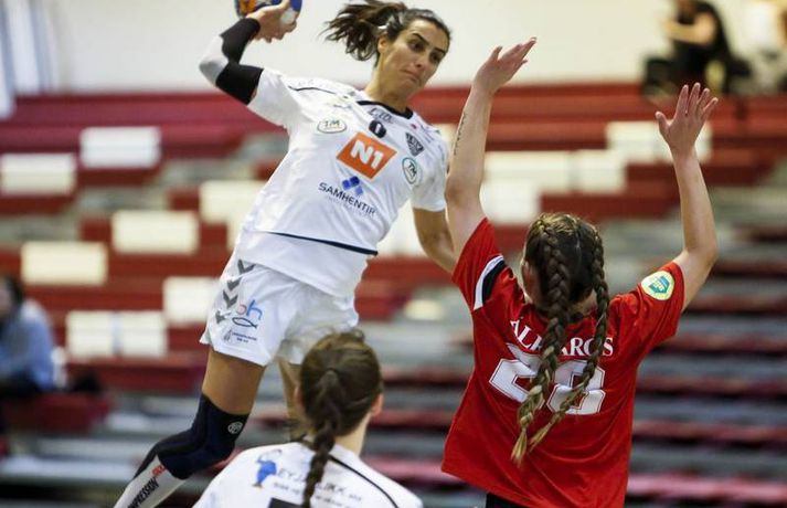 ÍBV komst í kvöld á toppinn í Olís-deild kvenna eftir öruggan 17 marka sigur á Aftureldingu í Mosfellsbæ en þetta var fyrsti leikurinn í fimmtándu umferðinni. Eyjakonur komust einu stigi upp fyrir Gróttu en Gróttuliðið getur endurheimt toppsætið með sigri á Stjörnunni í Garðabænum á morgun. Ernir Eyjólfsson, ljósmyndari Vísis og Fréttablaðsins, var á leiknum að Varmá í kvöld og náði þessum myndir hér fyrir ofan. Þetta var fjórði deildarsigur Eyjaliðsins í röð en liðið er búið að vinna alla leiki sína nema tvo leiki á fjórum dögum í kringum mánaðarmótin október og nóvember þegar liðið var undir gríðarlegu álagi vegna leikja og ferðalaga í kringum Evrópukeppni.Afturelding - ÍBV 22-39 (10-22)Mörk Aftureldingar: Telma Rut Frímannsdóttir 6, Ingibjörg Bergrós Jóhannesdóttir 4, Vigdís Brandsdóttir 3, Dagný Huld Birgisdóttir 3, Magnea Rós Svansdóttir 2, Erla Mjöll Tómasdóttir 2, Sara Lind Stefánsdóttir 1, Alda Björk Egilsdóttir 1.Mörk ÍBV: Greta Kavaliuskaite 9, Vera Lopes 8, Telma Silva Amado 4, Ester Óskarsdóttir 4, Sandra Dís Sigurðardóttir 3, Díana Dögg Magnúsdóttir 3, Kristrún Ósk Hlynsdóttir 2, Sandra Gísladóttir 2, Sirrý Rúnarsdóttir 2, Ásta Björt Júlíusdóttir 1, Bergey Alexandersdóttir 1.Vera Lopes skorar hér eitt af átta mörkum sínum.Vísir/Ernir