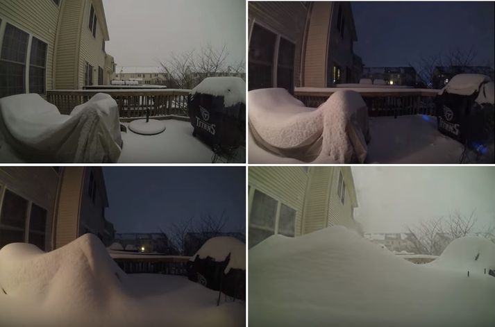 Snjómagnið fest á filmu Stefán Ó. Jónsson skrifar 24. janúar 2016 17:30 Það kyngdi niður snjó. skjáskot Íbúar austurstrandar Bandaríkjanna eru nú í óðaönn við að grafa sig út af heimilum sínum eftir mesta snjóbyl í áraraðir. Aldrei hefur snjóað jafn mikið í sögu stórborganna Baltimore, Allentown og Harrisburg þar sem snjóþykktin var víða um 80 sentímetrar. Í New York munaði litlu að met hafði verið slegið en þar var jafnfallinn snjór um 68 sentímetrar að þykkt.Sjá einnig: Á gönguskíðum í New YorkHríðarbylurinn hefur lamað samgöngur bæði á landi og í lofti undanfarinn sólarhring og þá er talið að átján manns hafi látist af hans völdum. Í myndbandi sem sjá má hér að neðan má sjá hvernig snjórinn hlóðst upp í borginni Purcellvill í Virginu-ríki í gær. Sjá einnig: Mikill hríðarbylur herjar á íbúa austurstrandar Bandaríkjanna Mest lesið Trump nefnir nýja kynslóð orrustuskipa í höfuðið á sjálfum sér Erlent „Krítískur massi af snarbrjáluðu fólki nær yfirhöndinni“ Innlent Ríkisstjórnin greiðir fyrir flutning hinna látnu til Íslands Innlent Hyggst kæra dyraverði Auto til lögreglu Innlent Fjölgun eldri kvenna í Kvennaathvarfi: „Þessar konur bíða ekki“ Innlent Skapari Call of Duty lést í bílslysi Erlent Virðist ekki vera hægt á Íslandi Viðskipti innlent Hiti geti mest náð átján stigum Veður Ný könnun Maskínu: „Væri alveg ný staða í íslenskum stjórnmálum“ Innlent „Ótrúlega sorglegt að pabbi sé búinn að vera svona lengi í þessari stöðu“ Innlent Fleiri fréttir Kínverjar og Rússar lýsa yfir stuðningi við Venesúela Skapari Call of Duty lést í bílslysi Trump nefnir nýja kynslóð orrustuskipa í höfuðið á sjálfum sér „Bandaríkin eiga ekki að taka yfir Grænland“ Nýr ritstjóri stöðvaði umfjöllun um brottvísanir Trump Breiddi út faðminn fyrir rasista: „Þið þurfið ekki að biðjast afsökunar á að vera hvít lengur“ Sprengdu rússneskan hershöfðingja í loft upp í Moskvu Undirbúningur árásarinnar stóð yfir í marga mánuði Trump skipar sendifulltrúa fyrir Grænland Segir unnið að því að móta sameiginlega nálgun Bandaríkjanna, Úkraínu og Evrópu Sýknaður af nauðgun eftir að hafa verið skimaður fyrir sjaldgæfri svefnröskun Málið sem Trump getur ekki losað sig við Grunaður um manndráp eftir að tveggja ára drengur féll úr blokk Fóru um borð í vélvana rússneskt skip Baulað á Albanese á minningarathöfn á Bondi-strönd Kvarta yfir ritskoðun Epstein-skjala: „Við vitum ekki hvað við vitum ekki“ Níu skotnir til bana á krá Sextán ára fékk greitt fyrir að færa Epstein stúlkur Ljósmyndir horfnar úr Epstein-skjölunum, þar á meðal ein af Trump Vilja dauðarefsingu af borðinu vegna hagsmunaáreksturs ráðherra Pútín sagður hafa valið Witkoff Gerðu umfangsmiklar árásir gegn ISIS í Sýrlandi Það helsta úr fyrsta skammti Epstein-skjalanna Epstein-skjölin birt Draga tilvist neðanjarðarhafs á Títan í efa Réðust á skip úr skuggaflotanum þúsundir kílómetra frá Úkraínu Enn fleiri myndir úr safni Epsteins: „En hún vill þúsund dali fyrir hverja stúlku“ Trump vill til tunglsins fyrir 2028 Herða reglur og ráðast í endurkaup á skotvopnum Morðinginn í Brown háskóla fannst látinn Sjá meira