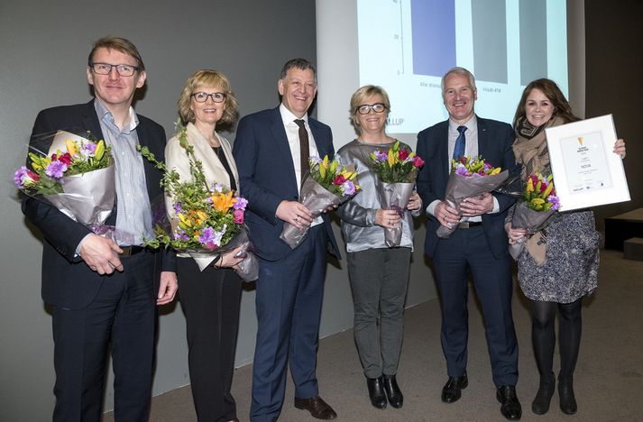 Niðurstöður Íslensku ánægjuvogarinnar voru kynntar í sautjánda sinn í dag. Fyrirtækið Nova var það eina sem fékk afhenta viðurkenningu í sínum flokki, farsímamarkaði, en í öðrum flokkum var ekki marktækur munur á efsta og næstefsta sæti. Þá var ekki marktækur munur á ÁTVR, sem var með hæstu einkunnina á heildina litið, og Nova, sem var með næsthæstu einkunnina. Ánægjuvoginni er ætlað að mæla ánægju viðskiptavina hvers fyrirtækis með þjónustu þess. Fulltrúar Íslandsbanka, Varðar, Olís og HS orku fengu ásamt ÁTVR og Nova blómvönd í viðurkenningarskyni sem efstu fyrirtæki í sínum flokki.