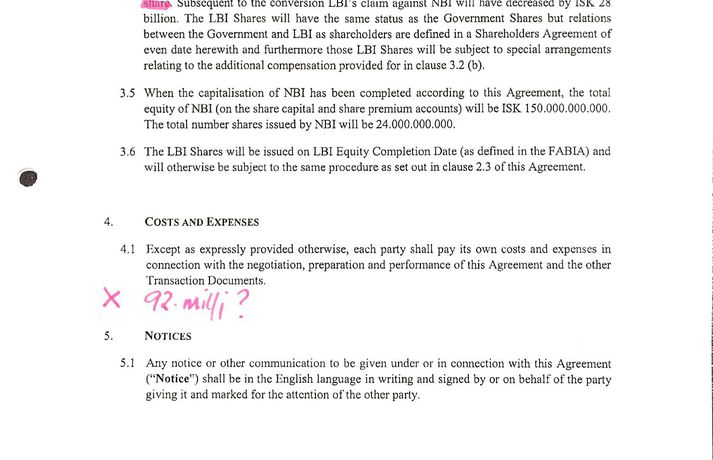 Vigdís Hauksdóttir, formaður fjárlaganefndar Alþingis, sem ítrekað hefur gagnrýnt það að gögn sem snúi að endurreisn föllnu bankana skuli ekki vera opinber, segir samning um eignatilfærslu úr þrotabúi gamla Landsbankans sanna það að skjalafals hafi átt sér stað í fjármálaráðuneytinu í tíð síðustu ríkisstjórnar. Vigdís mætti með eintök sín af samningnum í viðtal við útvarpsþáttinn Í Bítið á Bylgjunni í morgun. Í samningnum, sem birtur hefur verið opinberlega, er vísað í lið 4.2 (b) sem vantar. Vigdís telur að þessi samningsliður hafi verið útmáður og hvatti þáttastjórnendur til að birta vinnugögn hennar á Vísi, en þau má finna með fréttinni. „Samkvæmt þessu vantar lið 4.2 (b) sem vísað er í hér að ofan, og fyrst það er kominn b-liður, þá vantar líka a-lið,“ sagði Vigdís í viðtalinu. „Þetta vísar í skilyrta skuldabréfið sem var fært inn í Landsbankann sem leiddi það af sér að ef starfsmenn bankans myndu geta rukkað lánasafnið upp í topp, rúma níutíu milljarða, af skuldugum heimilum og fyrirtækjum, þá fengju starfsmenn tvö prósent í Landsbankanum. Og það gekk eftir. Og þennan lið vantar, útskýringu á því.“Uppfært 12.05: Líkt og lesendur Vísis hafa bent á, er alls ekki ósennilegt að einfaldlega sé um innsláttarvillu að ræða og að vísa eigi í lið 3.2 (b) en ekki 4.2 (b), sem finnst hvergi. Tilvísunin er á þriðju síðu samningsins, sem skoða má í heild sinni neðst í fréttinni.Ekki í herferð gegn neinum sérstökum Vigdís hefur áður sakað starfsmenn fjármálaráðuneytisins um skjalafals. Hún hefur sagt að átt hafi verið við gögn um stofnun nýju bankanna á síðasta kjörtímabili sem þingmenn á Alþingi óskuðu eftir í fyrra. „Ég ætla ekki að benda á neinn sekan og það má enginn halda það að ég sé í einhverri herferð gegn einhverjum sérstökum,“ segir Vigdís meðal annars í viðtalinu. „Ég ber þá skyldu, sem kjörinn þingmaður þjóðarinnar, að upplýsa afglöp á vegum framkvæmdavaldsins.“ Sem fyrr segir, er samningurinn sem Vigdís vísar til í viðtalinu ekki trúnaðargagn. Þingmaðurinn segist þó telja að birta ætti öll trúnaðarskjöl um endurreisn bankanna og telur best að þingið fari í rannsókn á henni, sem og fyrri einkavæðingu bankanna. „Þjóðin verður að vita hvernig staðið var að einkavæðingu bankanna hinna síðari, þegar kröfuhöfum voru færðir nýju bankarnir á silfurfati á einni nóttu,“ segir hún.Hlýða má á viðtalið við Vigdísi í heild sinni í spilaranum hér að ofan.