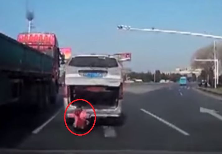 Ungur piltur datt út úr bíl á ferð á fjölfarinni götu í Kína í dögunum. Afi barnsins tók ekki eftir því og ók áfram. Barnið sakaði ekki en hann stóð fljótt upp aftur og reyndi að hlaupa á eftir bíl afans. Á veginum óku fólksbílar og vörubílar á mikilli ferð. Atvikið náðist á myndband úr bílnum sem ekið var á eftir bílnum sem barnið var í. Fólkið sem ók á eftir bíl barnsins tók drenginn upp í og elti afann, sem sagði miðlum ytra að hann hefði setið í aftursætinu og klifrað yfir í skottið. Þar hefði hurðin opnast og drengurinn dottið út.