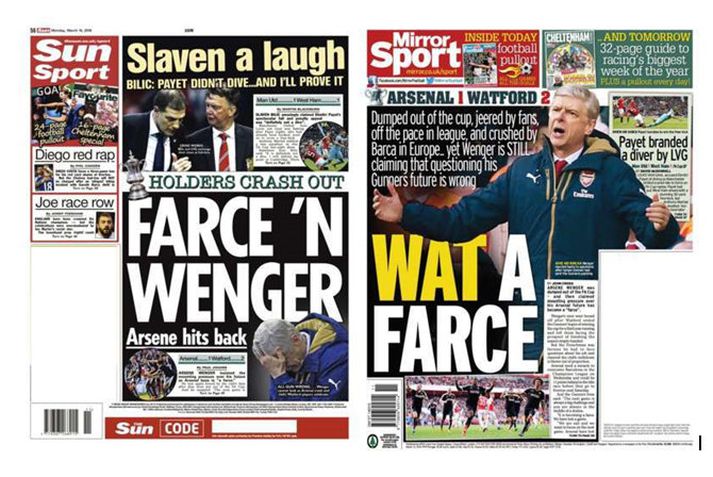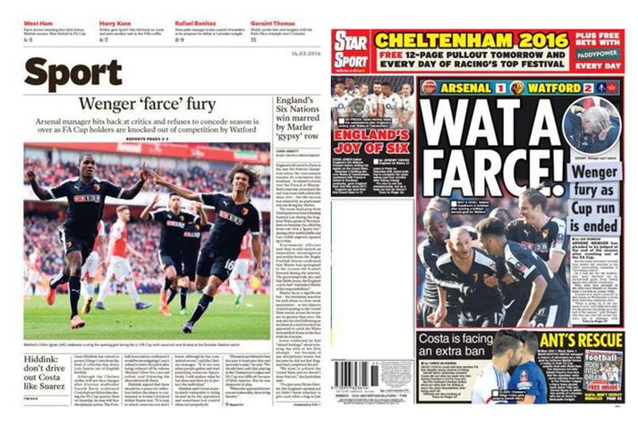 Farsa-ummæli Wenger forsíðuefni ensku blaðanna Óskar Ófeigur Jónsson skrifar 14. mars 2016 10:30 Arsene Wenger var ekkert í alltof góðu skapi í gær. Vísir/Getty Arsene Wenger er orðinn afar pirraður á umræðunni um framtíð sína hjá félaginu og kallaði hana farsa í viðtölum eftir tapið á móti Watford í gær. Þetta var fjórða tap Arsenal í síðustu sex leikjum og í fyrsta sinn frá árinu 2002 sem liðið tapar þremur heimaleikjum í röð. Þetta er því versta heimavallartaphrina félagsins í fjórtán ár en franski stjórinn er á því að allar vangaveltur um framtíð sína eigi ekki rétt á sér. Á síðustu vikum hefur Arsenal dottið út úr enska bikarnum, komið sér í vonlausa stöðu í Meistaradeildinni (2-0 undir á móti Barcelona eftir heimaleikinn) og er nú átta stigum á eftir toppliði Leicester í ensku úrvalsdeildinni. „Það sem er í gangi núna er mjög, mjög erfitt fyrir leikmennina að sætta sig við. Dæmið okkur samt í lok tímabilsins," sagði Arsene Wenger. „Nú er á enda löng sigurganga í enska bikarnum og það er leiðinlegt en við viljum einbeita okkur að næsta leik sem er alltaf mikil áskorun. Við erum samt alltaf í miðpunkti einhvers leikrits," sagði Wenger. „Þetta leikrit er samt að breytast í farsa. Við töpuðum leik. Arsenal hefur tapað áður og við mun tapa leik aftur í framtíðinni. Við ætlum að standa saman, komast í gegnum þetta og undirbúa okkur fyrir næsta leik með fulla trú á okkur sjálfum," sagði Wenger. „Stuðningsmennirnir standa á bak við félagið og við viljum berjast fyrir hverjum leik til loka tímabilsins. Þetta snýst ekkert um sjálfstraust. Auðvitað er liðið mitt með nægjanlegt sjálfstraust," sagði Wenger. Wenger skilur því ekki umræðunni um framtíð sína en ensku blöðin skilja aftur á móti ekki í franska stjóranum og viðbrögð hans voru forsíðuefni ensku blaðanna í morgun eins og sjá má hér fyrir neðan.Independent og Daily Star.Mirror og The Sun. Enski boltinn Mest lesið Ekkert bit í snáknum: „Hörmulegur og ætti að hætta“ Sport Kynntu Sigurð á slaginu sex á aðfangadag Íslenski boltinn United horfir til Þýskalands eftir höfnun Semenyo Enski boltinn „Þú birtir falsfrétt um mig, þú ert í banni“ Fótbolti Goðsögn fallin frá Enski boltinn Zidane sá soninn spila á Afríkumótinu Fótbolti Þessi tíu eru tilnefnd sem Íþróttamaður ársins 2025: 23 ára aldursmunur Sport „Ég elska peninga“ Sport Haaland stóðst vigtun eftir jólin Enski boltinn Féll úr skíðalyftu og lést Fótbolti Fleiri fréttir United horfir til Þýskalands eftir höfnun Semenyo Haaland stóðst vigtun eftir jólin Hápunktarnir hingað til í enska boltanum Goðsögn fallin frá Kærður af knattspyrnusambandinu Bestu jólamörkin: Drogba, Scholes eða Giroud? Van de Ven bað Isak afsökunar: „Vildi ekki meiða hann“ Hvers vegna heillast stórliðin svo af Semenyo? Stewart, Snoop og Modric í eina sæng Vill ekki segja hversu lengi Bruno er frá Spyr hvort Guardiola stígi á vigtina Arsenal í undanúrslit eftir vító Man. Utd reyndi stíft en Semenyo kaus City „Tölfræðilega séð eiga þeir ekkert að vera í þessari stöðu“ Chelsea setur sig í samband við Semenyo Jiménez jafnaði bestu vítaskyttu sögunnar Slot mun sakna Isak í tvo mánuði eftir „glórulausa tæklingu“ Sjáðu „auma“ vítið sem skilaði Fulham sigri Fulham skildi Forest eftir við fallsvæðið Áfallið staðreynd og Isak búinn í aðgerð Fagnaði titli Liverpool sem óður maður um alla borg „Allir virðast elska hann“ „Þetta mun ekki buga okkur“ Guardiola mun vigta leikmenn Man City eftir jólin „Ef þið væruð Antoine Semenyo, hvert mynduð þið fara?“ Sjáðu mörkin: Rogers sá um Manchester United Óttast að Isak hafi fótbrotnað Tvenna frá Rogers tryggði Villa sigur gegn Manchester United Fimmta sinn sem Arsenal er á toppnum um jólin: Unnu ekki titilinn í fyrstu fjögur skiptin „Viljum við að okkar verði minnst fyrir að vera skræfur?“ Sjá meira