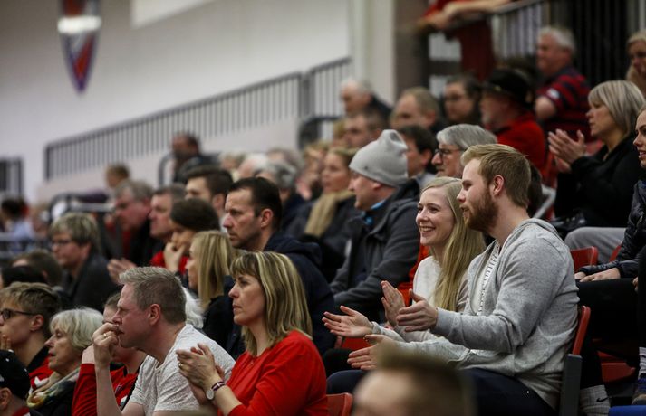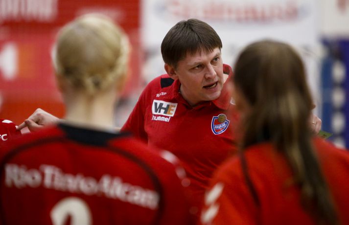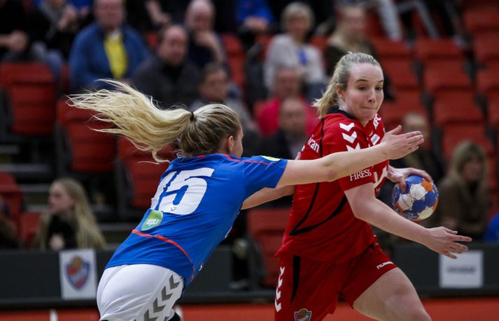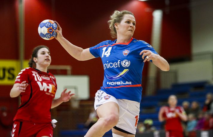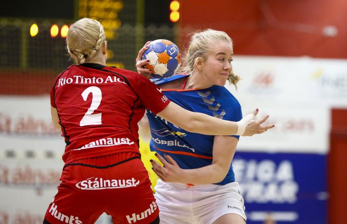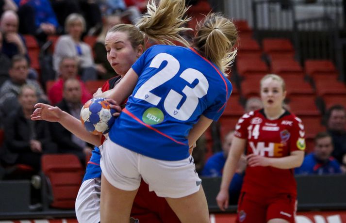 Haukar lögðu Val 23-22 í þriðju síðustu umferð Olís deildar kvenna á heimavelli í kvöld. Haukar voru 11-9 yfir í hálfleik.Ernir Eyjólfsson, ljósmyndari Vísis og Fréttablaðsins, var á leiknum og tók þessar myndir hér fyrir ofan. Leikurinn var jafn, spennandi og sveiflukenndur allt frá byrjun til loka. Liðin skiptust á að leiða og eiga góða kafla þó leikurinn fari ekki sögubækurnar yfir bestu leiki vetrarins. Gríðarlega mikið var undir og var þetta leikur sem bæði lið þurftu að vinna og það útskýrir kannski hve hægur hann var á köflum og að varnir liðanna hafi verið í aðalhlutverki. Haukar byrjuðu betur og náðu þriggja marka forystu snemma leiks en Valur náði frumkvæðinu um miðbik fyrir hálfleiks sem Haukar hirtu til baka og voru tveimur mörkum yfir í hálfleik. Haukar náðu snemma fjögurra marka forystu í seinni hálfleik sem var mesti munurinn á liðunum en aftur vann Valur það fljótt upp skiptust liðin á frumkvæðinu allt þar til í lokin. Valur fékk kjörið tækifæri til að jafna metin í lokasókninni. Fyrst varði Elín Jóna Þorsteinsdóttir en Valur náði frákastinu og fékk réttilega dæmt víti. Reynsluboltinn Kristín Guðmundsdóttir sem hafði nýtt bæði vítin sín fyrr í leiknum skaut framhjá úr vítakastinu og fyrir vikið fögnuðu Haukar sigri. Kristín hefur oft leikið betur en í kvöld og átti hún í miklum vandræðum með skotin sín í leiknum. Bryndís Elín Wöhler, Sigurlaug Rúnarsdóttir og Morgan Marie Þorkelsdóttir stigu allar upp sóknarlega fyrir Val en vörn liðsins var mjög góð í leiknum þar sem liðið breytti reglulega til. Valur tók oft einn úr umferð, fór svo í að taka tvo á milli þess sem liðið féll til baka í 6-0 vörn. Þetta riðlaði oft sóknarleik Hauka en varnarleikur liðsins var lengst af mjög góður. Maria Ines átti þó frábæran leik fyrir Hauka og Ramune Pekarskyte skilaði sínu að vanda. Með sigrinum eru Haukar enn í bílstjórasætinu í baráttunni um deildarmeistaratitilinn. Liðið er nú með 42 stig en næsti leikur liðsins er í Vestmannaeyjum. Vinni liðið tvo síðustu leiki sína verður liðið deildarmeistari. Valur er með 36 stig og í miðri fjögurra liða baráttu um sæti þrjú til sex þar sem allt getur gerst. Karen: Megum ekki tapa leik „Þetta gat ekki verið tæpara en var ógeðslega sætt,“ sagði Karen Helga Díönudóttir leikstjórnandi Hauka eftir sigurinn á Val í kvöld. Valur fékk vítakast sem dæmt var á Karenu þegar leiktíminn rann út og viðurkenndi Karen að dómararnir dæmdu rétt. „Ég fékk vítið á mig. Ég var að koma út úr teignum. Þetta var hárrétt. „Mér fannst við vera með leikinn allan tímann en við klúðrum þessu á smá tímapunkti.“ Karen vildi ekki meina að Haukar hafi gert sig seka um værukærð þegar liðið náði fjögurra marka forystu í seinni hálfleik, forystu sem liðið missti fljótt niður. „Valur er topplið og með mikla reynslu. Við gáfum kannski smá eftir en þær gefast aldrei upp. „Stigin voru gríðarlega mikilvæg. Við megum ekki tapa leik ef við ætlum að klára þetta,“ sagði Karen en Haukar mæta ÍBV í Eyjum í næstu umferð. „Við ætlum ekki að hafa þetta eins í Eyjum. Ef við spilum toppleik þar eigum við að klára það.“Alfreð: Heilt yfir mjög ánægður með leikinn „Við vorum í góðum stöðum í seinni hálfleik og það var ekki endilega bara þetta víti sem fór með þetta,“ sagði Alfreð Örn Finnsson þjálfari Vals. „Mér fannst við spila þennan leik mjög vel. Það sem við lögðum upp með gekk ágætlega. Við ákváðum að breyta varnarleiknum. Taka eina, taka tvær og þetta og hitt. Við unnum stundum þrjá bolta í röð og svo er ljóst að þær eru með gríðarlega sterk vopn. „Það eru ótrúlega grátleg augnablik í leiknum þar sem vantaði herslumuninn. Sóknarlega fannst mér við um miðbik seinni hálfleik spila frábærlega. Heilt yfir er ég mjög ánægður með leikinn. „Það var ekki mikið af mörkum skoruð í leiknum. Þetta var mikill varnarleikur. Haukarnir fannst mér skynsamari. Þær spiluðu lengri sóknir og voru þolinmóðari og komust upp með það. Það skilur að fannst mér strax eftir leikinn,“ sagði Alfreð. Valur má ekki misstíga sig í tveimur síðustu umferðunum, annars gæti liðið fallið alla leið niður í sjötta sætið úr því þriðja. „Eftir góðan vetur getum við enn endað í sjötta sæti. Það hefði verið frábært að taka stig eða tvö hér í kvöld en við erum núna í þeirri stöðu að við verðum að klára þessa tvo leiki sem eftir eru áður en úrslitakeppnin kemur. Við þurfum að koma okkur í kjörstöðu fyrir það,“ sagði Alfreð. Alfreð hefur ekki áhyggjur af Kristínu Guðmundsdóttur sem klúðraði vítinu í lokin á leiknum. „Kristín er reyndasti leikmaður deildarinnar. Hún hefur bæði skorað og klikkað úr þúsund svona skotum áður. Hún er karakter sem tekur ábyrgð fyrir okkur bæði í mótlæti og meðbyr.“Haukakonan María Karlsdóttir brýst í gegnum Valsvörnina í kvöld. Vísir/ErnirAlfreð Örn Finnsson.Vísir/ErnirKaren Helga Díönudóttir leikstjórnandi Hauka.Vísir/Ernir