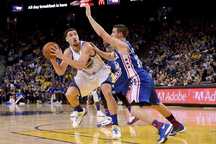 Golden State vann skyldusigur á lélegasta liði deildarinnar Kristinn Páll Teitsson skrifar 28. mars 2016 11:00 Klay var funheitur í nótt. Vísir/Getty Golden State Warriors vann í nótt skyldusigur á Philadelphia 76ers á heimavelli en þetta var 35. sigur liðsins í röð á heimavelli á þessu tímabili. Golden State hefur unnið 66 leiki af 73 og stefnir þessa dagana á að bæta með Chicago Bulls frá árinu 1996 þegar Bulls-liðið vann 72 leiki, met sem stendur enn í dag tuttugu árum síðar. Var því hægt að tala um skyldusigur fyrir eitt besta lið deildarinnar gegn því lélegasta en gestunum tókst að halda í við Golden State á upphafsmínútum leiksins. Í öðrum leikhluta settu heimamenn hinsvegar í gír og náðu sextán stiga forskoti en eftir það var sigurinn aldrei í hættu og lauk leiknum með 12 stiga sigri Golden State. Klay Thompson var stigahæstur í liði heimamanna með 40 stig en þetta var annar leikurinn í röð sem hann endaði með 40 stig. Draymond Green lauk leiknum með þrefalda tvennu, 13 stig, 11 stoðsendingar og 11 fráköst en besti leikmaður deildarinnar, Steph Curry, hafði hægt um sig með 20 stig.DeAndre setur hér niður tvö af sextán stigum sínum í nótt.Vísir/gettyÞá tryggði Los Angeles Clippers sæti sitt í úrslitakeppninni með 105-90 sigri á Denver Nuggets á heimavelli í gær. Liðið lék áfram án Blake Griffin sem tekur þessa dagana út leikbann en hann er að stíga upp úr meiðslum eftir að hafa ráðist á einn af starfsmönnum liðsins. Clippers setti Griffin í fjögurra leikja bann eftir að í ljós kom að hann meiddist á hönd við að lemja starfsmann Clippers-liðsins eftir tapleik liðsins í Toronto. Hefur hann ekki tekið þátt í leik með liðinu undanfarna tvo mánuði. DeAndre Jordan átti enn einn stórleikinn í gær en hann var stigahæstur í liði með Los Angeles Clippers með 16 stig ásamt því að taka 16 fráköst og verja 6 skot. Hér fyrir neðan má sjá helstu tilþrif kvöldsins og öll úrslit leikjanna í nótt.Úrslit kvöldsins: Los Angeles Clippers 105-90 Denver Nuggets Indiana Pacers 104 -101 Houston Rockets Sacramento Kings 133-111 Dallas Mavericks Golden State Warriors 117-105 Philadelphia 76ers Los Angeles Lakers 88-101 Washington WizardsBestu tilþrif gærkvöldsins: Klay var funheitur í nótt: Paul George hafði betur gegn Harden: NBA Mest lesið Sakaður um svindl á HM í pílukasti Sport Dómarinn hlýtur mikið lof fyrir stundarbræði í garð Jake Paul og Joshua Sport Sjáðu geggjaðan snúning Alberts áður en hann skoraði frábært mark Fótbolti Hættur aðeins þrítugur Golf Bunting dró orð sín til baka með tárin í augunum: „Ég er ekki meistari fólksins“ Sport Áfallið staðreynd og Isak búinn í aðgerð Enski boltinn Pílukastarinn biðst afsökunar á að hafa fallið á lyfjaprófinu og öllum lygunum Sport Ótrúleg tíðindi á HM í pílukasti: „Mikið sjokk“ Sport Gleði og sorg í sigri Liverpool Enski boltinn Ronaldo á nærbuxunum lætur Elon Musk efast um sjálfan sig Fótbolti Fleiri fréttir Stórstjarna úr WNBA-deildinni í heimsókn á Íslandi ÍR-ingar bæta við sig reyndum og hittnum Króata Í bann fyrir að kasta flösku í barn Hjalti Þór ráðinn aðalþjálfari Álftaness Kolbrún María kom við sögu í endurkomu Hannover Næstframlagshæstur í grátlegu tapi Fékk næstum 4,5 milljóna króna sekt fyrir að sýna dómara fingurinn „Komum eins og aumingjar inn í þennan leik“ „Jólasteikin mun bragðast betur í ljósi þessa sigurs“ Stjarnan - Álftanes 108-104 | Unnu grannaslaginn naumlega Uppgjörið: Ármann - ÍA 102-83 | Ármann náði í gríðarlega mikilvæg stig í fallbaráttunni með sigri gegn Skagamönnum Jokic tók NBA-met af Abdul-Jabbar í nótt KR á frábærum stað en getur ekki unnið titilinn Útilokar ekki breytingar: „Er klárlega að líta í kringum mig“ Uppgjörið: Keflavík - Njarðvík 93-83 | Enn taplausir í Sláturhúsinu „Ánægður að spila ekki betur en þetta en vinna samt“ „Svo lengi sem það er ekki jákvæð og góð umfjöllun um okkur erum við sáttir“ „Hefðum þurft að hafa heppnina með okkur í liði“ ÍR - Valur 82-85 | Baráttusigur í Breiðholti „Sáttur að geta farið heim, borðað vel og fengið mér nokkra kalda“ Tindastóll - KR 130-117 | Kláruðu gestina í seinni hálfleik Þór Þ. - Grindavík 94-106 | Baráttusigur gegn löskuðu liði Þórs Liðsfélagar Guðbjargar ekki fæddir þegar hún spilaði fyrsta leikinn Þola þeir ekki gott umtal? „Helmingur minna leikmanna skilur ekki íslensku“ „Ef við hefðum ekki verið að setja þessi skot þá hefðum við skíttapað“ KR á toppinn Uppgjörið: Grindavík - Haukar 92-93 | Fullkomin jólagjöf Spilaði 13 mínútur en var stigahæstur Rýndu í gamlar myndir: „Svakalega ertu kringlóttur í framan“ Guðbjörg fyrsta konan í fjögur hundruð leikina Sjá meira
