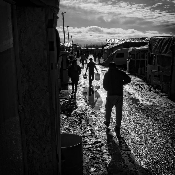 Yohannes horfir yfir Ermarsundið til Englands, aðeins 33 kílómetra í burtu – áfangastaðinn eftir 6.000 km ferðalag heiman frá Erítreu, gegnum stríðshrjáð Súdan, Líbíu, þar sem ISIS ræður yfir stórum hluta landsins, síðan yfir Miðjarðarhafið til Ítalíu og áfram gegnum Frakkland. Sex mánaða ferð, síðan fastur hér í Calais síðustu þrjá mánuðina. Einn af 7.500 flóttamönnum sem búa hér í The Jungle, eins og flóttamannabúðirnar í Calais eru kallaðar. Flóttamannabúðir sem Frakkar vilja losna við, og eru þegar byrjaðir að brytja niður, rífa með stórvirkum vinnuvélum, með aðstoð þungvopnaðra lögreglumanna. Það var skítkalt, skúrir og fjórar gráður, þegar ég sté mín fyrstu skref inn í búðirnar nú í byrjun mars. Þvílík drulla, var það fyrsta sem kom upp í hugann. Og í svaðinu hefur fólk komið sér upp húsaskjóli úr plastdúk strekktum á auma timburgrind, með móður jörð, mold og drullu oftast sem gólf. Þarna var líka kirkja, matsölustaðir og sjoppur sem seldu dósamat, sígarettur í stykkjatali, tannkrem og túrtappa. Og þvottahús fyrir kropp og sál, sem reyndar brann síðasta daginn minn í helvíti.Lögreglumenn passa upp á að gröfur fái að jafna búðirnar við jörðu.Það voru fáir, mjög fáir, á ferli þennan fyrsta morgun. Fáeinir sjálfboðaliðar, flestir breskir, og svo nokkrir ljósmyndarar og blaðamenn, öllum kalt. En nóttina áður höfðu verið róstur og kveikt var í húsum, ef hús mætti kalla þessi skrifli, áður en lögreglan næði að moka þeim burt með skurðgröfum.Allan, ungur franskur ljósmyndari fyrir AP-fréttaveituna, var mættur eins og hann hafði gert síðustu 80 daga. „Ég ætla í langt frí, þegar ég verð leystur af eftir tíu daga. Ég er alveg búinn á sálinni. Að horfa upp á þessa eymd, dag eftir dag, hitta þetta fólk sem var að flýja herkvaðningu, loftárásir og jarðsprengjur heima fyrir. Og þetta er það sem Evrópa býður upp á. Held að Evrópusambandsbóndi gæti ekki, fengi ekki að setja framleiðsluna á markað, yrði kærður fyrir dýraníð, ef hann færi svona með dýrin sín, gæfi þeim þá aðstöðu og aðbúnað sem þessu fólki er boðið upp á hér í hjarta Evrópu.“Og þá mættum við Yohannes, innvöfðum í rakt teppi, með klút fyrir andlitinu, í blautum skóm, með tannbursta að vopni. Hann var á leið í eina af þremur stöðvum, þar sem hann gat náð sér í vatn í morgunteið, burstað tennurnar og þvegið stírurnar úr augunum og hendurnar. „Já, mér er kalt inn að beini, svaf varla dúr í nótt, fyrst vegna hávaða vegna barnings við lögguna, síðan út af tannaglamri, ég skalf svo úr kulda.“ Hundrað metra frá búðunum, þar sem við stöndum, eru glæsihús Calais-búa, hlý og hlýleg í morgunbirtunni.Þessir strákar, nýkomnir alla leið frá Afganistan, reisa sér húsaskjól á besta stað í bænum, við aðalgötuna inn í bæinn.Yohannes er hinn týpíski íbúi þessarar 5.000 manna borgar, karlmaður um þrítugt, fæddur og uppalinn utan Evrópu. Og þetta er fjölbreyttur og síbreytilegur hópur. Nú í mars eru Kúrdar frá Írak fjölmennastir, annar stærsti hópurinn kemur frá afríska horninu; Erítreu og Sómalíu. Afganar eru líka nokkuð fjölmennir og virðast yngri, allt niður í börn, sem hafa komist allar þessar þúsundir kílómetra gegnum Íran, Írak, og Sýrland hingað að Ermarsundinu, ein. Konur og börn eru um þriðjungur, en þau eru minna á ferðinni í þessari drullu og kulda. Halda sig heima.Frakkland hefur sloppið vel við flóttamannaflóðbylgjuna miðað við stóru Evrópuþjóðirnar. Á síðasta ári, sóttu 79 þúsund um hæli þar, hundrað þúsund færri en komu til Svíþjóðar, og milljón færri en komu til Þýskalands, á sama tíma. „Hér vil ég ekki vera. Ég hef komist þrisvar inn í vöruflutningabíl eftir ótal tilraunir til að komast yfir,“ segir Yohannes. „Löggan hefur handtekið mig í öll skiptin og síðan sleppt mér. Ég gefst ekki upp, ég ætla mér yfir. Þar eru tveir vinir mínir hólpnir. Annar meira að segja kominn í svarta vinnu, í Leeds. Ég tala hvorki frönsku eða þýsku. Þarna hinum megin get ég allavega bjargað mér, byrjað nýtt líf.“En það getur verið þrautin þyngri að komast yfir. Frakkar og Bretar hafa víggirt alla vegi sem liggja að göngunum. Landamærin rétt norðar, að Belgíu, eru meira að segja undir ströngu eftirliti. „Ég þekki einn afganskan strák, hér í næstu götu, sem hefur náð 30 sinnum að laumast inn í trukk til að komast yfir. Hann hefur alltaf náðst, en hann ætlar sér yfir, þrátt fyrir að hafa misst sinn besta vin, sem kafnaði undir Ermarsundinu.“ Já, hinum megin er fyrirheitna landið. Yohannes horfir hátt, og segir: „Hér er ekkert nema drulla og vosbúð, en himinninn er eins og heima.“ Stundum velti ég fyrir mér hvort hann hafi komist yfir, komist einhvern tíma yfir. Og allir hinir. Og ekki hjálpa þessu vesalings fólki árásirnar í Brüssel á dögunum. Margir setja alla flóttamenn undir einn hatt, hatt haturs og hryðjuverka.