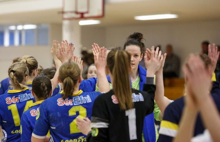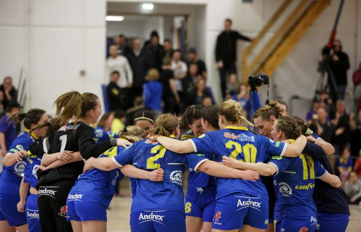 Umfjöllun, viðtöl og myndir: Grótta - Fram 21-16 | Grótta í úrslit eftir öruggan sigur Kristinn Páll Teitsson skrifar 27. apríl 2016 22:00 Lovísa Thompson fagnar sæti í úrslitunum í kvöld. Vísir/Ernir Grótta vann afar sannfærandi fimm marka sigur á Fram 21-16 og bókaði um leið sæti sitt í úrslitum Olís-deildar kvenna í handbolta í kvöld.Ernir Eyjólfsson, ljósmyndari Vísis og Fréttablaðsins, var á leiknum í kvöld og náði þessum skemmtilegu myndum hér fyrir ofan. Þetta verður annað árið í röð sem Grótta leikur til úrslita og hafa Seltirningar titil til að verja í úrslitunum. Ólíkt fyrri leikjum liðanna í þessu einvígi voru Gróttukonur einfaldlega mun sterkari allt frá fyrstu mínútu og leiddu með fjórum mörkum í hálfleik 10-6. Í seinni hálfleik náði Fram aldrei að ógna forskoti Gróttu en Seltirningar voru klaufar og nýttu ekki færin til þess að gulltryggja sigurinn fyrr en á lokamínútum leiksins. Gróttukonur sem eru ríkjandi Íslandsmeistarar voru í ansi vænlegri stöðu fyrir leik kvöldsins en sigur kom liðinu í úrslitaleikinn eftir tvo nauma sigra í fyrstu leikjum einvígisins. Höfðu úrslitin ekki ráðist fyrr en á lokamínútunum í fyrstu tveimur leikjunum en það sama var ekki upp á teningunum í kvöld. Framarar voru einfaldlega skrefinu á eftir fyrstu mínúturnar, sóknarleikur liðsins gekk ekki nægilega vel og var Grótta með frumkvæðið framan af. Komust Seltirningar í 4-1 á fyrstu tíu mínútum leiksins en þá tóku Framkonur við sér. Tókst þeim að minnka muninn í 7-6 þegar skammt var til leiksloka í fyrri hálfleik með Guðrúnu Ósk Maríasardóttir í miklu stuði í markinu en lokamínútur fyrri hálfleiks reyndust liðinu erfiðar. Tókst Gróttu að bæta við forskotið á lokamínútum fyrri hálfleiks og tóku þær fjögurra marka forskot inn í hálfleikinn ásamt því að leika manni fleiri upphafsmínútur seinni hálfleiks. Framkonum tókst að saxa á forskot Gróttu á upphafsmínútum seinni hálfleiks og koma forskotinu niður í tvö stig í stöðunni 12-10 eftir tíu mínútur en við tóku fjögur mörk í röð frá Gróttu. Grótta fékk svo sannarlega færin til að gera út um leikinn snemma í seinni hálfleik en liðinu gekk bölvanlega að nýta þann fjölda hraðaupphlaupa og vítakasta sem liðið fékk í seinni hálfleik. Náðu Framkonur því að hanga inn í leiknum allt til lokamínútu leiksins en sigurinn var aldrei í hættu í seinni hálfleik. Fögnuðu Seltirningar sigrinum að lokum 21-16 og bókuðu um leið sæti sitt í úrslitum annað árið í röð. Íris Björk Símonardóttir fór á kostum í marki Gróttu í kvöld en hún varði alls 29 skot, þar af eitt vítakast af 43 (67% markvarsla). Þórey Anna Ásgeirsdóttir var markahæst í liði Gróttu með sex mörk en Sunna María Einarsdóttir bætti við fimm mörkum. Í liði Fram var Ragnheiður Júlíusdóttir atkvæðamest með sex mörk en aðrir leikmenn náðu sér ekki á strik í dag. Guðrún Ósk náði ekki sömu hæðum í seinni hálfleik og var skipt af velli um miðjan hálfleikinn. Hafdís Lilja Torfadóttir kom af krafti af bekknum í mark Framara og varði 8 skot af 14 (57% markvarsla) í seinni hálfleik. Íris Björk: Erum með leikmenn sem eru engin unglömb og þurfa hvíld„Við vorum að spila á móti gríðarlega góðu liði og ég er hrikalega montin af því að við höfum náð að klára þetta í þremur leikjum,“ sagði Íris Björk Símonardóttir, markvörður Gróttu, að leikslokum í kvöld. „Það er ekkert grín að vinna Fram þrjá leiki í röð en loksins mættum við í leik eins og við eigum að mæta í alla leiki. Við þurfum að líta til baka í undirbúninginn og reyna að endurtaka það því það var annað lið sem mætti í kvöld og í fyrstu tvo leikina.“ Grótta náði að snúa stöðunni úr 7-6 í 10-6 á lokamínútum fyrri hálfleiks en þær hleyptu Fram aldrei aftur inn í leikinn eftir það. „Varnarmennirnir hjá okkur voru eins og ljón í kvöld og ég hefði ekki viljað mæta þeim. Alltaf þegar þær komu í áttina að markinu voru þær einfaldlega lamdar og við þurfum áframhald á þessu. Fyrir vikið hafði ég það nokkuð gott fyrir aftan svona vörn sem klukkar alla leikmenn.“ Íris tók undir að Gróttukonur hefðu getað klárað leikinn mun fyrr. „Markmenn Fram voru að verja eins og berserkir úr bestu færunum okkar bæði í þessum leik og öllu einvíginu. Það er eitthvað sem má skoða betur en það var stígandi í þessu í kvöld,“ sagði Íris sem var ekki á því að hún þyrfti að kenna hornamönnunum sínum að klára færi. „Veistu, ég held að ég gæti það ekki. Ég var nú einu sinni í hægra horninu og þótti ekki góð þannig ég leyfi þeim að sjá um þetta,“ sagði Íris með glott á vör. Íris fagnaði því að fá núna smá hvíld fyrir úrslitaeinvígið. „Við erum með nokkra leikmenn sem eru engin unglömb og það er gott að fá að komast aðeins niður á jörðina, slaka á og koma ferskar inn í úrslitaeinvígið.“ Ragnheiður: Þessar sendingar hjá Írisi eru einfaldlega grínRagnheiður bar sóknarleik Fram á herðum sér í kvöld en hún hleður hún í skot.Vísir/ernir„Við erum auðvitað grautfúlar. Hlutirnir duttu svolítið fyrir þær í fyrstu leikjunum en í dag áttum við einfaldlega ekki lausnir við varnarleiknum þeirra,“ sagði Ragnheiður Júlíusdóttir, skytta Fram, svekkt að leikslokum. „Þetta voru allt saman hörkuleikir en í dag hlaupum við ekki nóg til baka. Við erum ótrúlega fúlar að vera komnar í sumarfrí.“ Eftir naumt tap í fyrstu tveimur leikjunum var Fram einfaldlega skrefinu eftirá allan leikinn í kvöld. „Það er auðvitað þreytandi að tapa leikjum svona en við vorum ekkert þreyttari en Gróttuliðið í kvöld. Það var 