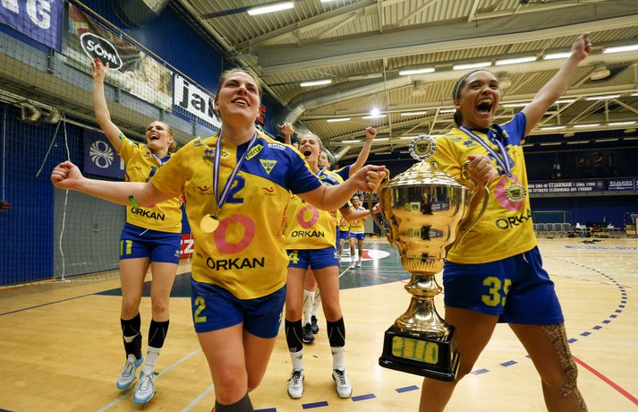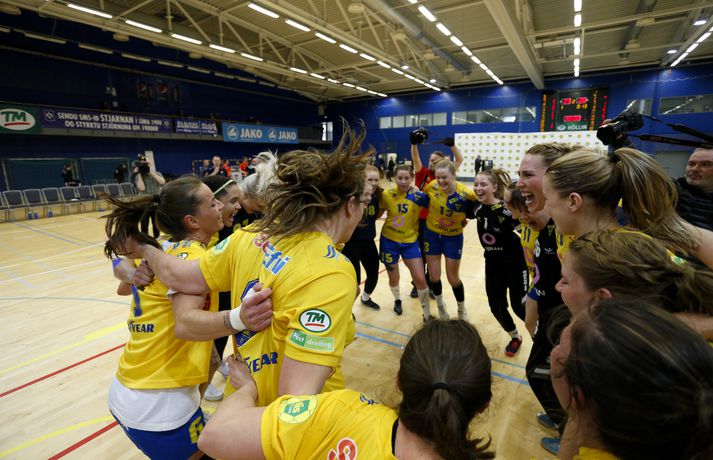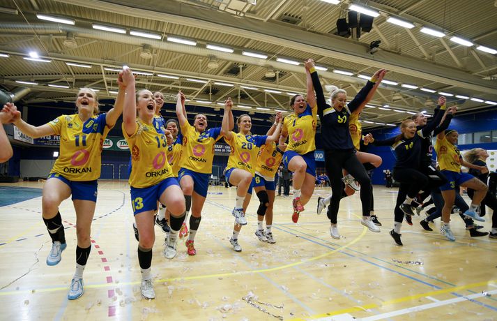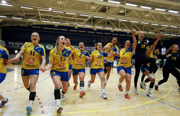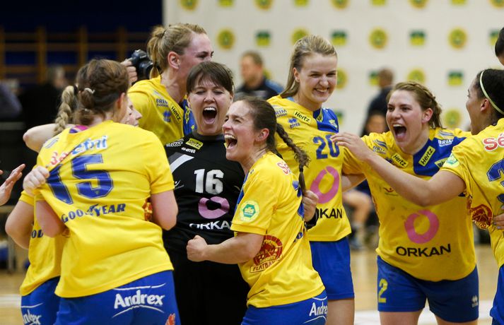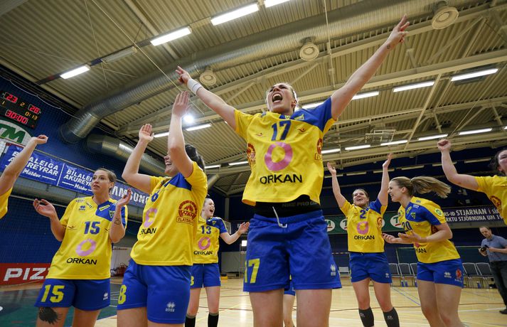 Umfjöllun, viðtöl og myndir: Stjarnan - Grótta 23-28 | Grótta Íslandsmeistari annað árið í röð Guðmundur Marinó Ingvarsson í TM-höllinni í Garðabæ skrifar 15. maí 2016 12:53 Lovísa Thompson brýst í gegnum vörn Stjörnunnar. vísir/anton brink Grótta tryggði sér Íslandsmeistaratitilinn í handbolta annað árið í röð í TM höllinni í Garðabæ þegar liðið vann fjórða leikinn gegn Stjörnunni 28-23 í úrslitum Olís deildar kvenna. Grótta mætti mjög ákveðin til leiks og lék við hvern sinn fingur. Liðið var sex mörkum yfir í hálfeik 17-11 en liði lék í senn öfluga vörn sem og frábæra sókn þar sem flest gekk upp. Stjarnan varð fyrir miklu áfalli þegar rétt innan við tvær mínútur voru til hálfleiks. Stórskyttan Helena Rut Örvarsdóttir fékk þá að líta beint rautt spjald. Sjö mörkum undir mátti Stjarnan illa við að missa sinn öflugasta sóknarmann. Úrslitin voru því nánast ráðin í hálfleik og Grótta féll ekki í þá gryfju að hægja á leiknum og fara að leika langar sóknir. Grótta hélt uppteknum hætti frá fyrri hálfleiknum og keyrði á Stjörnuna við hvert tækifæri og fyrir vikið komst aldrei spenna í leikinn í seinni hálfleik. Stjarnan skoraði sjö af átta síðustu mörkum leiksins eftir að Grótta hafði skipt byrjunarliði sínu útaf og því var sigurinn ekki eins stór og gangur leiksins gaf til kynna. Breiddin er meiri í liði Gróttu og áttu leikmenn liðsins hreinlega meira eftir til að ná eins góðum leik og raun bar vitni. Grótta sýndi svo ekki sé um villst að liðið er besta lið landsins í vetur. Íris Björk Símonardóttir fór á kostum fyrir aftan frábæra vörn liðsins og táningurinn Lovísa Thompson fór mikinn jafnt í vörn og sókn. Eftir síðasta leik liðanna var kvartað undan því að enginn leikmaður Gróttu tæki á skarið og svaraði Lovísa því með frábærum mörkum en hún var mjög áræðin í leiknum líkt og flestir samherjar hennar. Í raun lék allt lið Gróttu frábærlega í leiknum en nefna verður hið ótrúlega leikkerfi liðsins að fá línumanninn út til að stökkva upp og skjóta frá punktalínu. Anna Úrsúla Guðmundsdóttir er engum lík. Esther Viktoría Ragnarsdóttir leikstjórnandi Stjörnunnar byrjaði leikinn vel og þó Stjarnan hafi reynt allan leikinn sást á liðinu að það hafði ekki mikla trú á verkefninu eftir að Helena var send í sturtu. Vörn Stjörnunnar náði sér aldrei á strik og þó Florentina Stanciu hafi verið á bekknum kom hún aldrei við sögu í leiknum. Hún var enn meidd. Grótta horfði á eftir bikarnum til Stjörnunnar í vetur en annað árið í röð landaði liðið Íslandsmeistaratitlinum á heimavelli Stjörnunnar. Anna Úrsúla: Áttum harma að hefnaAnna Úrsúla Guðmundsdóttir var að fagna Íslandsmeistaratitlinum í sjötta sinn, tvö síðustu árin með uppeldisfélagi sínu Gróttu eftir góðan feril hjá Val. „Þetta var ofboðslega skemmtilegur dagur og það gekk í raun allt upp sem við settum upp,“ sagði Anna Úrsúla. „Við vissum að það yrði erfitt fyrir þær að mæta okkur, jafnvel þó þær hafi átt góðan leik á föstudaginn. Við áttum líka harma að hefna fannst okkur. Við vorum líka að hefna okkur fyrir bikarúrslitaleikinn.“ Leikurinn á föstudaginn sem Stjarnan vann minnta um margt á bikarúrslitaleik liðanna sem Stjarnan vann. „Við töluðum um það eftir síðasta leik að við færum ekki í færin til að skora heldur til bara til að fara í færi. Það hefur alls ekki einkennt okkur í úrslitakeppninni. „Það hafa allar farið ákveðnar í færin til að skora. Það lögðum við upp með í dag og það tókst mjög vel,“ sagði Anna. Leikmenn Gróttu voru gagnrýndir fyrir að hika í þriðja leiknum og stíga ekki upp þegar á reyndi. Allt annað var uppi á tengingum í dag. „Sú gagnrýni átti alveg rétt á sér. Gagnrýni er líka þannig að maður notar hana til að byggja sig upp.“ Eins og áður segir er þetta sjötti titill Önnu og annað árið í röð sem hún landar titlinum í TM höll Stjörnunnar. „Þetta er alltaf ótrúleg tilfinning. Þess vegna sækir maður í þetta. Þegar maður fær nasaþefinn af þessu þá heldur maður alltaf áfram. Það var það sem liðið gerði í dag. Liðið hafði reynsluna frá því í fyrra og sótti sigur,“ sagði sigurvegarinn Anna Úrsúla. Anna Úrsúla Guðmundsdóttir var að fagna Íslandsmeistaratitlinum í sjötta sinn, tvö síðustu árin með uppeldisfélagi sínu Gróttu eftir góðan feril hjá Val. „Þetta var ofboðslega skemmtilegur dagur og það gekk í raun allt upp sem við settum upp,“ sagði Anna Úrsúla. „Við vissum að það yrði erfitt fyrir þær að mæta okkur, jafnvel þó þær hafi átt góðan leik á föstudaginn. Við áttum líka harma að hefna fannst okkur. Við vorum líka að hefna okkur fyrir bikarúrslitaleikinn.“ Leikurinn á föstudaginn sem Stjarnan vann minnta um margt á bikarúrslitaleik liðanna sem Stjarnan vann. „Við töluðum um það eftir síðasta leik að við færum ekki í færin til að skora heldur til bara til að fara í færi. Það hefur alls ekki einkennt okkur í úrslitakeppninni. „Það hafa allar farið ákveðnar í færin til að skora. Það lögðum við upp með í dag og það tókst mjög vel,“ sagði Anna. Leikmenn Gróttu voru gagnrýndir fyrir að hika í þriðja leiknum og stíga ekki upp þegar á reyndi. Allt annað var uppi á tengingum í dag. „Sú gagnrýni átti alveg rétt á sér. Gagnrýni er líka þannig að maður notar hana til að byggja sig upp.“ Eins og áður segir er þetta sjötti titill Önnu og annað árið í röð sem hún landar titlinum í TM höll Stjörnunnar. „Þetta er alltaf ótrúleg tilfinning. Þess vegna sækir maður í þetta. Þegar maður fær nasaþefinn af þessu þá