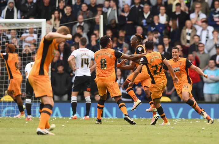 Hull í góðum málum gegn Derby Anton Ingi Leifsson skrifar 14. maí 2016 13:21 Leikmenn Hull fagna marki. vísir/getty Hull City er í kjörstöðu um að tryggja sér sæti í úrslitaleiknum um laust sæti í ensku úrvalsdeildinni eftir 3-0 sigur á Derby í fyrri leik liðanna. Hull, sem lék í úrvalsdeildinni á síðustu leiktíð, komst yfir með marki Abel Hernandez eftir hálftíma leik. Tíu mínútum síðar varð svo Jason Shackell fyrir því óláni að skora í sitt eigið mark og koma Hull í 2-0. Þannig stóðu leikar í hálfleik, en þriðja markið kom ekki fyrr en í uppbótartíma. Það gerði Andrew Robertson með skoti í uppbótartíma. Lokatölur 3-0. Þetta lítur rosalega vel út fyrir Hull fyrir síðari leik liðanna sem fer fram á þriðjuadginn. Sigurliðið mætir Brighton eða Sheffield Wednesday í úrslitunum um laust sæti, en fyrri leikur þeirra fór 2-0 fyrir Sheffield á heimavelli. Enski boltinn Mest lesið Áfallið staðreynd og Isak búinn í aðgerð Enski boltinn Einn leikmaður með samning og völlurinn ólöglegur Fótbolti Vildi tapa legg: „Mesti hávaði sem ég hef heyrt“ Sport Salah færði Egyptum draumabyrjun Fótbolti Körfuboltakvöld: Tilþrif tímabilsins til þessa Körfubolti Steraleikarnir segi ungu fólki að það sé aldrei nógu fullkomið Sport Hættur aðeins þrítugur Golf Afkáralegt fagn hjá hetju Sambíu Fótbolti Aron Einar lagði upp dýrmætt sigurmark Fótbolti Sagði látna systur sína hafa tryggt sigurinn ótrúlega Sport Fleiri fréttir Fulham skildi Forest eftir við fallsvæðið Áfallið staðreynd og Isak búinn í aðgerð Fagnaði titli Liverpool sem óður maður um alla borg „Allir virðast elska hann“ „Þetta mun ekki buga okkur“ Guardiola mun vigta leikmenn Man City eftir jólin „Ef þið væruð Antoine Semenyo, hvert mynduð þið fara?“ Sjáðu mörkin: Rogers sá um Manchester United Óttast að Isak hafi fótbrotnað Tvenna frá Rogers tryggði Villa sigur gegn Manchester United Fimmta sinn sem Arsenal er á toppnum um jólin: Unnu ekki titilinn í fyrstu fjögur skiptin „Viljum við að okkar verði minnst fyrir að vera skræfur?“ „Ef dómarinn hefði sinnt sínu starfi almennilega hefði Romero ekki fengið spjald“ Haaland gaf barnabarni Hareide gjöf Sjáðu mörkin úr enska: Sviptingar, sænskt þema og svakalegar tæklingar Calvert-Lewin hættir ekki að skora Gyökeres skaut Arsenal aftur á toppinn Slot fámáll um stöðuna á Isak Gleði og sorg í sigri Liverpool Dramatík er Broja reyndist hetja Burnley Haaland frábær er Manchester City komst á toppinn Andri Lucas skoraði í langþráðum sigri Blackburn Chelsea vann upp tveggja marka forskot á St James' Park Ekkert fararsnið á Guardiola sem segir að City verði að vera undirbúið Tíu bestu mörkin úr leikjum Liverpool og Tottenham Salah bað samherjana afsökunar Lineker fokillur við blaðamann: „Þvílíkt kjaftæði“ Skírði soninn LFC og Mac Allister lét draum feðganna rætast Jóga og pílates lykillinn að snöggri endurkomu Fantasýn: „Hann setti allt á 3 og það kom upp 19“ Sjá meira