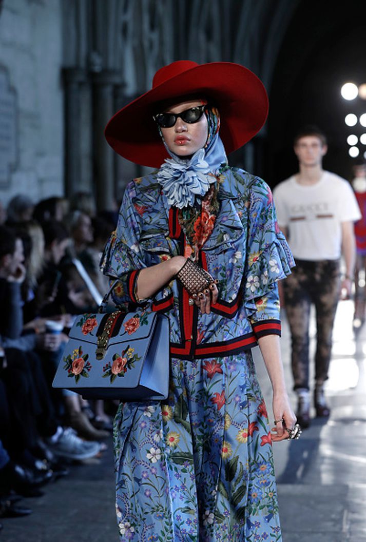 Blóm og stórar slaufur stóðu uppúr hjá Gucci Ritstjórn skrifar 2. júní 2016 22:15 Þetta er í fyrsta skiptið sem að tískusýning er haldin í þessari sögufrægu kirkju. Myndir/Getty Gucci sýndi cruise 2017 línuna sína í Westminister Abbey í London í dag við góðar viðtökur. Mikil spenna hefur verið fyrir sýningunni en þetta er í fyrsta skiptið tískusýning er sýnd í þessari sögufrægu kirkju. Alessandro Michele, yfirhönnuður Gucci, sagði að staðsetningin hafi skipt miklu máli fyrir línuna enda er hún innblásin af breskri menningu. Alessandro bjó lengi í London þegar hann byrjaði fyrst hjá fyrirtækinu fyrir næstum 15 árum en hann segist elska menninguna og fólkið. Línan einkennist af silkislæðum, blómamunstri, stórum jökkum, björtum og skemmtilegum litasamsetningum og að lokum pífum, sem er orðið eitt helsta einkennismerki Gucci frá því að Alessandro tók við fyrir næstum því tveimur árum. Fallega græn kápa með stórri rauðri slaufu og nælu. Stóru eyrnalokkarnir eru punkturinn yfir i-ið.Skemmtilegur laxableikur kjóll með pífum. Þessi stíll er orðinn einkennandi fyrir Gucci.Það var mikið um blómamunstur á sýningunni og ekki má gleyma Gucci beltunum.Falleg rauð loðkápa, silkiklútur í stíl, nóg af skartgripum og stór gleraugu. Einkennismerki Gucci.Blómamunstur og Gucci rendurnar passa vel saman.ASAP Rocky og Alexa Chung sátu á fremstu röð í Westminister AbbeySalma Hayek lét sig að sjálfsögðu ekki vanta. Mest lesið Veldu þínar uppáhaldssnyrtivörur Glamour Litrík götutíska í Berlín Glamour Justin Timberlake tjáir sig um galladressið fræga Glamour 80s glamúr en engin tónlist Glamour ,,Ég elska svart nælon þessa dagana." Glamour Kvenréttindi, velgengni og jafnréttisbaráttan Glamour Það eru allir æstir í Birki Bjarnason Glamour