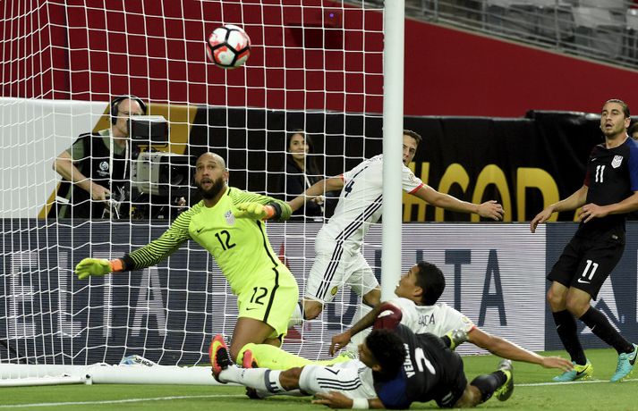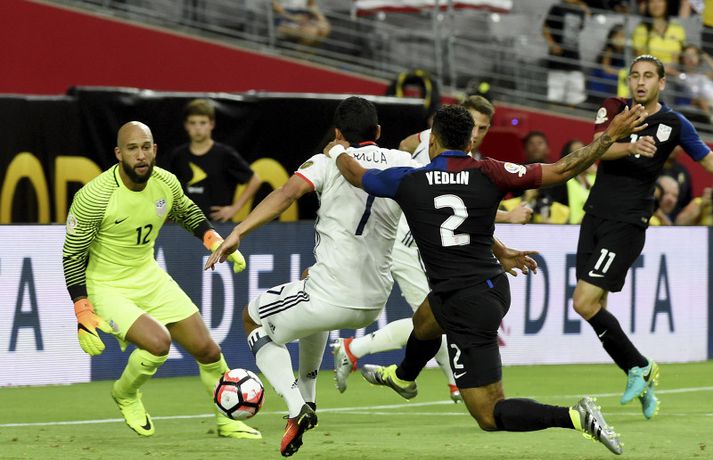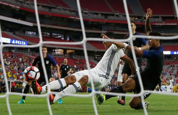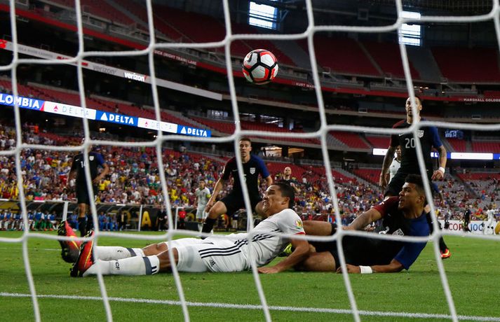Kólumbíumenn tryggðu sér bronsverðlaunin í Ameríkukeppninni eftir 1-0 sigur á Bandaríkjamönnum í leiknum um þriðja sætið í nótt. Bandaríska liðið stóð sig mun betur en í 4-0 tapi á móti Argentínu í undanúrslitunum eða í 2-0 tapi í fyrri leik þjóðanna í riðlakeppninni. Carlos Bacca, leikmaður AC Milan á Ítalíu, skoraði eina mark leiksins á 31. mínútu þegar hann batt endahnútinn á frábæra sókn kólumbíska liðsins. Juan Cuadrado fékk boltann út á kanti, sendi hann á James fyrir framan teiginn sem lyfti honum á Santiago Arias sem hafði stungið sér inn á vítateiginn. Santiago Arias skallaði boltann framhjá markverðinum og Carlos Bacca ýtti honum inn fyrir línuna. Frábær sókn og hún nægði til þess að tryggja Kólumbíumönnum bronsið og besta árangur liðsins í Ameríkukeppninni frá því að Kólumbía vann titilinn á heimavelli árið 2001. Þetta var líka langþráð mark enda náðu Kólumbíumenn ekki að skora í átta liða úrslitunum eða undanúrslitunum. Þegar Carlos Bacca kom boltanum yfir í marklínuna þá var kólumbíska liðið ekki búið að skora í 228 mínútur í keppninni. Bandaríkjamenn fengu vissulega færin til að þess að jafna metin. David Ospina varði frábæra aukaspyrnu frá Clint Dempsey í upphafi seinni hálfleik og Bobby Wood var líka nálægt því að skora. Í uppbótartíma fóru tvö rauð spjöld á loft; eitt á hvort lið, en Michael Orozco var rekinn af velli í uppbótartíma eftir að hafa fengið fyrra gula spjaldið sitt á 88. mínútu. Santiago Arias fékk svo gul spjöld í uppbótartíma hjá Kólumbíu og fór því einnig snemma í sturtu. Það er hægt að sjá þessa súpersókn Kólumbíumanna sem færði þeim bronsið hér fyrir neðan.Úrslitaleikur Argentínu og Síle fer fram í kvöld og verður í beinni á Stöð 2 Sport. Útsendingin hefst á miðnætti.Sigurmark Carlos Bacca