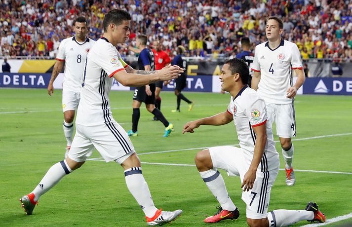 Ein súpersókn og Kólumbía tók bronsið | Sjáðu sigurmarkið Óskar Ófeigur Jónsson skrifar 26. júní 2016 11:00 Carlos Bacca fagnar sigurmarki sínu. Vísir/Getty Kólumbíumenn tryggðu sér bronsverðlaunin í Ameríkukeppninni eftir 1-0 sigur á Bandaríkjamönnum í leiknum um þriðja sætið í nótt. Bandaríska liðið stóð sig mun betur en í 4-0 tapi á móti Argentínu í undanúrslitunum eða í 2-0 tapi í fyrri leik þjóðanna í riðlakeppninni. Carlos Bacca, leikmaður AC Milan á Ítalíu, skoraði eina mark leiksins á 31. mínútu þegar hann batt endahnútinn á frábæra sókn kólumbíska liðsins. Juan Cuadrado fékk boltann út á kanti, sendi hann á James fyrir framan teiginn sem lyfti honum á Santiago Arias sem hafði stungið sér inn á vítateiginn. Santiago Arias skallaði boltann framhjá markverðinum og Carlos Bacca ýtti honum inn fyrir línuna. Frábær sókn og hún nægði til þess að tryggja Kólumbíumönnum bronsið og besta árangur liðsins í Ameríkukeppninni frá því að Kólumbía vann titilinn á heimavelli árið 2001. Þetta var líka langþráð mark enda náðu Kólumbíumenn ekki að skora í átta liða úrslitunum eða undanúrslitunum. Þegar Carlos Bacca kom boltanum yfir í marklínuna þá var kólumbíska liðið ekki búið að skora í 228 mínútur í keppninni. Bandaríkjamenn fengu vissulega færin til að þess að jafna metin. David Ospina varði frábæra aukaspyrnu frá Clint Dempsey í upphafi seinni hálfleik og Bobby Wood var líka nálægt því að skora. Í uppbótartíma fóru tvö rauð spjöld á loft; eitt á hvort lið, en Michael Orozco var rekinn af velli í uppbótartíma eftir að hafa fengið fyrra gula spjaldið sitt á 88. mínútu. Santiago Arias fékk svo gul spjöld í uppbótartíma hjá Kólumbíu og fór því einnig snemma í sturtu. Það er hægt að sjá þessa súpersókn Kólumbíumanna sem færði þeim bronsið hér fyrir neðan.Úrslitaleikur Argentínu og Síle fer fram í kvöld og verður í beinni á Stöð 2 Sport. Útsendingin hefst á miðnætti.Sigurmark Carlos Bacca Fótbolti Mest lesið Nýjar upplýsingar um heilsufar Michaels Schumacher Formúla 1 Heilbrigðisráðherra lætur óvin Íslands heyra það Handbolti Óvinur Íslands: „Aldrei stríða heilu landi“ Handbolti Þetta er ástæða þess að Ísland er í efsta sæti í milliriðlinum Handbolti Dramatísk úrslit og vonir beggja liða nánast úr sögunni Handbolti Ótrúleg saga Viggós rifjuð upp í erlendum miðlum Handbolti Dregur til baka ummæli sín um Gísla Þorgeir Handbolti Stærð sigurs Íslands gegn Svíum veki upp spurningar Handbolti Ánægðir með stælana í Hauki: „Sagði bara fokkaðu þér“ Handbolti Svíar furðu lostnir og of næs: „Létu pakka sér saman“ Handbolti Fleiri fréttir Kristall snýr aftur „þroskaðri og fullorðnari“ Sagðir borga 200 milljónir fyrir Kristal Mána Ekki gerst hjá Arsenal í átján ár Sjáðu draumamark Dorgu og öll hin í sigri United á Arsenal Hákon í leikbanni og Lille steinlá á heimavelli Orri sneri aftur eftir meiðsli Varamaðurinn tryggði United sigur gegn Arsenal Sjáðu Yamal skora „besta mark tímabilsins“ Tókst bara að jafna gegn tíu mönnum í toppslagnum Logi skoraði sjálfsmark í sigri Mikael Egill fagnaði endurkomusigri Aston Villa lifði af orrahríð fyrir norðan og náði Manchester City Heiðdís leggur skóna á hilluna Hlín utan hóps er Lehmann kom að marki í fyrsta leik Estevao með mark og stoðsendingu gegn lánlausu Palace liði Ásdís Karen lagði upp í öruggum sigri gegn botnliðinu Sjáðu alla dramatíkina úr enska boltanum Mbappé skaut Real Madrid upp í toppsætið Van Dijk segir að það hafi „klárlega verið brotið á sér“ í sigurmarkinu „Sigurmark undir lokin er fullkomið fyrir okkur“ Liverpool-vandræðin halda áfram og Bournemouth með sigurmark í blálokin Hákon framlengdi við Lille til 2030 Alberti og félögum mistókst að komast upp úr fallsæti Stórbrotið sigurmark hjá Harry Wilson Haaland fékk smá hvíld í kærkomnum sigri City Víkingur og Þróttur mætast í úrslitaleik Reykjavíkurmótsins Bayern tapaði deildarleik í fyrsta sinn á tímabilinu Alfons fer aftur til Hollands Elísa fer frá Val til Breiðabliks Hömruðu meðan járnið var heitt í sigri gegn Sunderland Sjá meira