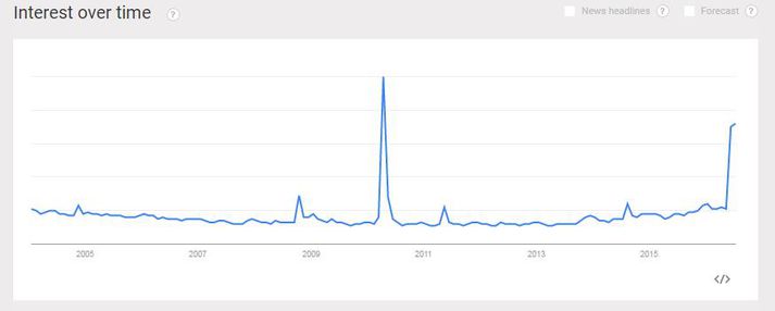 Áhugi á Íslandi í tengslum við EM, sá er sýnir sig á Google trends, slagar hátt í þann áhuga sem birtist í tengslum við gosið í Eyjafjallajökli í apríl 2010. Þá var Ísland í kastljósinu, ekki endilega í svo jákvæðu ljósi því gosið setti flugsamgöngur í algjört uppnám. Ýmsir hugsuðu Íslandi þá þegjandi þörfina. „Þetta er magnaður árangur,“ segir Hjörtur Smárason sem búsettur er úti í Danmörku en er sérfróður í kynningu landa og landsvæða; sérfræðingingur í alþjóðlegum viðskiptum. Sé horft á meðfylgjandi mynd, sem sýnir áhuga fólks á Íslandi miðað við hversu oft „Iceland“ er slegið inn á leitarvélina Google, má sjá nokkra hnjúka. „Guð blessi Ísland,“ sagði Geir H. Haarde þá forsætisráðherra í október 2008 – fjármálakerfið var hrunið.Tveir tindar og svo nokkrir hólar og jafnvel hnjúkar, sýna sig á þessu línuriti, sem gefur býsna glögga mynd af áhuga á Íslandi úti í hinum stóra heimi.Í maí 2011 gaus í Grímsvötnum og heimsbyggðin öll var í viðbragsstöðu. Síðan þá hefur kúrfan, sem sýnir þennan áhuga á Íslandi verið að mjakast uppá við og virðist þurfa minna til að ýta línuritinu uppá við í seinni tíð; einn tindurinn eru fréttir af Panamaskjölunum, en fjölmiðlar um heim allan fjölluðu um Panamaskjölin og félagið Wintris.Snjóplógasögur Línuritið tekur síðan kipp uppá við og slagar hátt í gosið á Eyjafjallajökli áhuginn á Íslandi sem augljóslega tengist frækinni frammistöðu íslenska karlalandsliðsins á EM.Hjörtur segir tímasetningu EM ákaflega heppilega eftir alla þá neikvæðu athygli sem Ísland fékk vegna Panamaskjalanna.„Sú landkynning sem Ísland hefur fengið vegna fótboltans er með ólíkindum og erfitt að meta til fjár. Sögur sem þessa kalla ég snjóplóga - sögur sem ná athygli fólks og fjölmiðla víða um heim og ryðja brautina fyrir aðrar sögur frá landinu. Við höfum séð marga fjölmiðla birta greinar um þetta undarlega og merkilega land Ísland. Þetta vekur forvitni sem við getum nýtt okkur,“ segir Hjörtur.Heppileg tímasetning eftir alla neikvæðu athyglina Hjörtur segir að Íslandsstofu og ferðaþjónustunni hafi í raun tekist framúrskarandi vel til eftir eldgosið í Eyjafjallajökli.Hjörtur segir athyglina sem Ísland hefur notið vegna EM algerlega ómetanlega.„Og, einstakt að svo lítið land sem Ísland fái aftur svona stórt tækifæri til landkynningar, og það með jákvæðri sögu í þetta skiptið. Tímasetningin er líka einstaklega heppileg eftir alla þá neikvæðu umfjöllun sem Ísland hefur fengið vegna Panamaskjalanna og hegðunar íslenskra stjórnmálamanna,“ segir Hjörtur sem rýndi í stöðu mála, hvað varðar Ísland og kynningarmálin, eftir þá háðung. „Við skulum vona að þessi árangur og jákvæða athygli sem landsliðið og ekki síst stuðningsliðið hefur fengið vegna áræðni, liðsheildar, prúðmennsku og íþróttamannslegrar hegðunar verði þingmönnum og landsmönnum öllum innblástur. Að vera þekktur fyrir þá hegðun sem Íslendingar hafa orðið frægir fyrir í fótboltanum er ómetanlegt.“